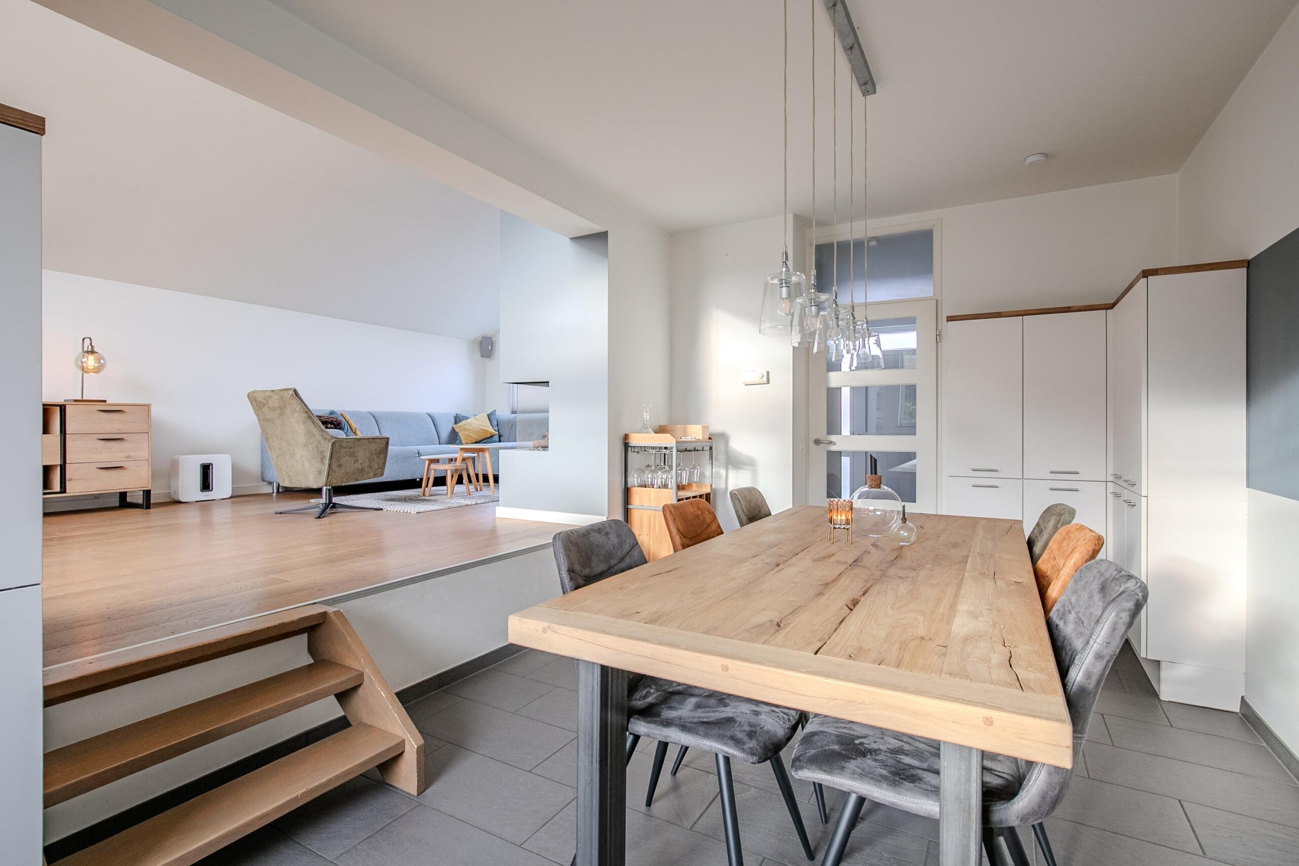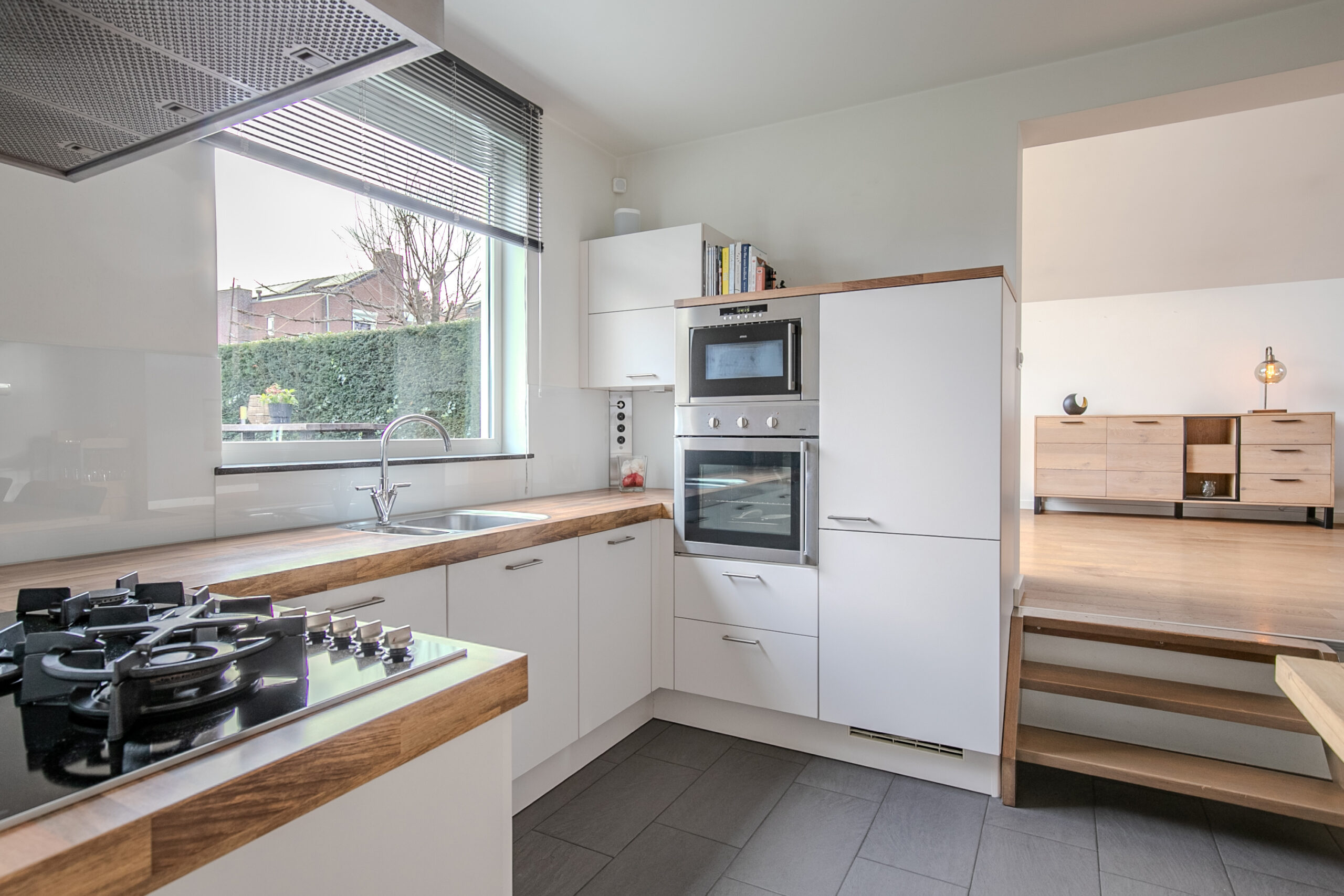 De speelse living kenmerkt zich door een niveauverschil en een hooggestoken plafond. De leefkeuken beschikt over een moderne witte installatie in U-opstelling met geïntegreerde siervitrinekast en is uitgerust met de volgende apparatuur: 5-pits gaskookplaat, glazen achterwand, RVS-afzuigkap, koelkast, oven, magnetron en vaatwasser (2024).