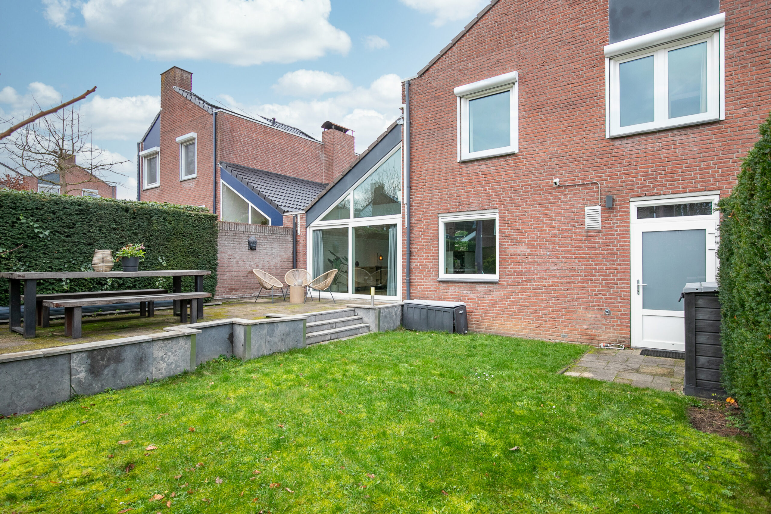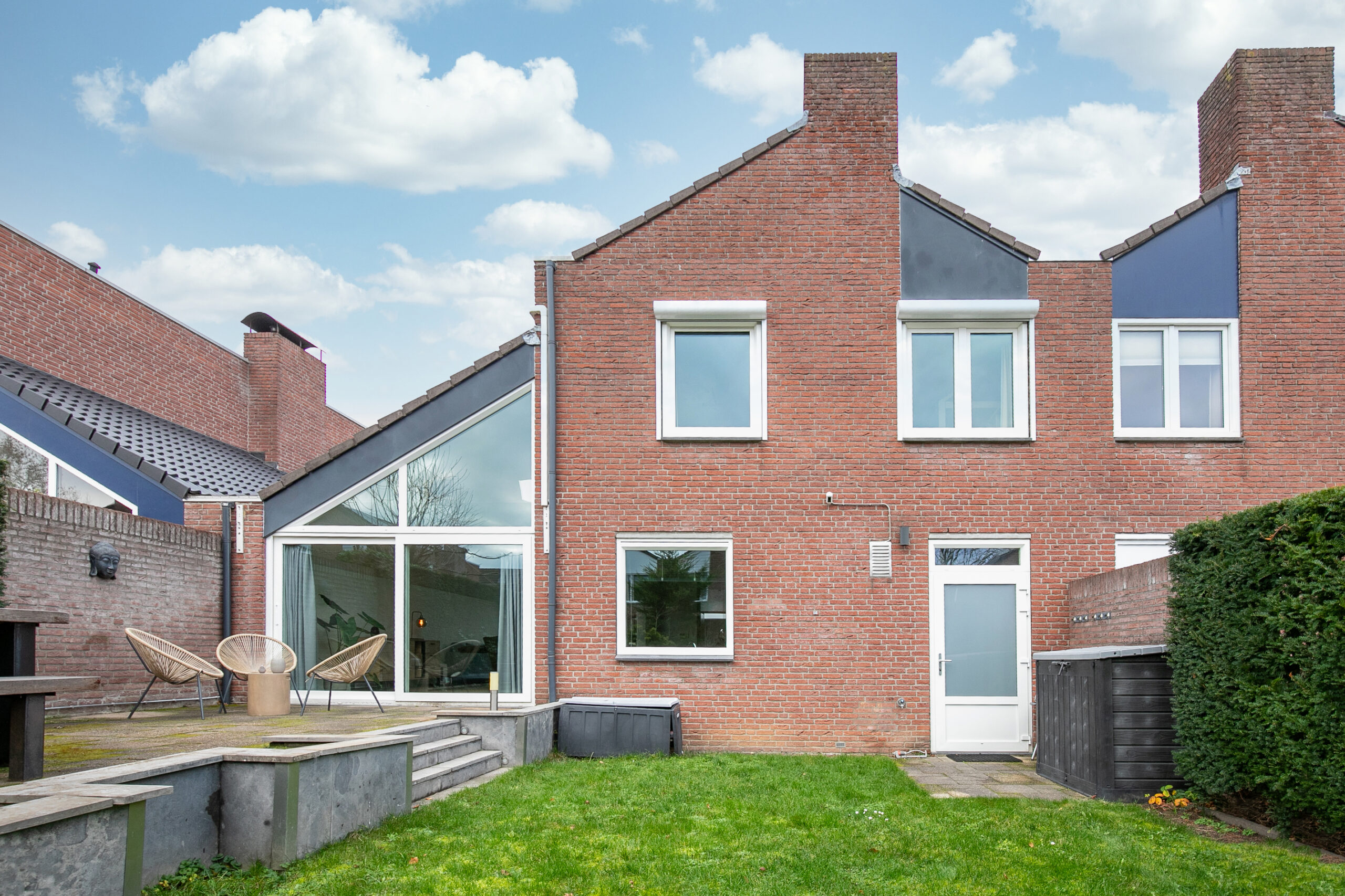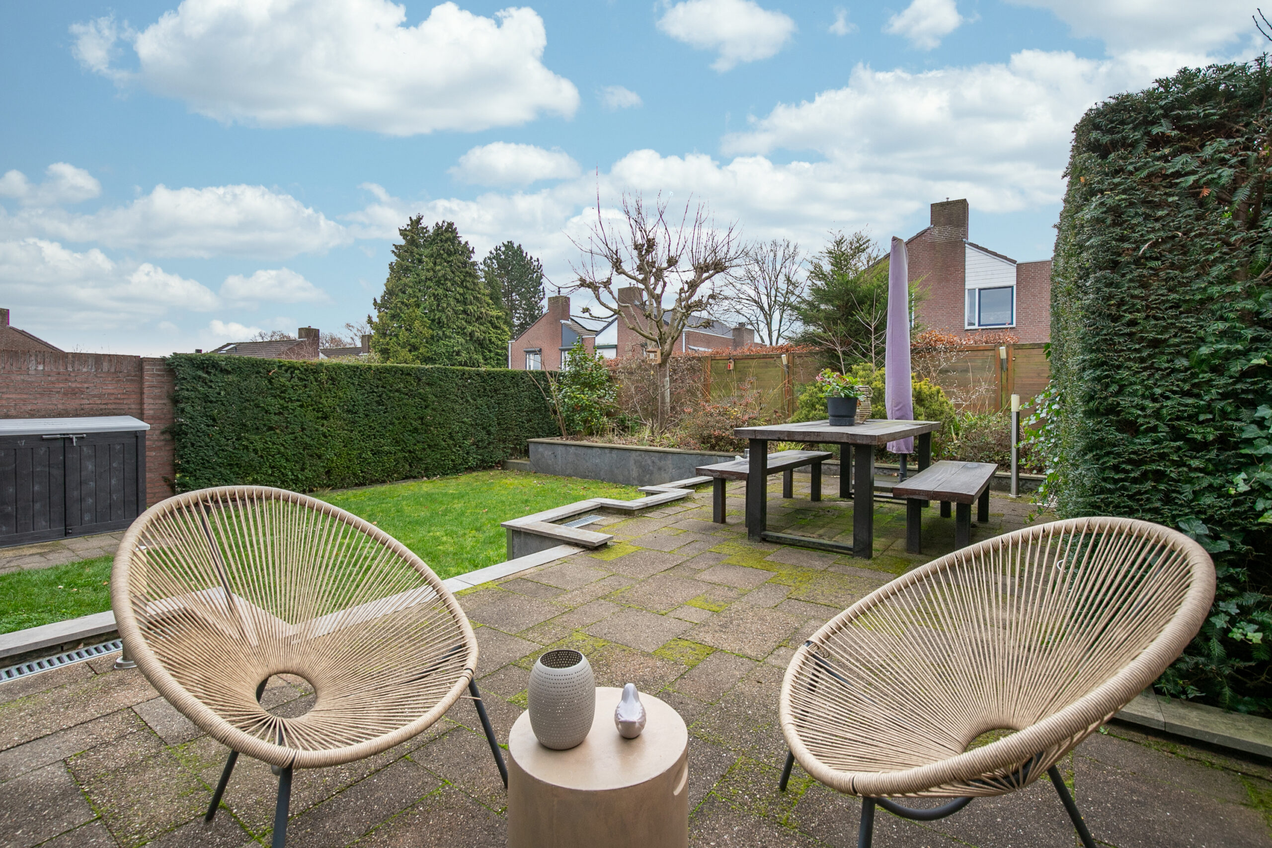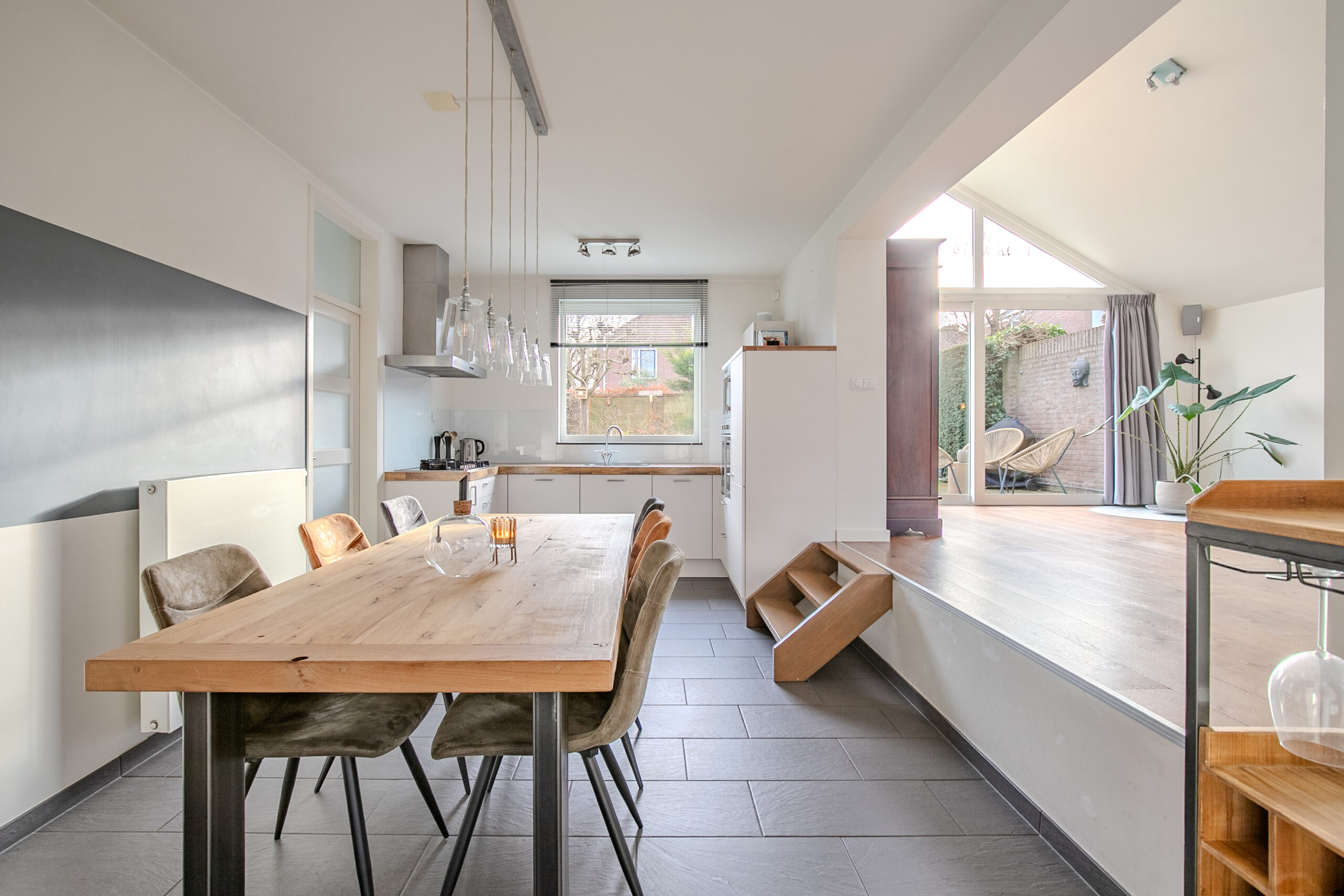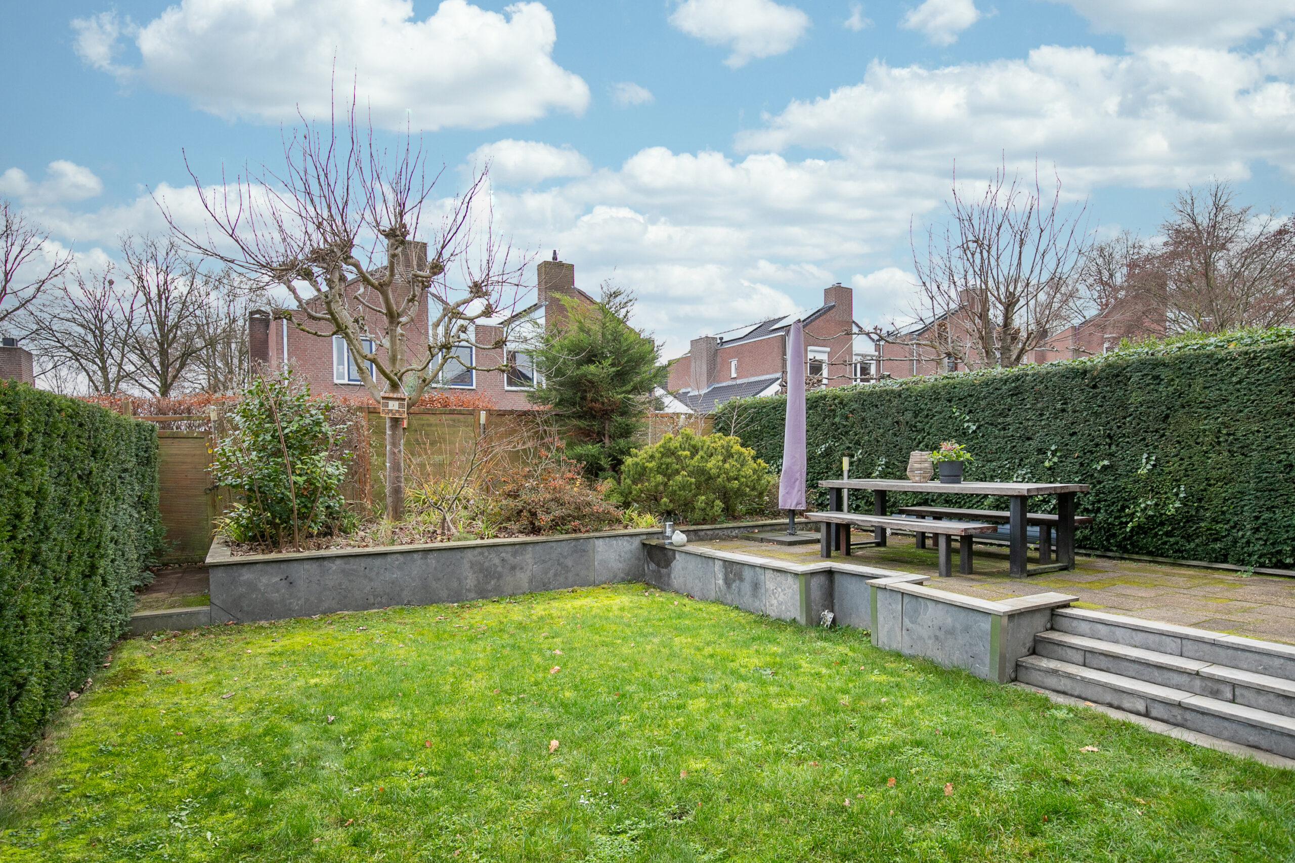 Via zowel de schuifpui als de bijkeuken bereikt u de geheel omsloten, op het zuiden gelegen en aangelegde tuin met niveauverschil en diverse terrassen.