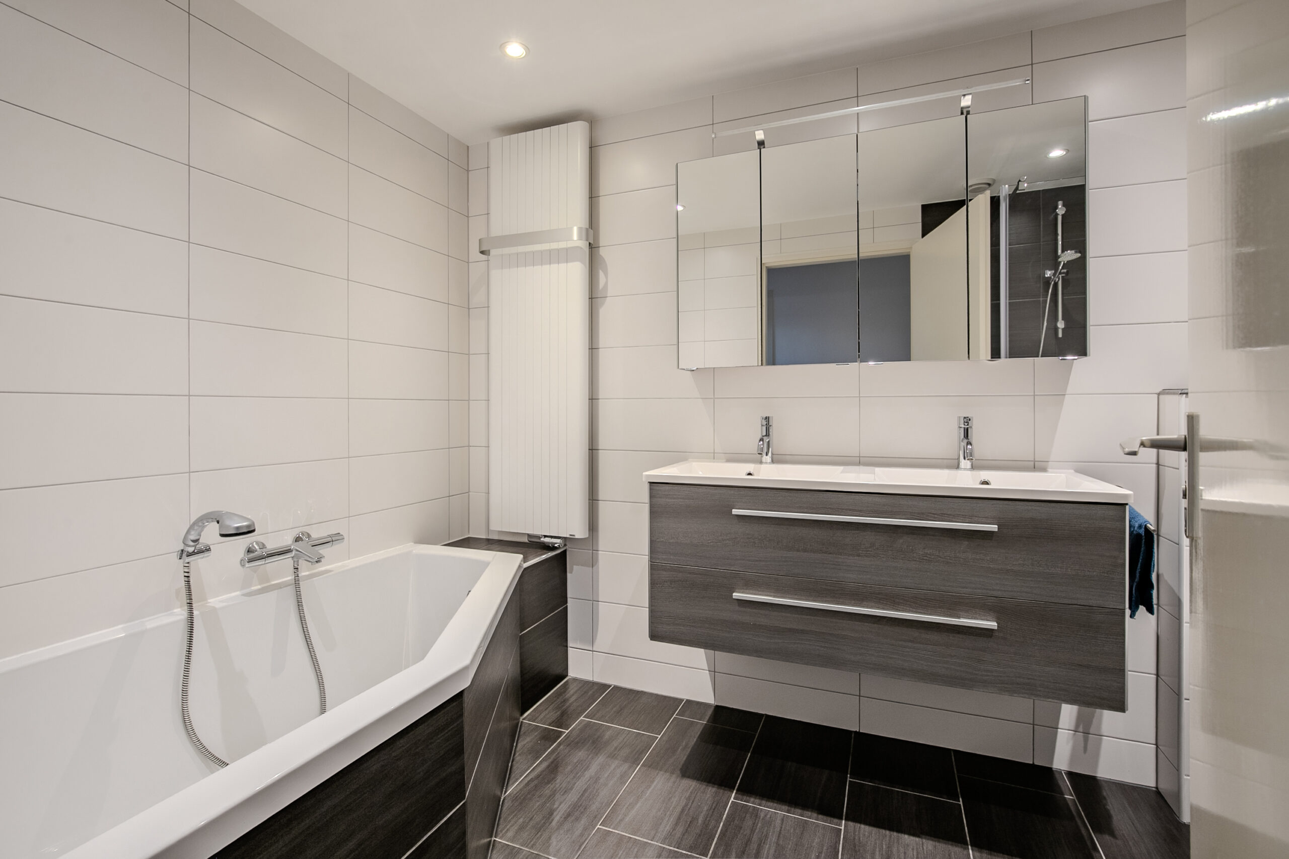 De luxe, geheel betegelde badkamer is uitgerust met een designligbad, dubbele wastafel met luxe ombouw, designradiator, tweede vrijhangend toilet, douche met thermostaatkraan, ingebouwde ledverlichting en mechanische afzuiging.