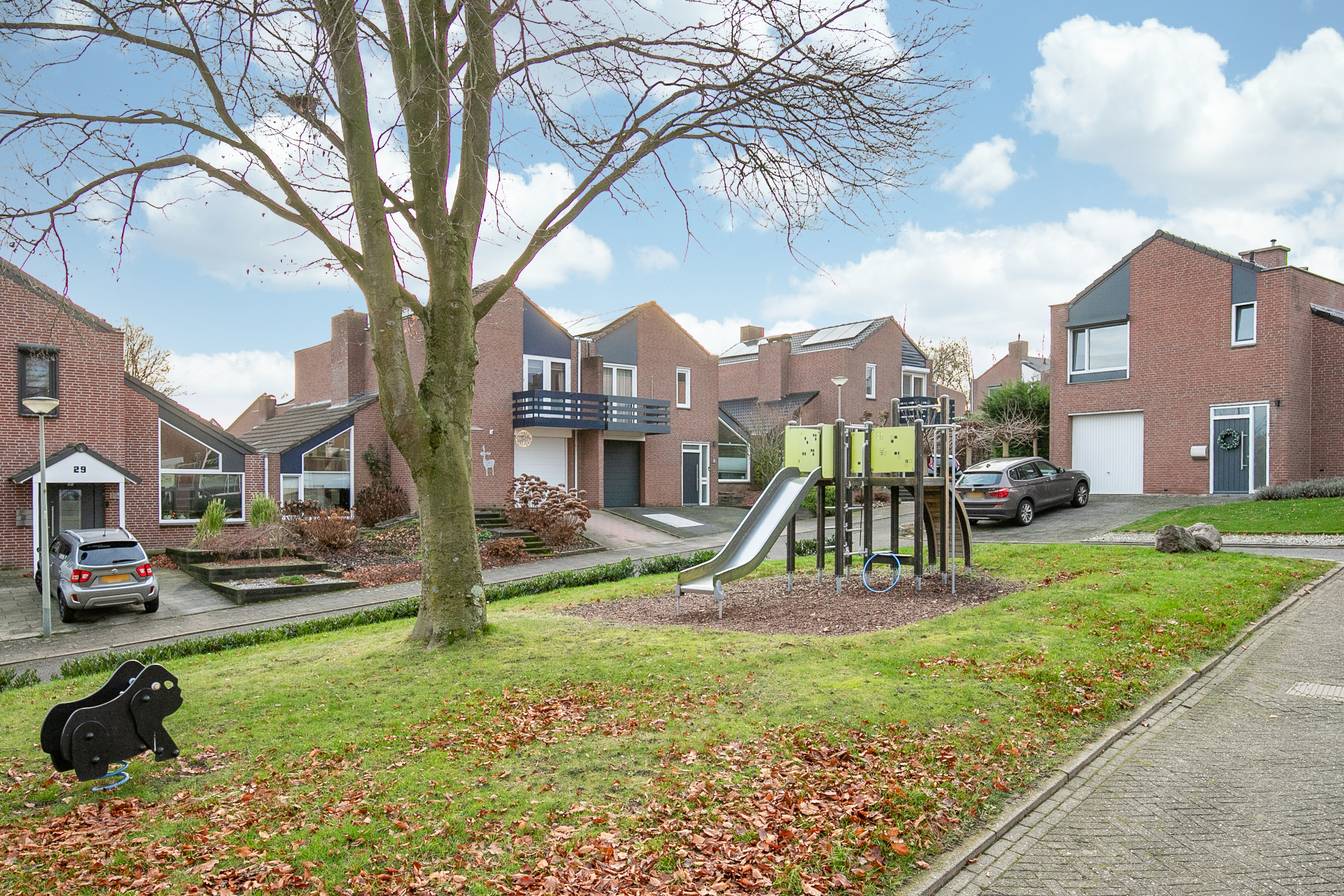 In een bevallige woonwijk, aan een plantsoen, ligt deze speelse halfvrijstaande geschakelde eengezinswoning met inpandige garage, berging, zolder en tuin, gelegen aan het Hoefveld 25 te Landgraaf / Nieuwenhagen / Hoefveld.