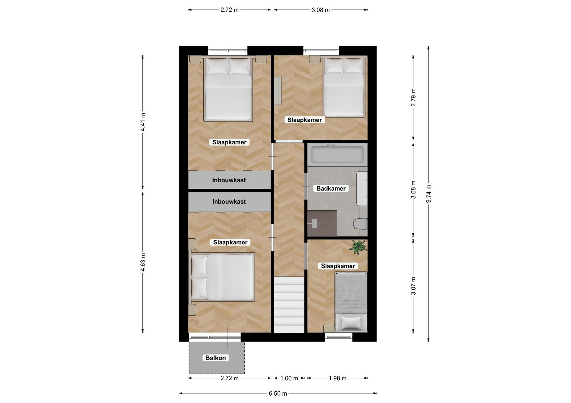 1) ca 12m² — beschikt over een fraai ingebouwde kast en een balkon aan de voorzijde met dubbele openslaande deuren.