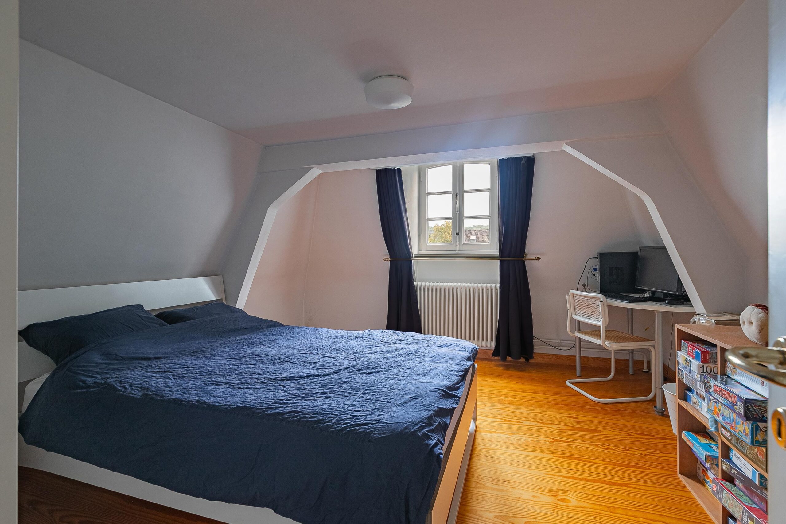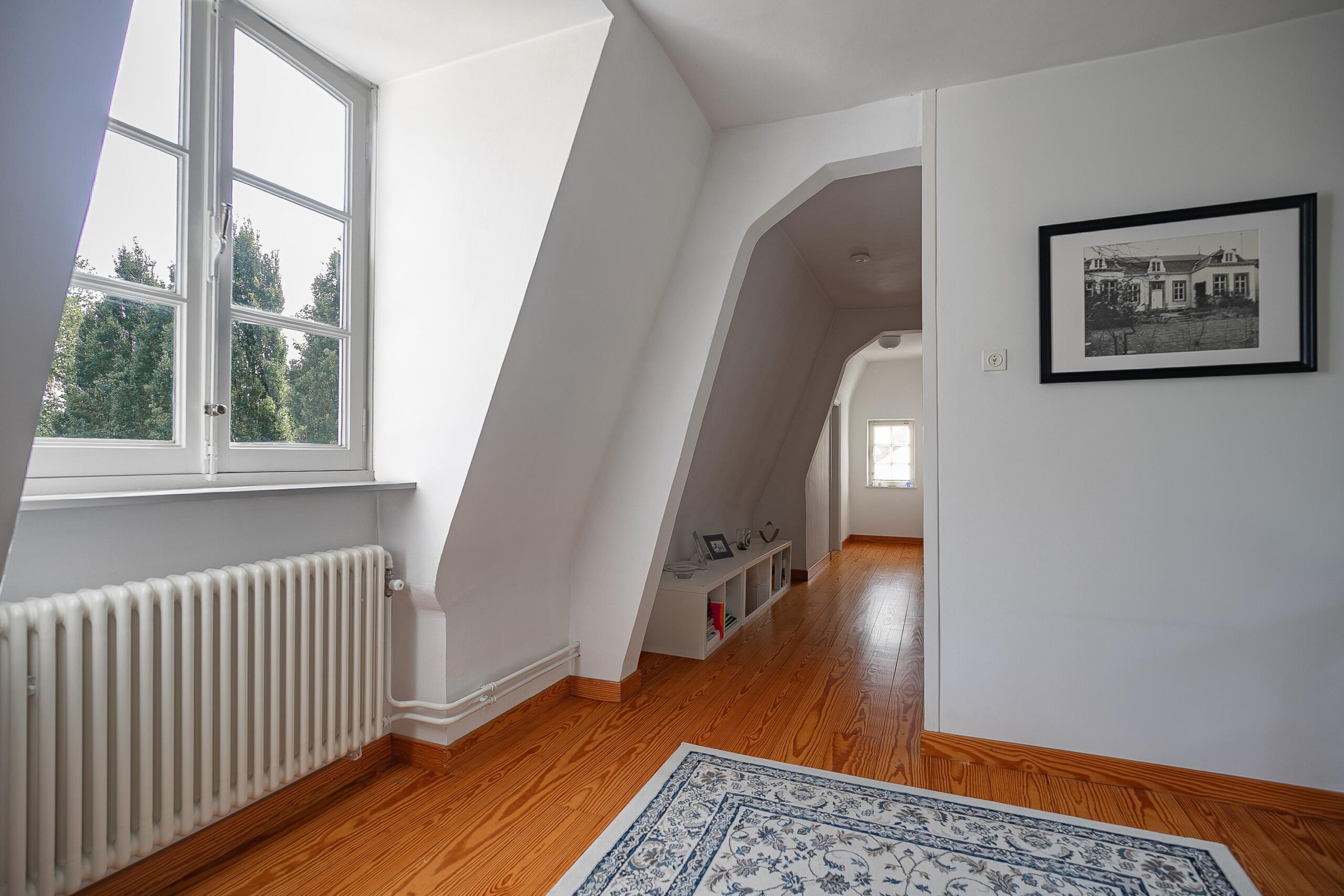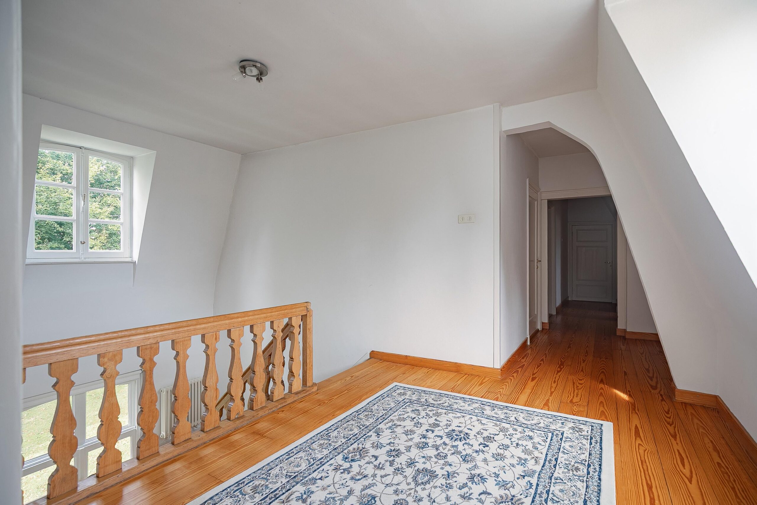 Prachtige overloop met veel lichtinval. Vier slaapkamers (resp. 16.8m², 16.2 m², 14.3m² en 12.9m²). Op één van de slaapkamers is een originele schouw, op één slaapkamer is een muurkast en op twee slaapkamers is een wastafel. Kleedruimte/inloopkast (ca. 16.2m²). Badkamer (ca. 8.5m²) met douche, wandcloset, badmeubel met twee wastafels en designradiator. Verder is er nog een opkamer (ca. 4.5m²).
