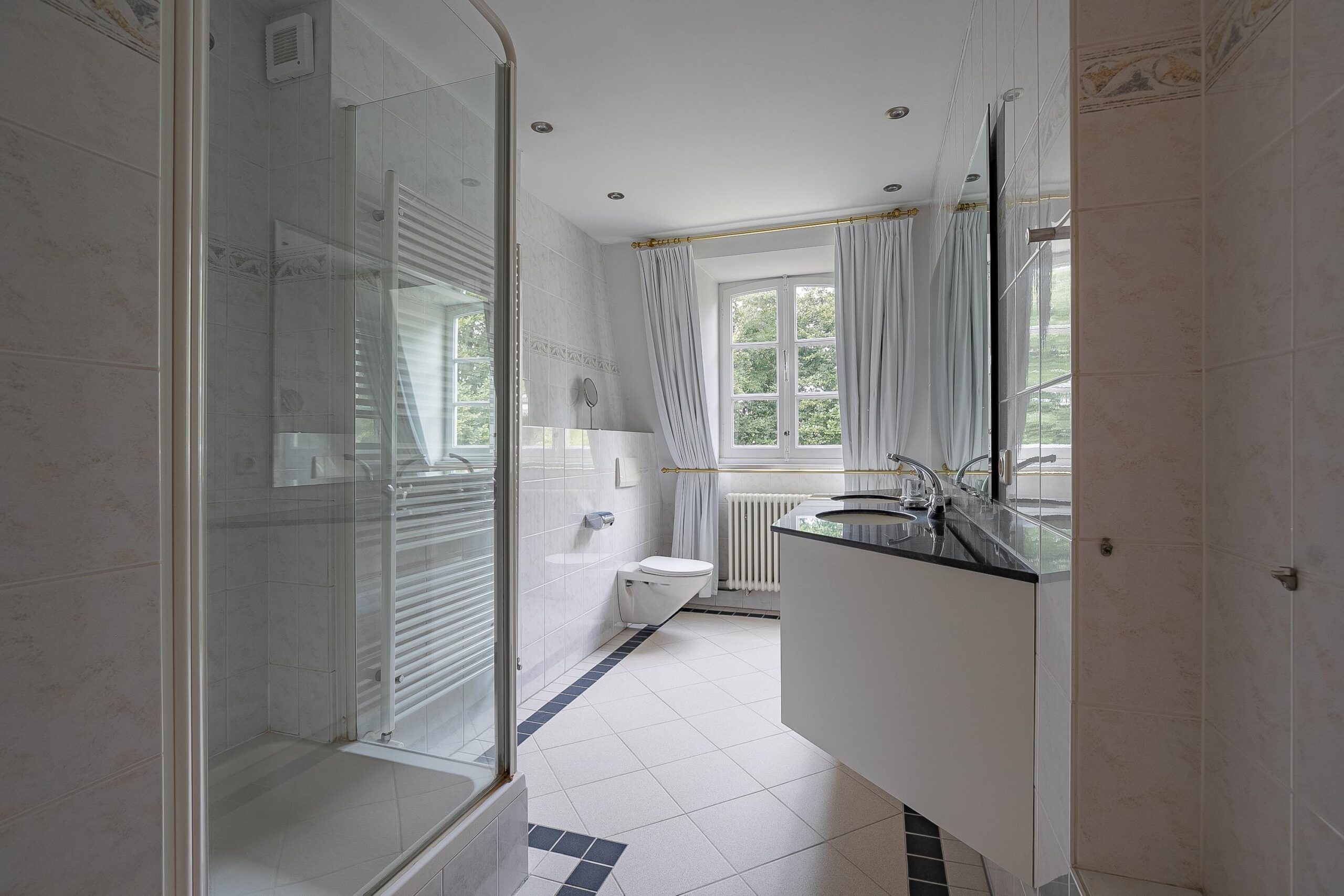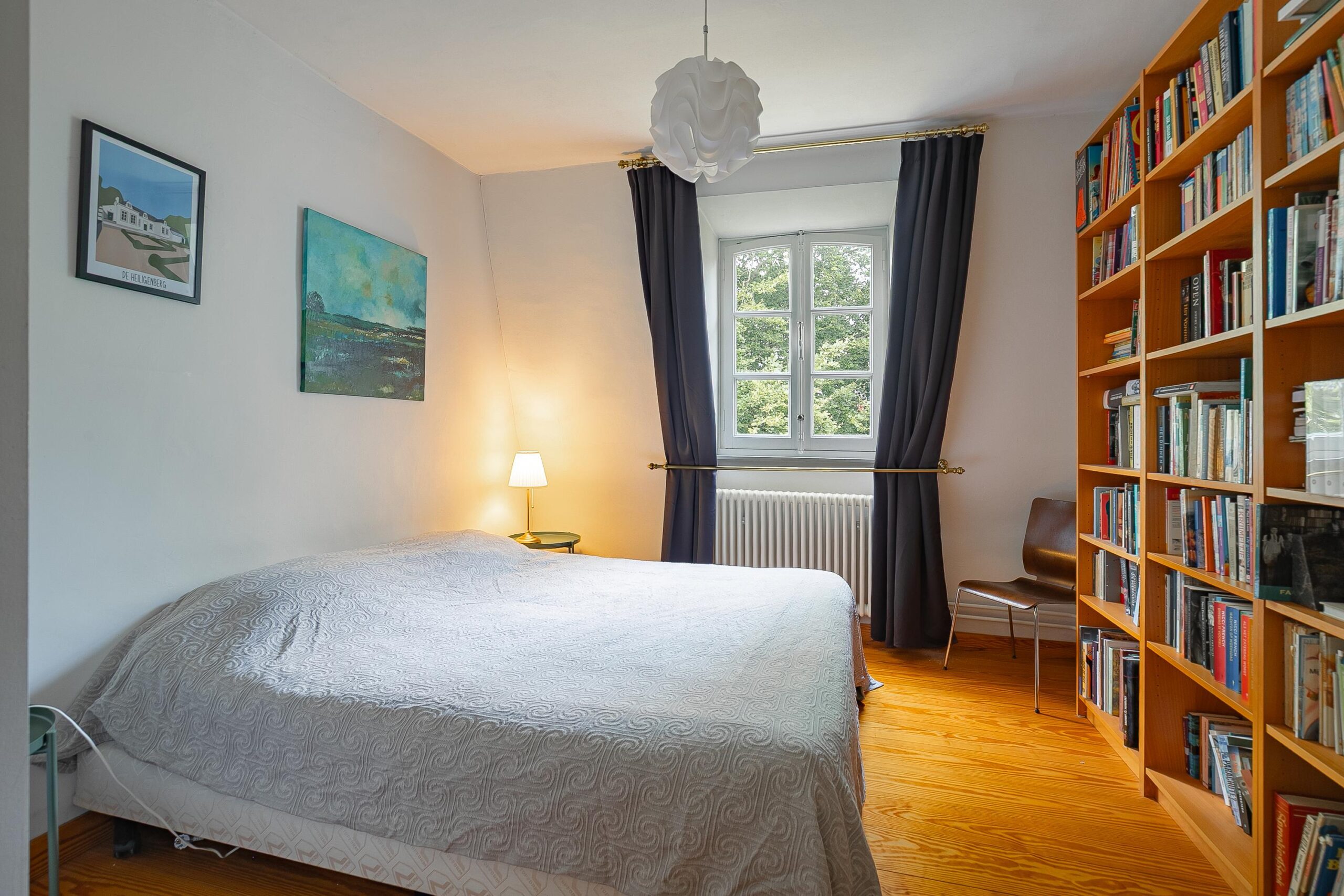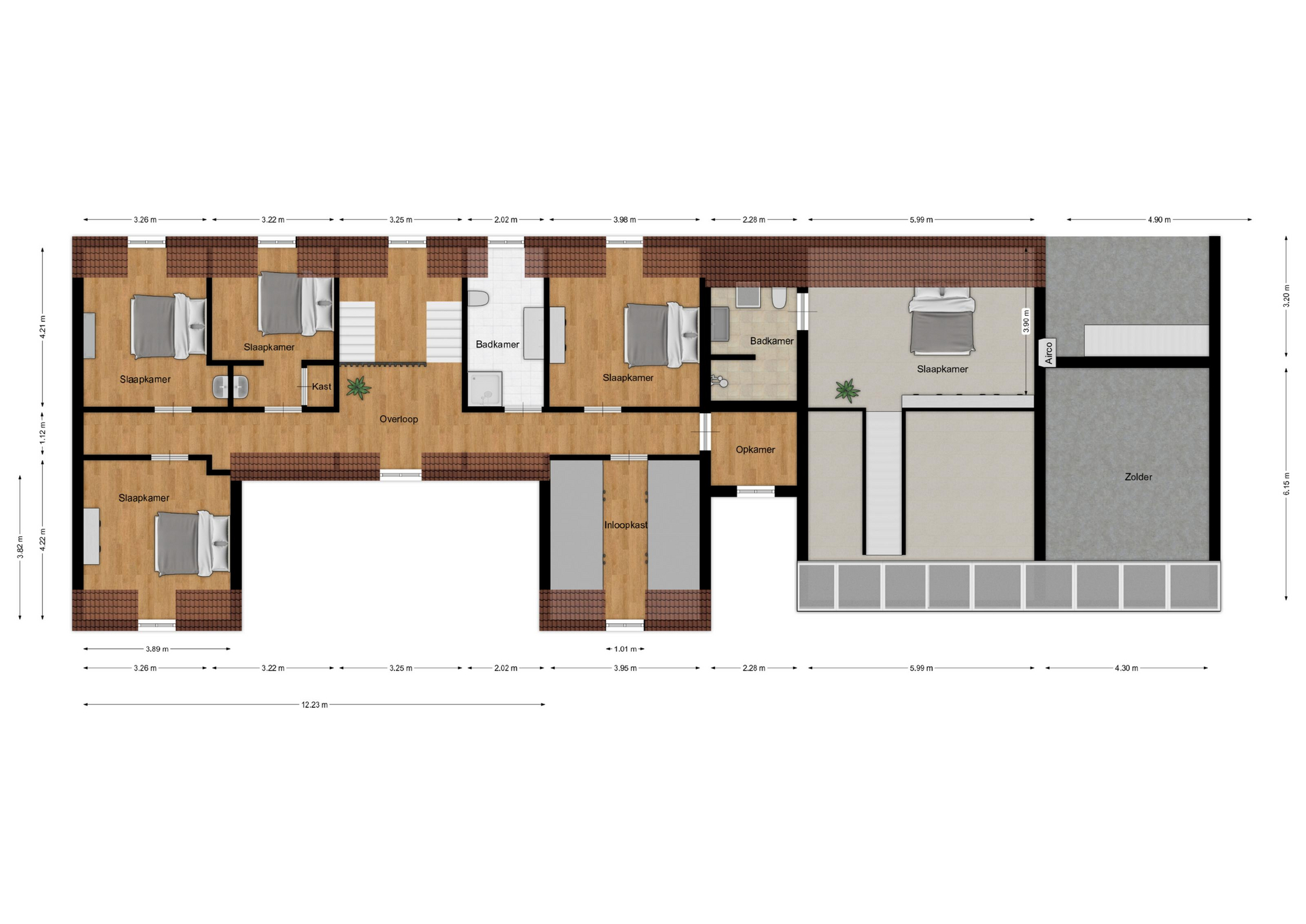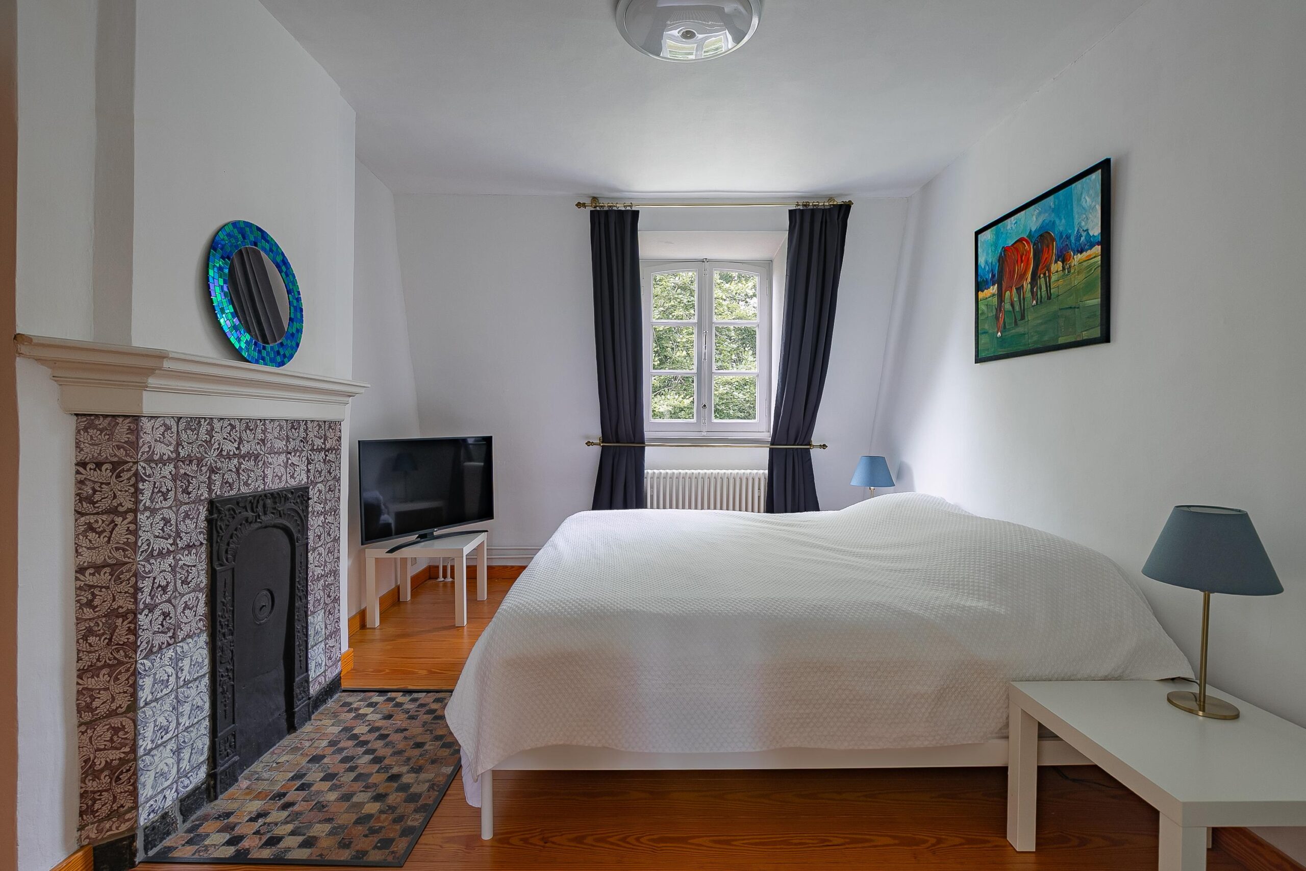 Prachtige overloop met veel lichtinval. Vier slaapkamers (resp. 16.8m², 16.2 m², 14.3m² en 12.9m²). Op één van de slaapkamers is een originele schouw, op één slaapkamer is een muurkast en op twee slaapkamers is een wastafel. Kleedruimte/inloopkast (ca. 16.2m²). Badkamer (ca. 8.5m²) met douche, wandcloset, badmeubel met twee wastafels en designradiator. Verder is er nog een opkamer (ca. 4.5m²).