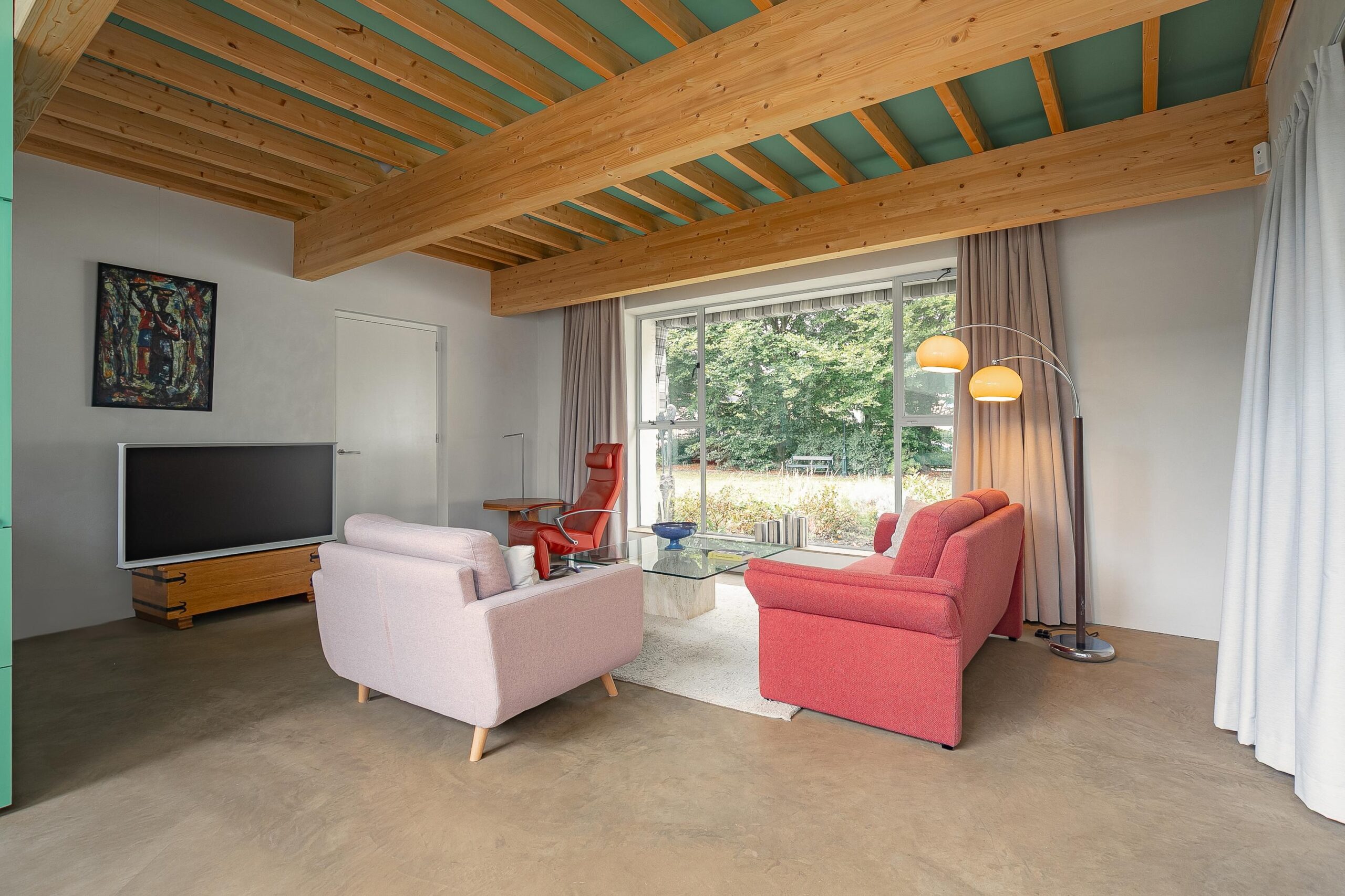 Het landhuis heeft een tweede entree naar het voormalige atelier dat aangepast is tot een prachtig gastenverblijf met alle voorzieningen. Op de begane grond van het gastenverblijf is een woonkamer met uitzicht over de tuin. Moderne trap met geïntegreerde keuken (gerealiseerd in 2020) voorzien van de volgende apparatuur: inductiekookplaat, koelkast, vaatwasser, spoelbak en afzuigkap. De woonkamer en keuken zijn samen ca. 48.5m². Tevens is er een tussenportaal met toegang tot de wasruimte en het toilet met wandcloset en wastafeltje. Moderne trap naar de vide (ca. 25.4m²) met airco. De vide is in gebruik als slaapkamer en geeft toegang tot de moderne badkamer (ca. 6.8m² / bwjr. 2020) met inloopdouche, wandcloset en badmeubel met wastafel. Verder is aan de rechterzijde van het landhuis een ruime garage (ca. 26.1m²) met erachter gelegen overdekt terras. Via een buitentrap onder het terras is de ruimte boven de garage bereikbaar die voor meerdere doelen (atelier/hobbyruimte) geschikt gemaakt kan worden.