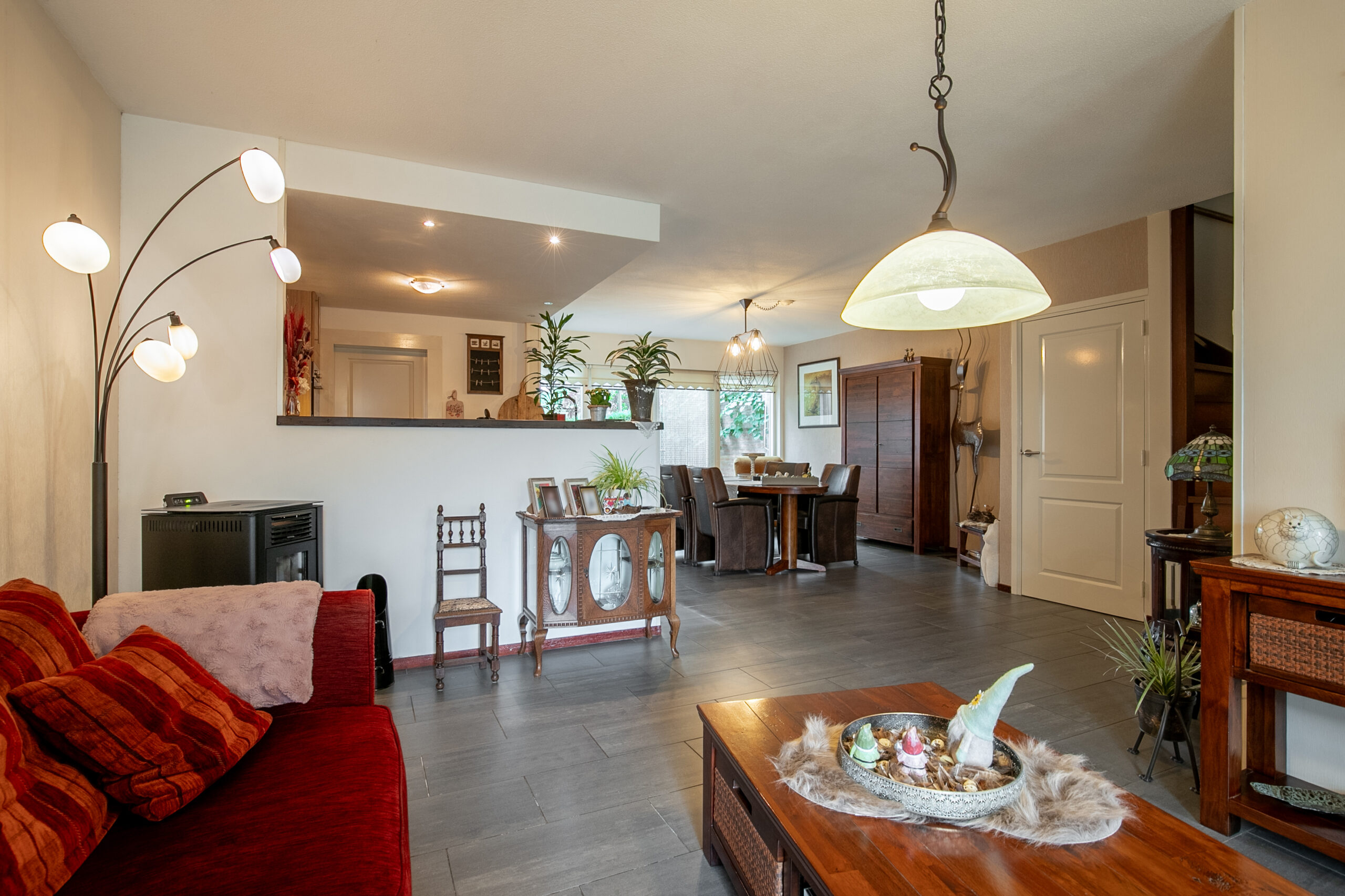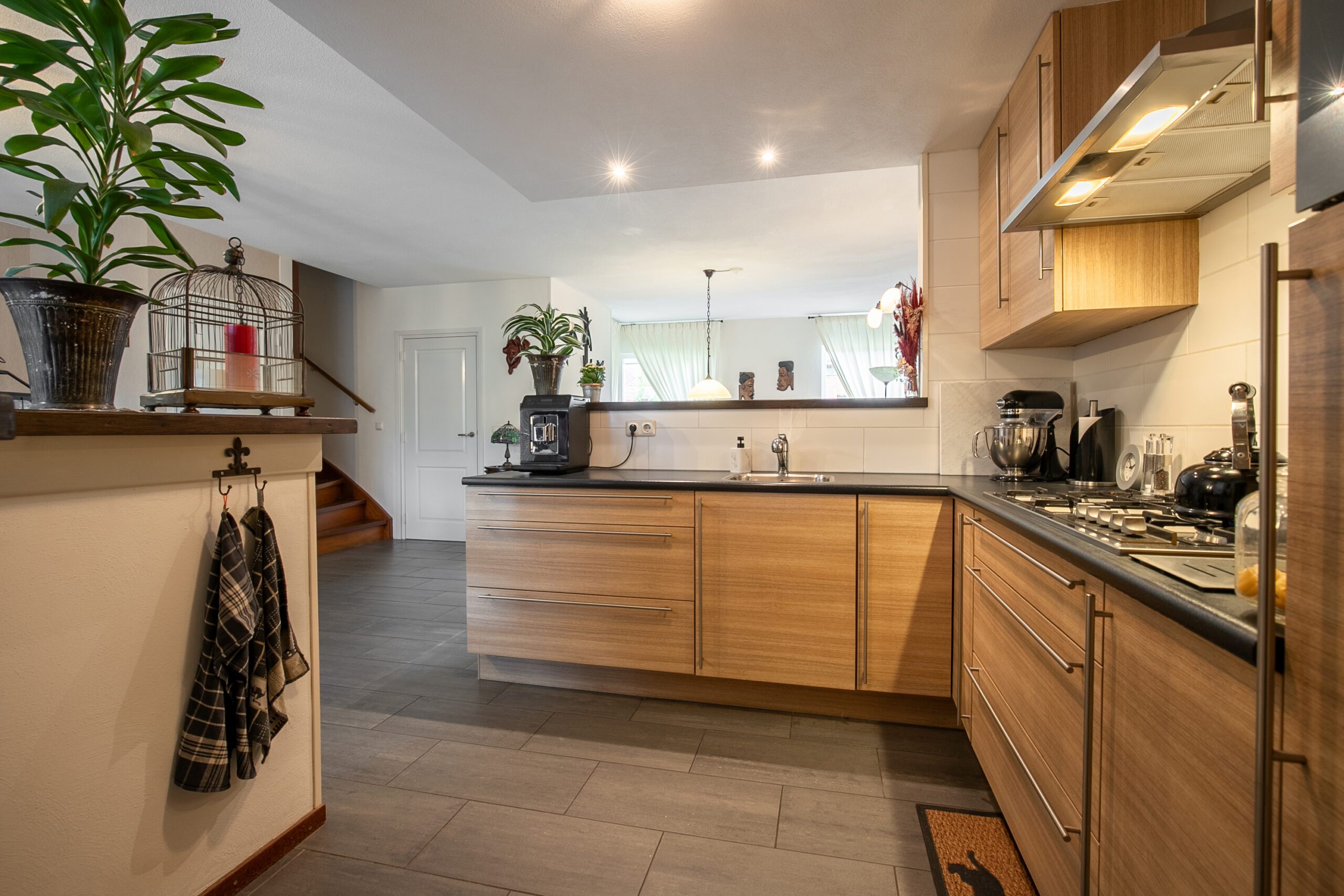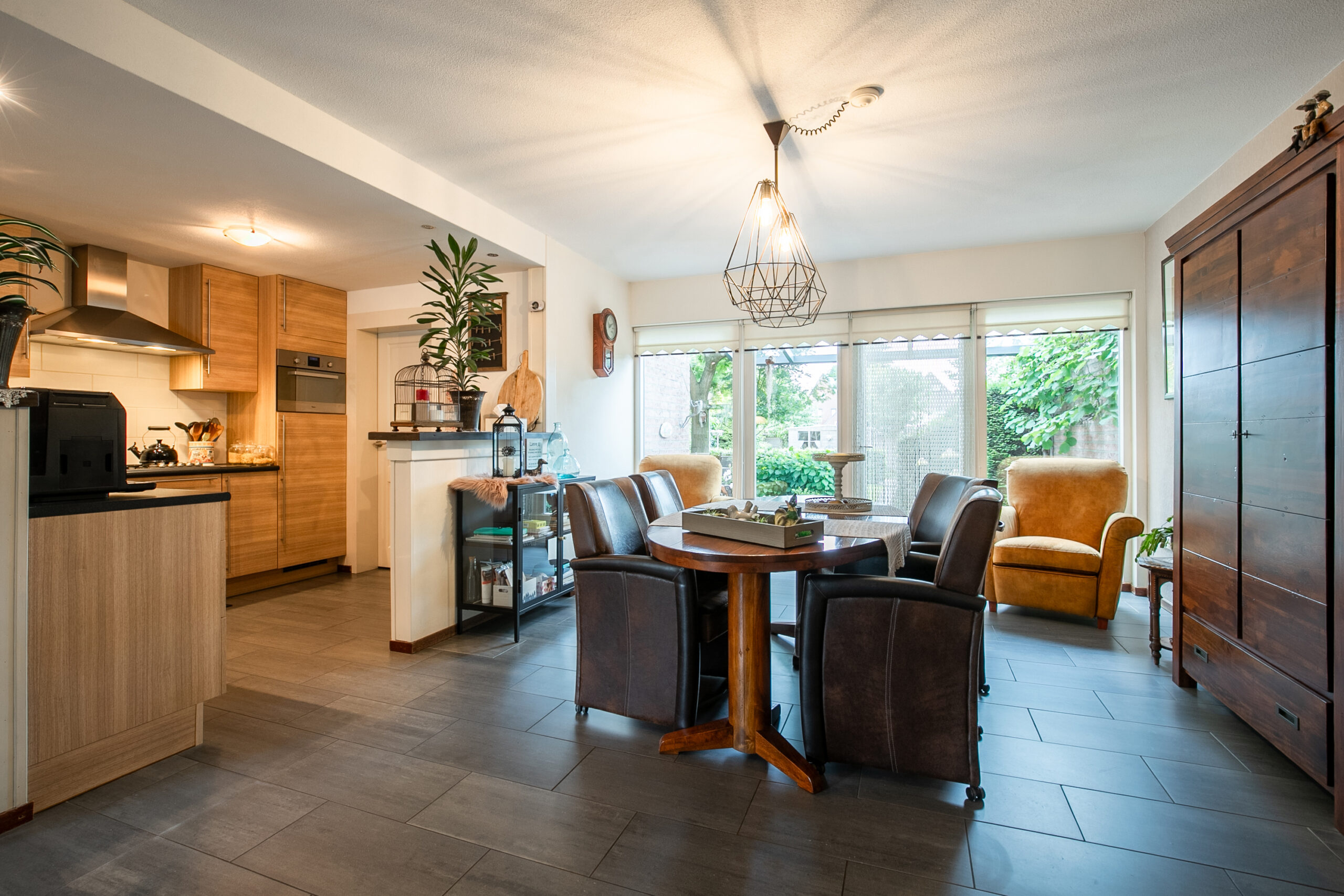 De overdekte entree biedt toegang tot de hal met tegelvloer. Hier is de uitgebreide meterkast en de betegelde toiletruimte voorzien van een zwevend toilet en fonteintje. De woonkamer is Z-vormig (9.93 x 3.95) en vormt samen met de halfopen keuken een royale leefruimte van ongeveer 47 m². Er is een antracietkleurige tegelvloer met vloerverwarming en een pelletkachel voor de gezellige warmte. De openslaande tuindeuren met grote ramen ernaast zorgen voor optimaal tuincontact. De keuken 2.78 x 2.36 is voorzien van een hoekinstallatie met de navolgende apparatuur: 5-pits gaskookplaat, afzuigkap, combi-oven en koelkast. Vanuit de keuken is een praktische bijkeuken bereikbaar 2.50 x 2.20, deze is ook voorzien van dezelfde tegelvloer en hier zijn de aansluitpunten voor de wasapparatuur. De garage is inpandig bereikbaar vanuit de bijkeuken. Deze garage 6.00 x 3.00 heeft een kantelpoort met loopdeur en hier is een wasbak.
