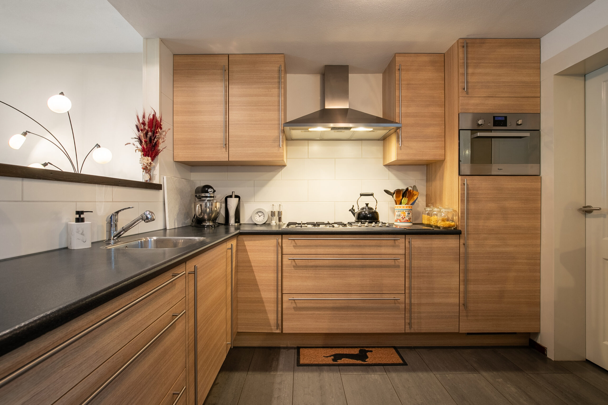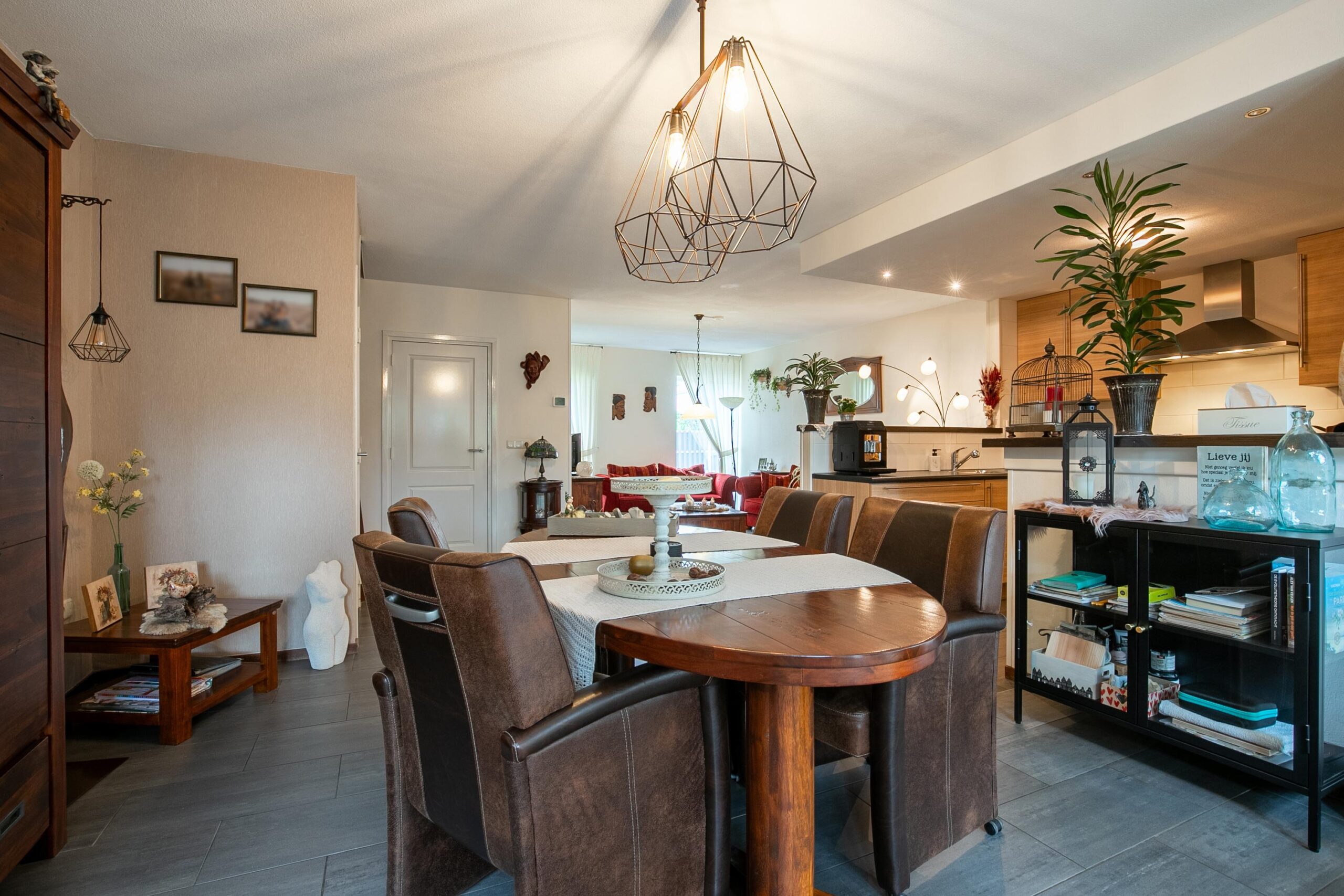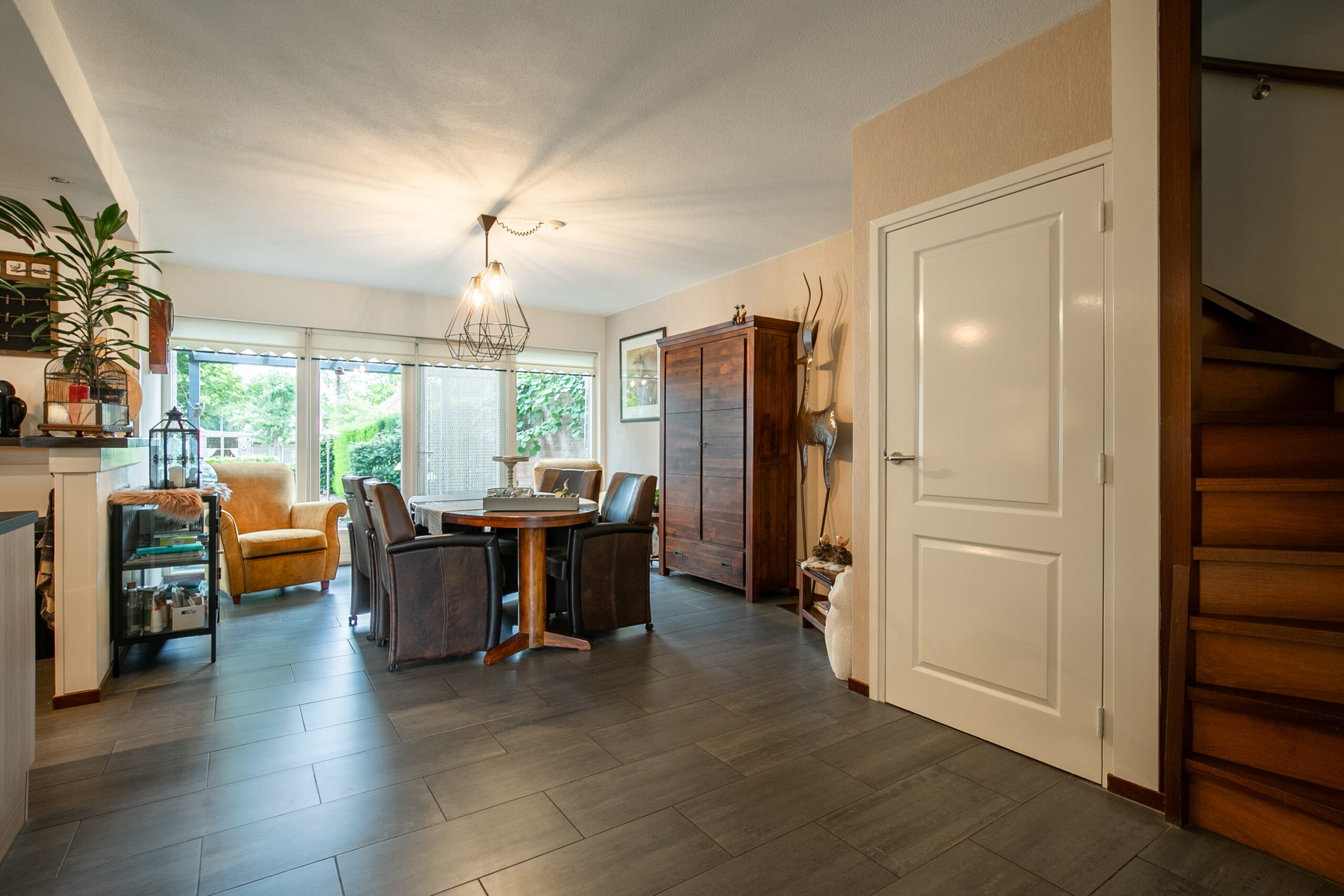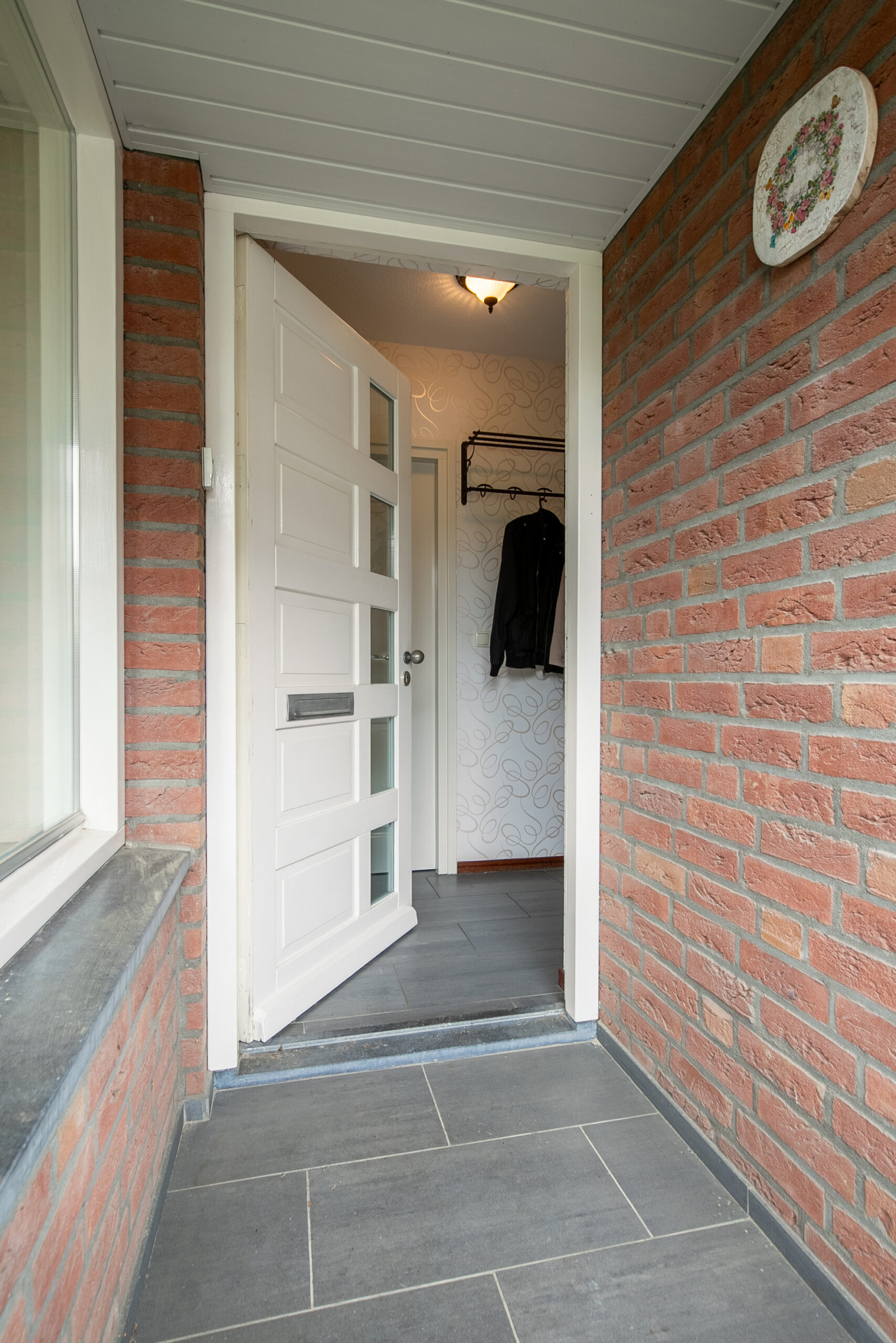 De overdekte entree biedt toegang tot de hal met tegelvloer. Hier is de uitgebreide meterkast en de betegelde toiletruimte voorzien van een zwevend toilet en fonteintje. De woonkamer is Z-vormig (9.93 x 3.95) en vormt samen met de halfopen keuken een royale leefruimte van ongeveer 47 m². Er is een antracietkleurige tegelvloer met vloerverwarming en een pelletkachel voor de gezellige warmte. De openslaande tuindeuren met grote ramen ernaast zorgen voor optimaal tuincontact. De keuken 2.78 x 2.36 is voorzien van een hoekinstallatie met de navolgende apparatuur: 5-pits gaskookplaat, afzuigkap, combi-oven en koelkast. Vanuit de keuken is een praktische bijkeuken bereikbaar 2.50 x 2.20, deze is ook voorzien van dezelfde tegelvloer en hier zijn de aansluitpunten voor de wasapparatuur. De garage is inpandig bereikbaar vanuit de bijkeuken. Deze garage 6.00 x 3.00 heeft een kantelpoort met loopdeur en hier is een wasbak.