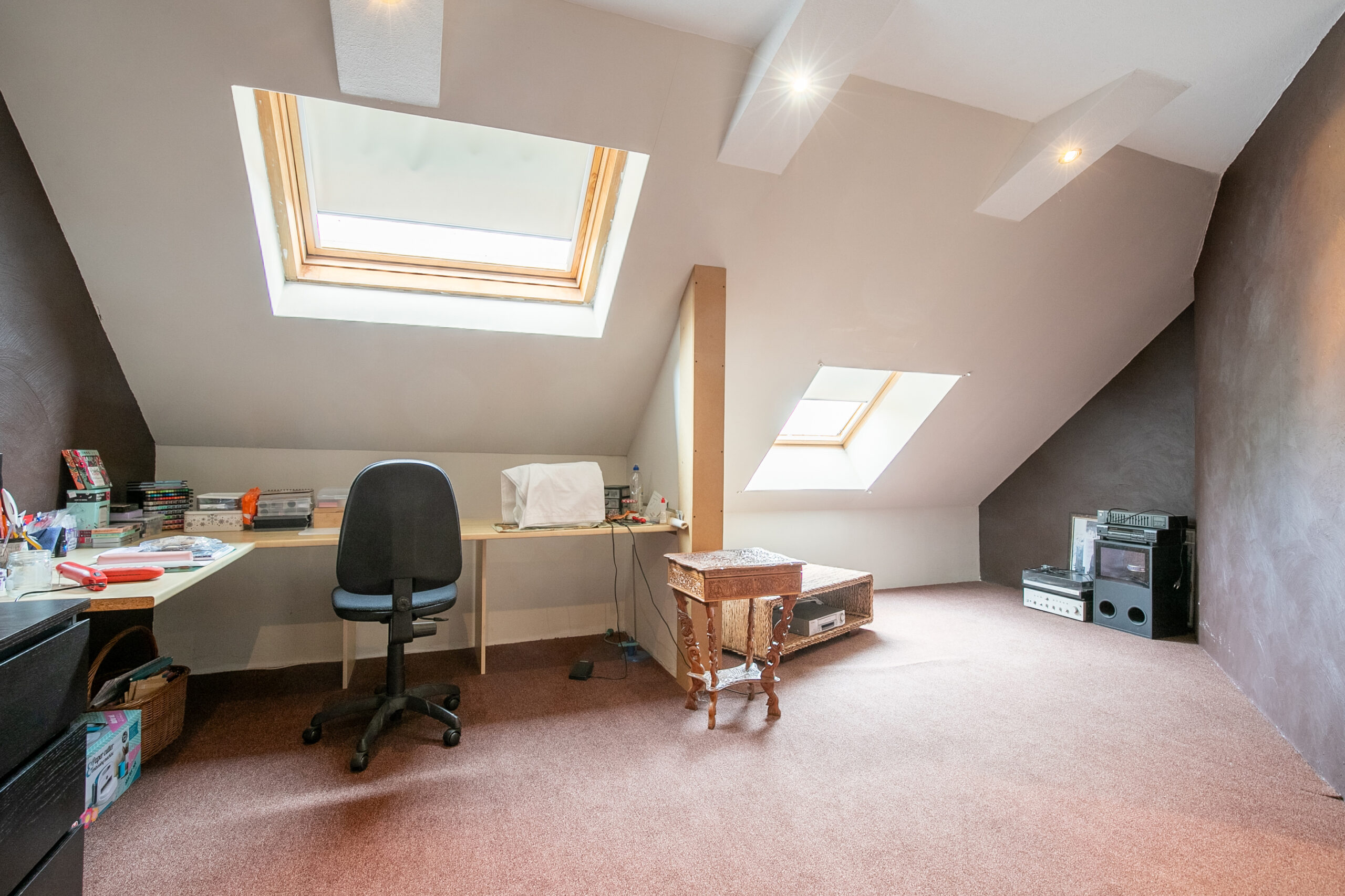 Met een vaste trap is deze hoge verdieping bereikbaar. De overloop biedt voldoende bergruimte en hier is de combi c.v.-installatie geplaatst (Vaillant ecoTec Plus 2023 eigendom). Hier is een ruime en lichte vierde slaapkamer gerealiseerd 5.76 x 3.85 (22 m²) met twee dakramen en laminaatvloer.