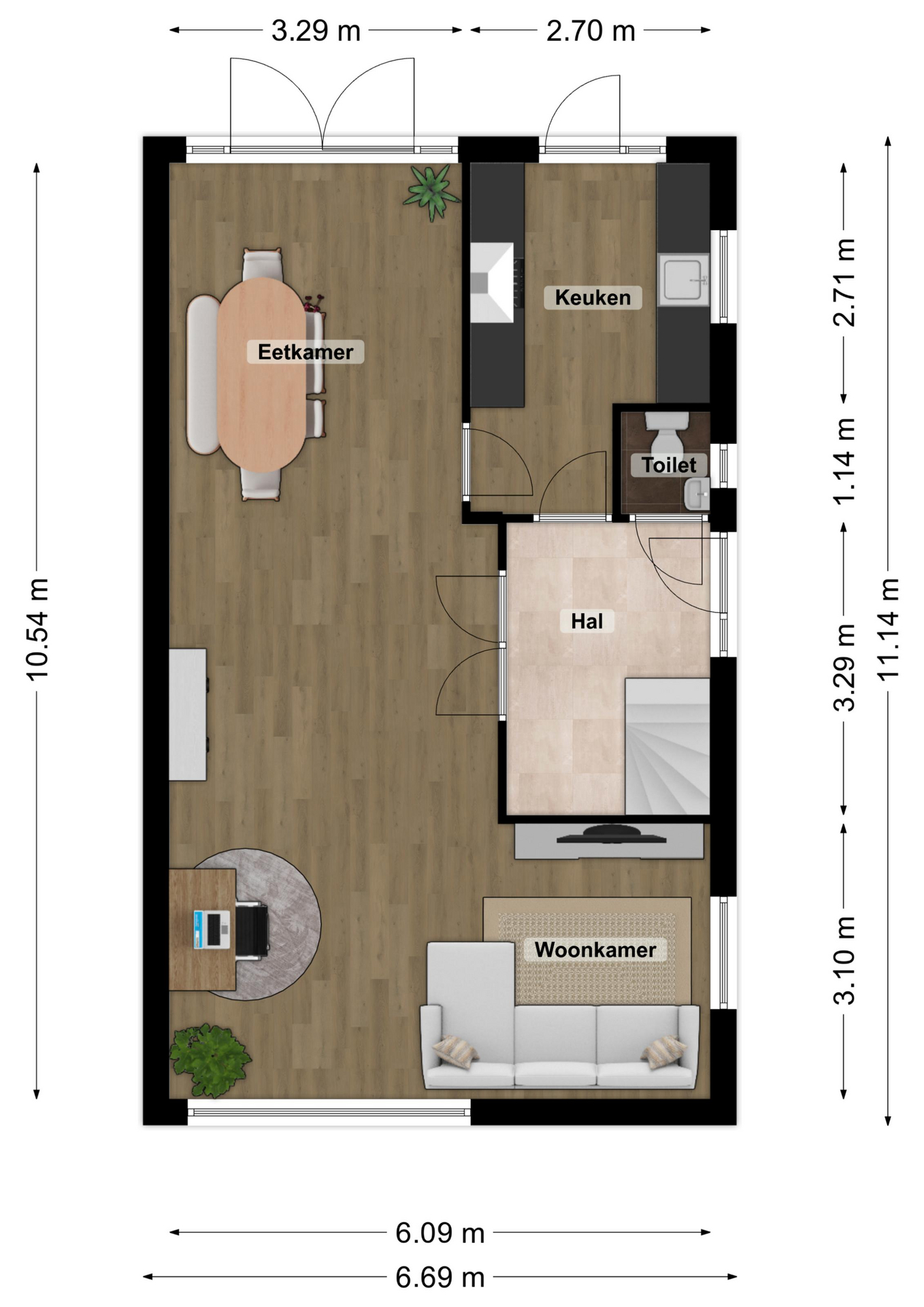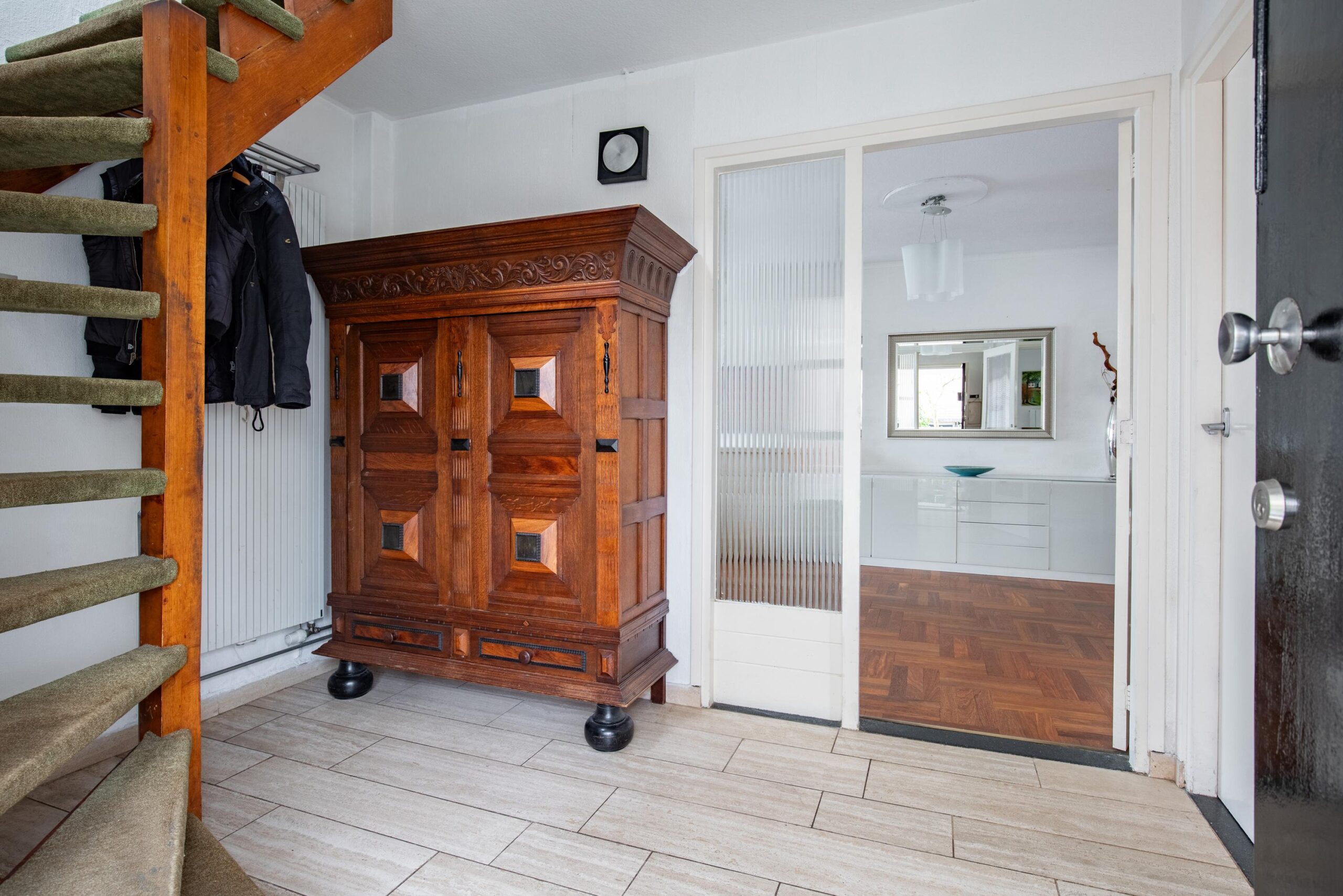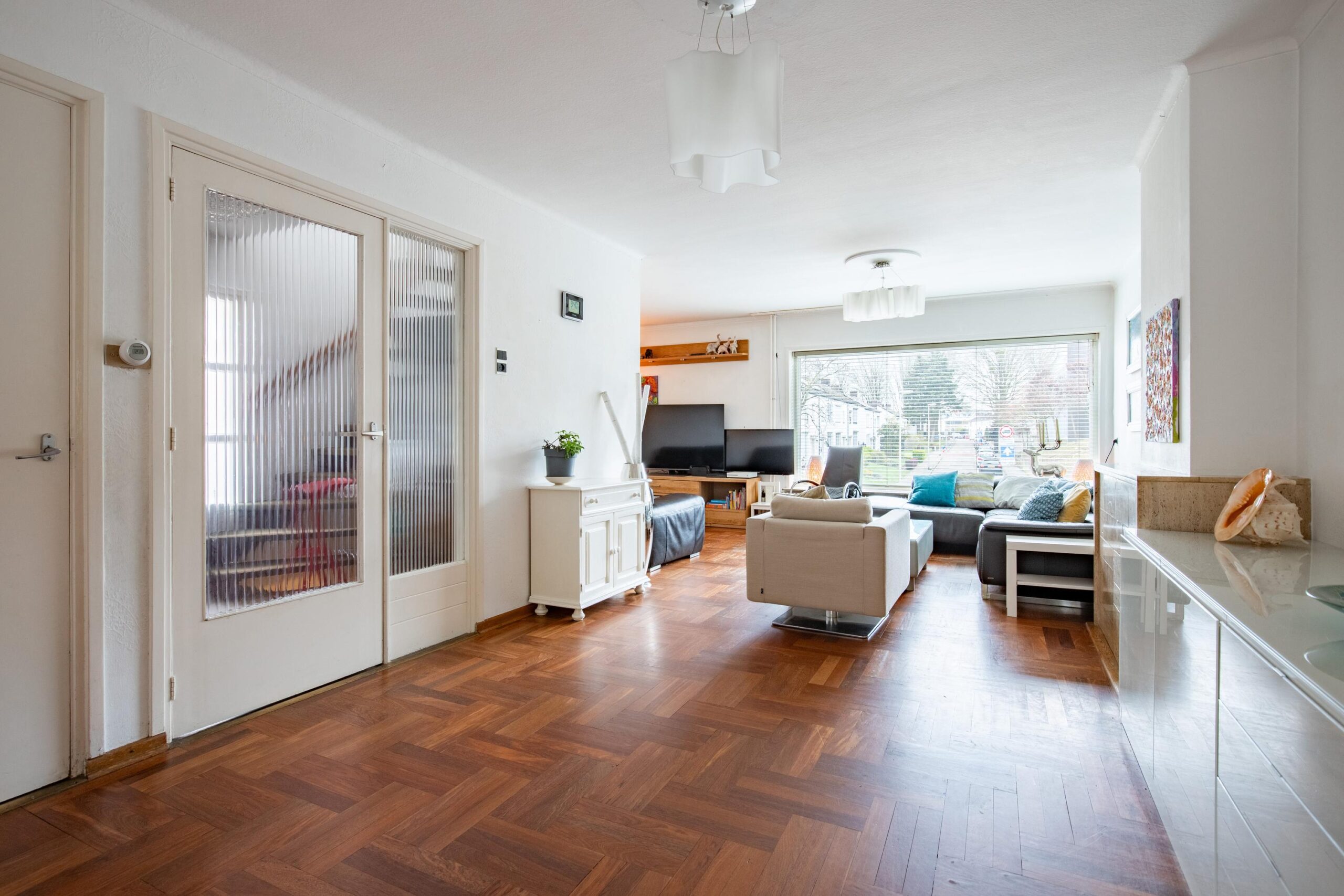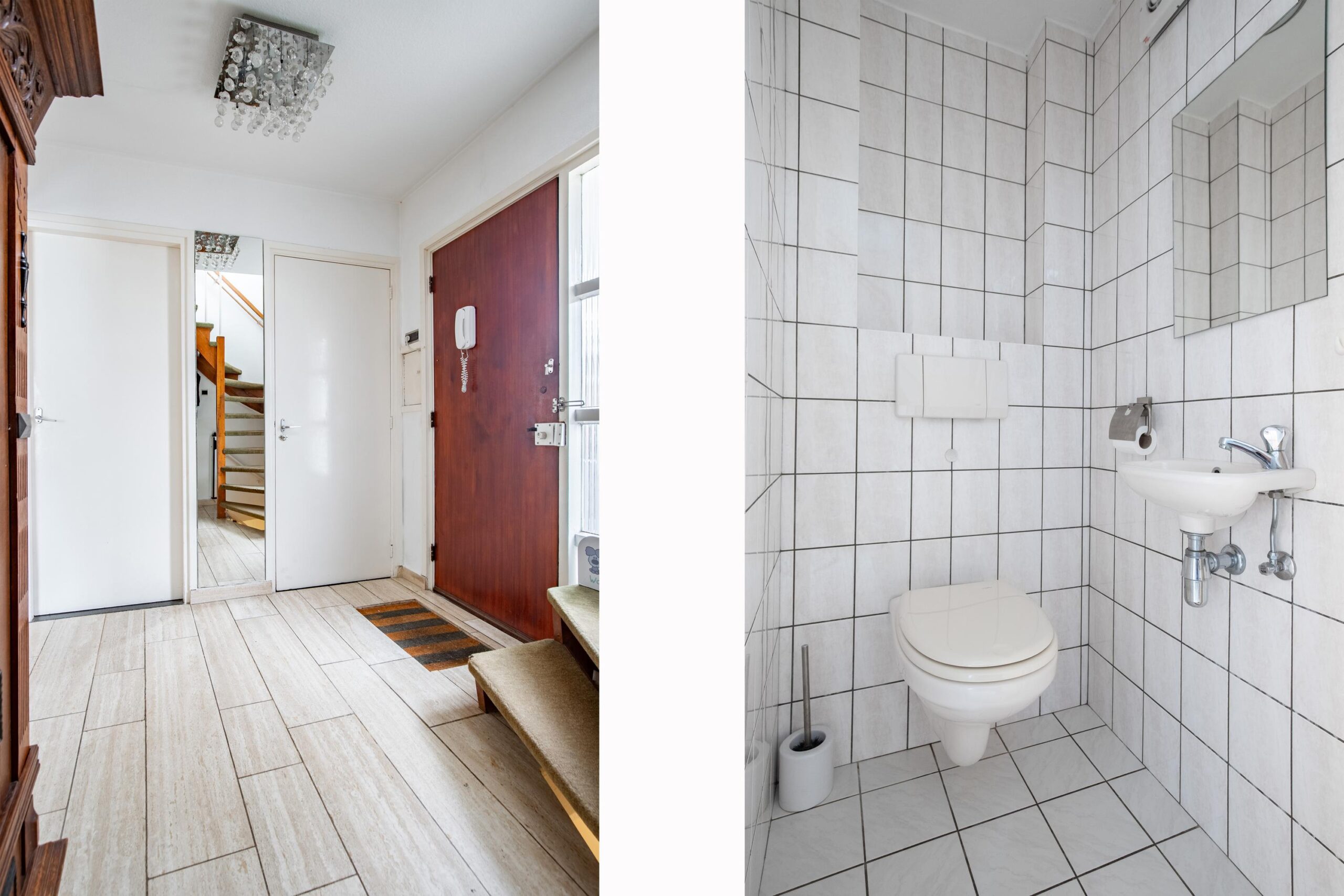Via een trappenpartij toegang naar de overdekte entree. Ruime ontvangsthal voorzien van een plavuizenvloer en toegang tot de verdiepingen. Betegelde toiletruimte met toilet en fonteintje. Vanuit de hal toegang tot zowel de woonkamer als de gesloten keuken. De royale woon/-eetkamer is voorzien van optimale lichtinval middels grote raampartijen en beschikt over dubbele openslaande deuren naar de achtertuin. De woonkamer is voorzien van een houten parketvloer en biedt een perfect vrij uitzicht.
