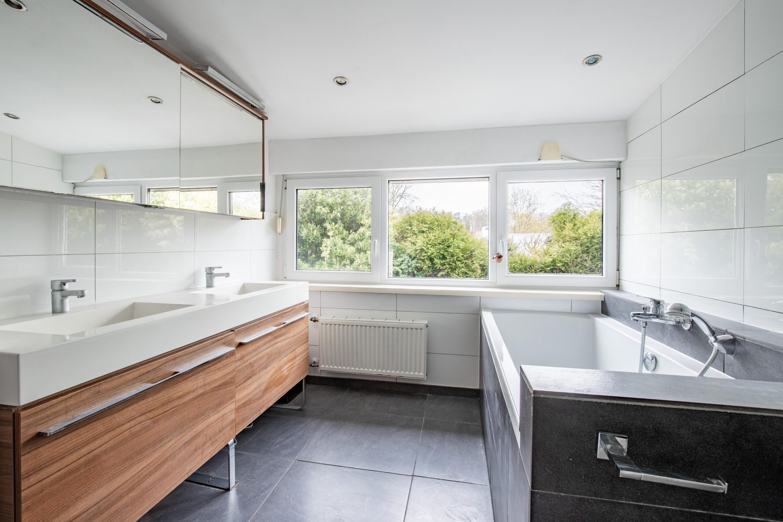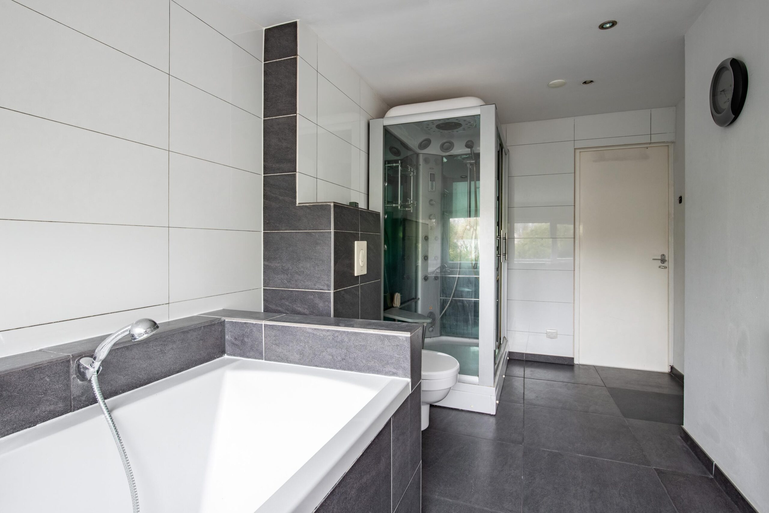 De royale badkamer is door de aanbouw zeer ruim en uitgerust met een groot ligbad, douchecabine, toilet en dubbele wastafel. Vanaf de overloop is middels een vlizotrap de praktische bergzolder bereikbaar.