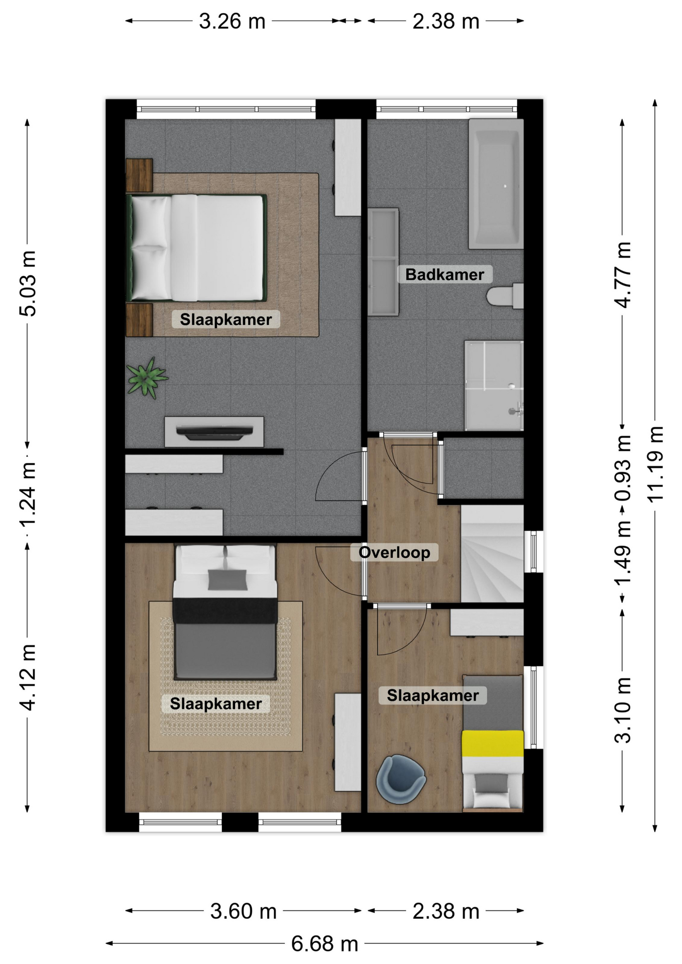 Overloop met toegang tot maar liefst vier slaapkamers, allen voorzien van een laminaatvloerafwerking. De grote slaapkamer aan de achterzijde heeft een inbouwkast en is zeer royaal van opzet.