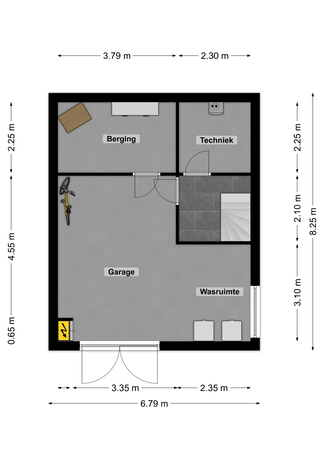 Vanuit de hal vaste trap naar het souterrain dat toegang biedt tot diverse ruimtes. Het souterrain is verdeeld in een wasruimte, evenals een technische ruimte met de opstelplaats voor de cv-installatie (Intergas, 2011). Aansluitend toegang tot de inpandige garage, voorzien van openslaande deuren naar de oprit, een wateraansluiting en de meterkast. Vanuit de garage is er toegang tot een royale bergruimte, ideaal voor opslag.