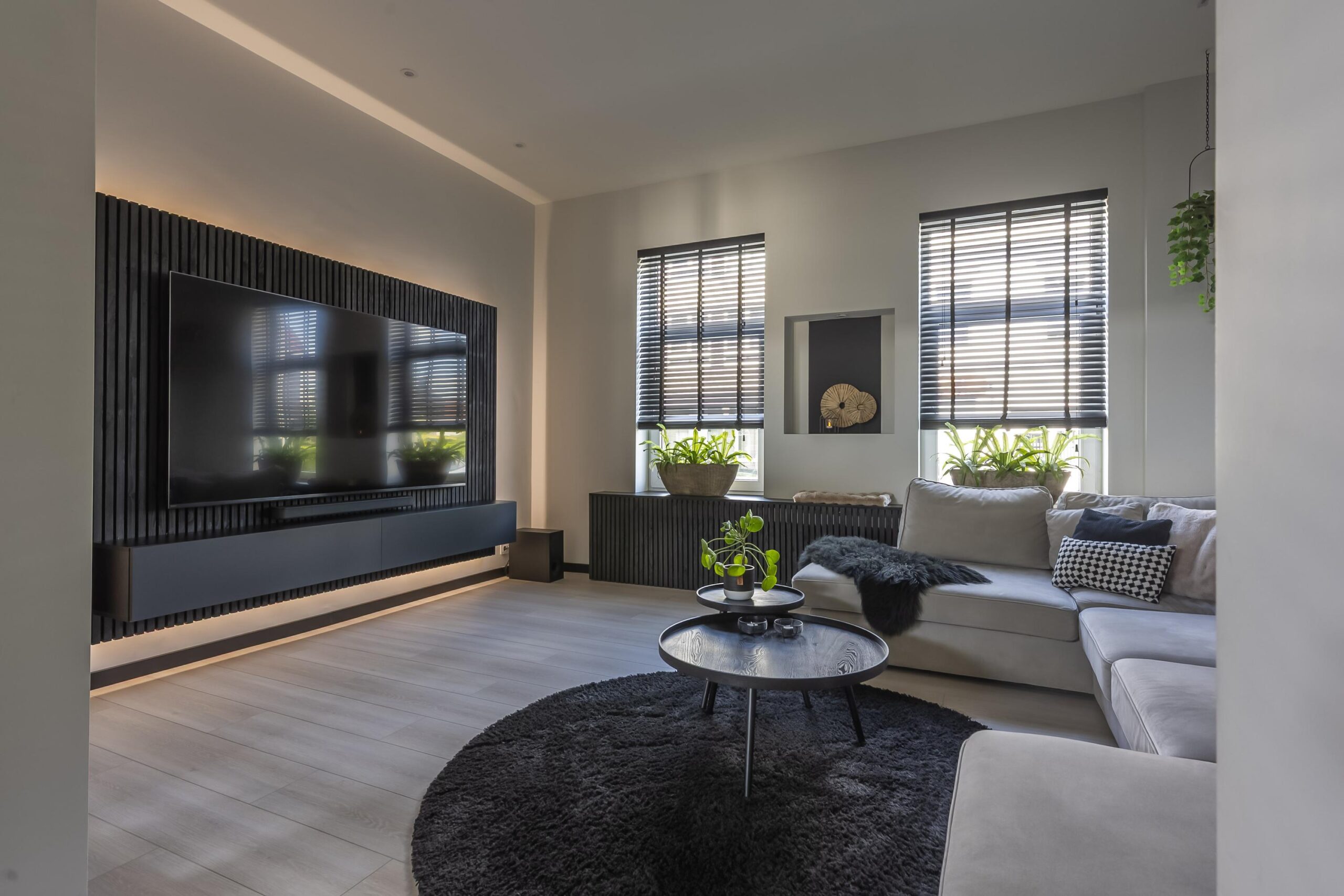 De sfeervolle woonkamer met niveauverschil, PVC vloer en veel lichtinval is groot ca. 47 m².