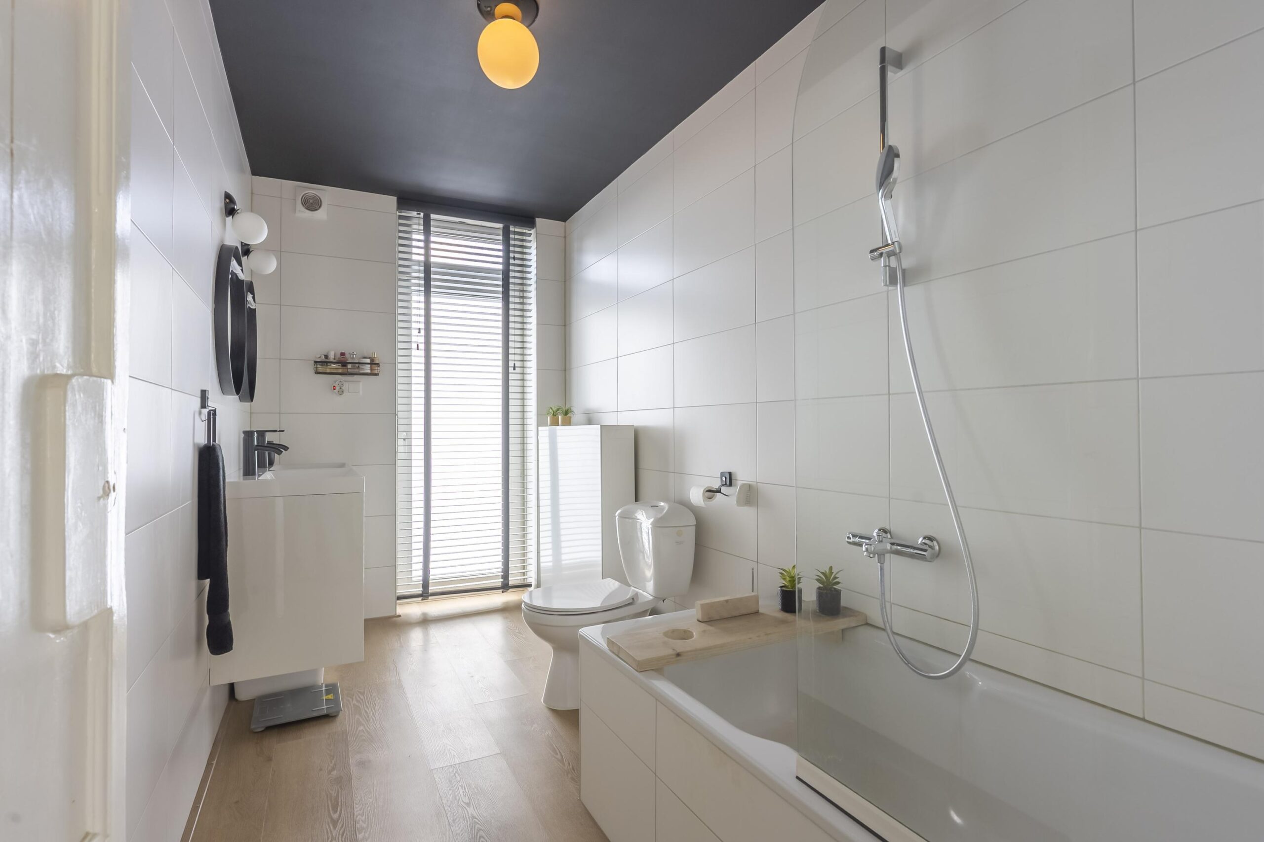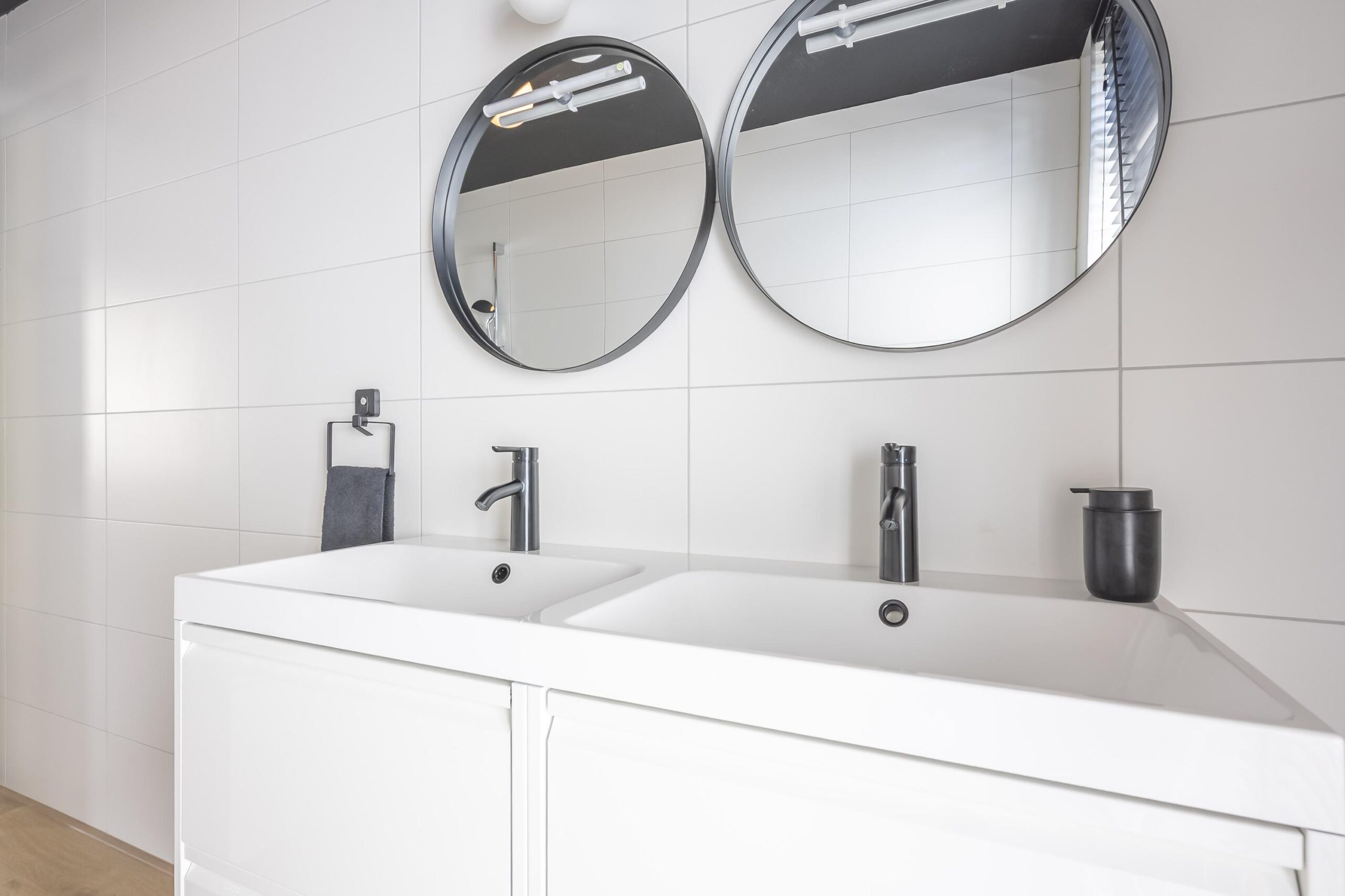 De badkamer is groot ca. 7 m² en is voorzien van een ligbad, dubbele vaste wastafel met ombouw en staand toilet.
