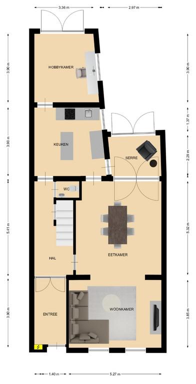 De achterkamer in verlenging van de woonkamer is groot ca. 7 m².
