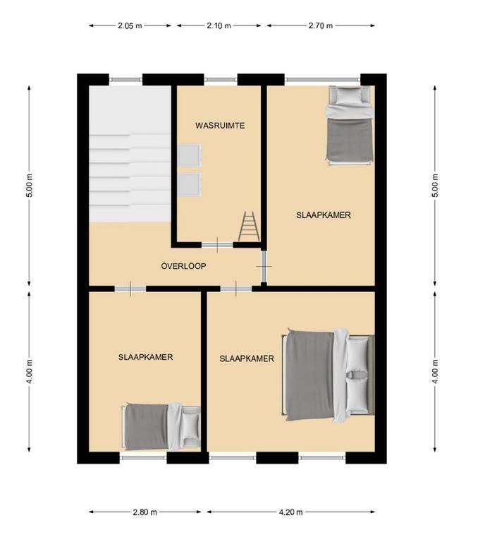 Middels de vaste trap en de overloop zijn de 3 slaapkamers en wasruimte te bereiken.