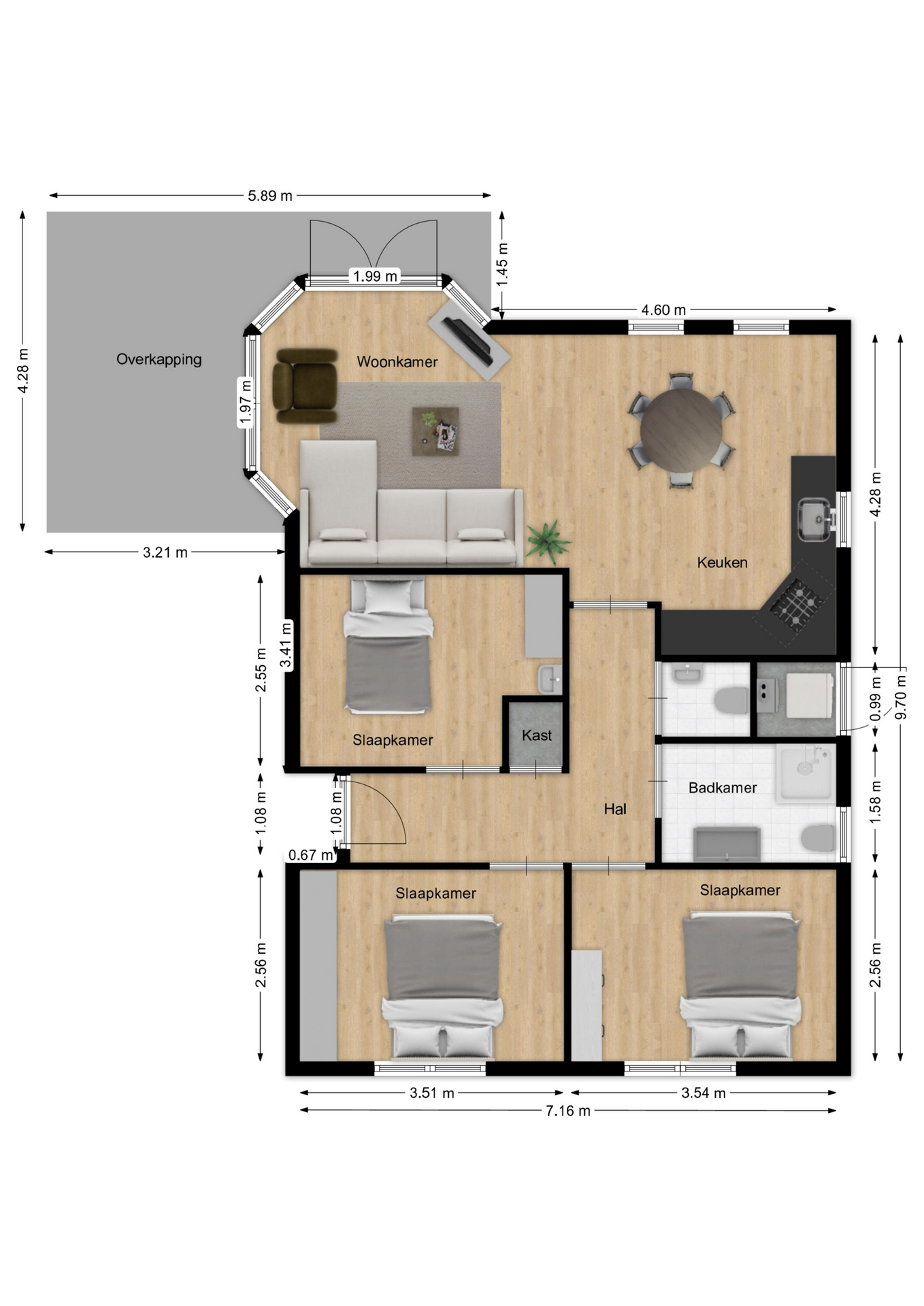 De woning beschikt over drie slaapkamers van ca. 9m², 9m² en 8m². Alle kamers zijn praktisch ingedeeld en voorzien van een eigen wastafel, wat zorgt voor extra comfort en privacy.