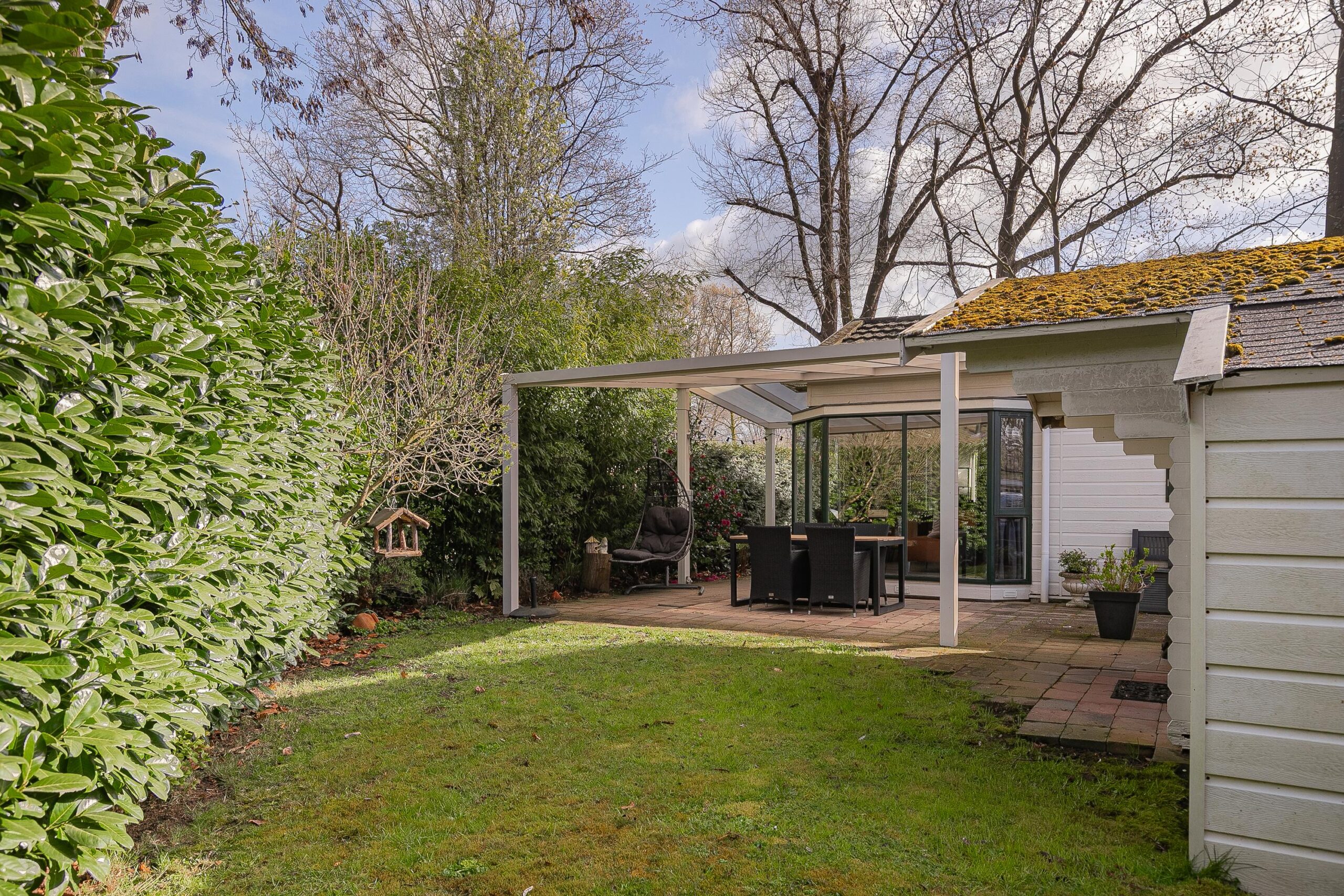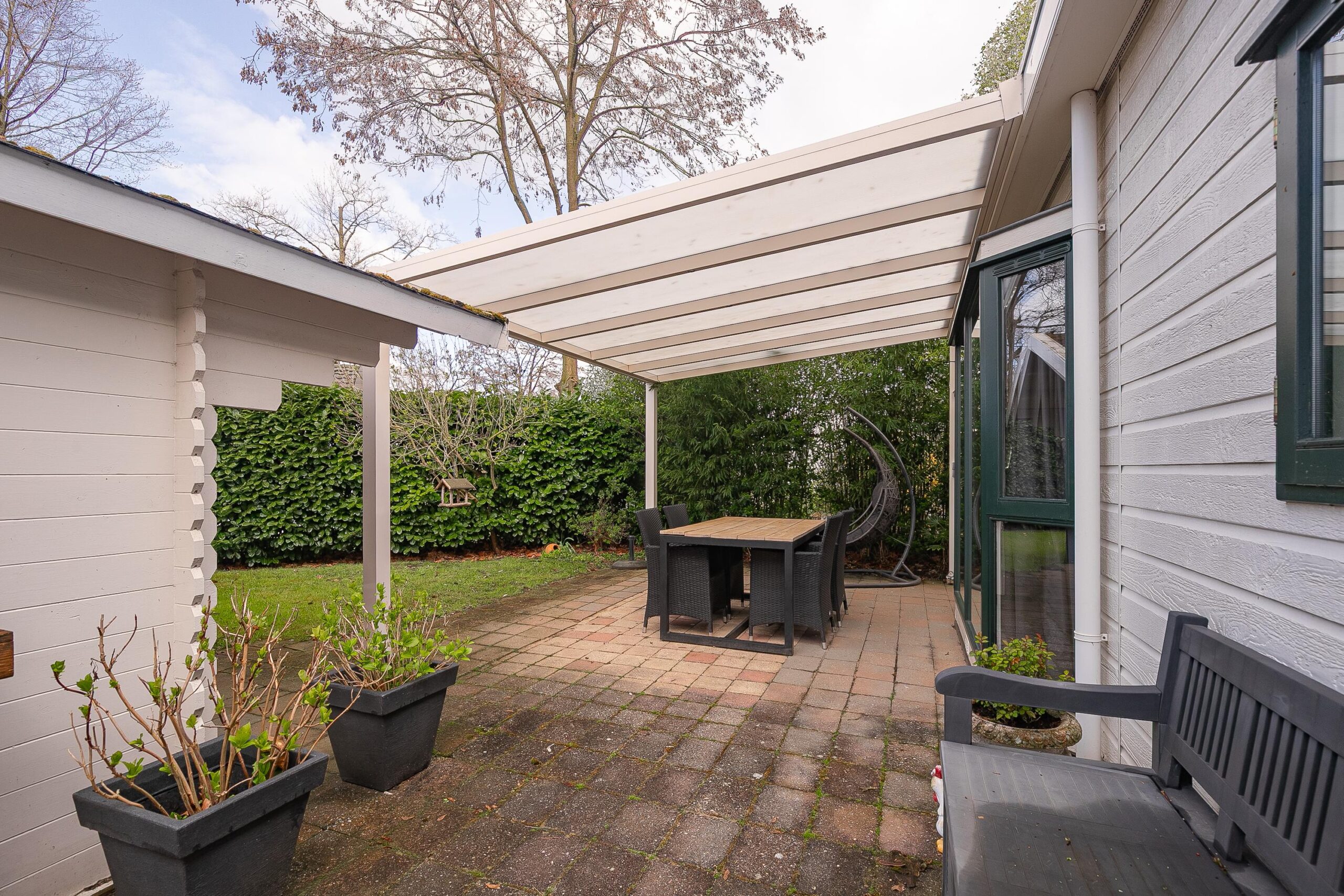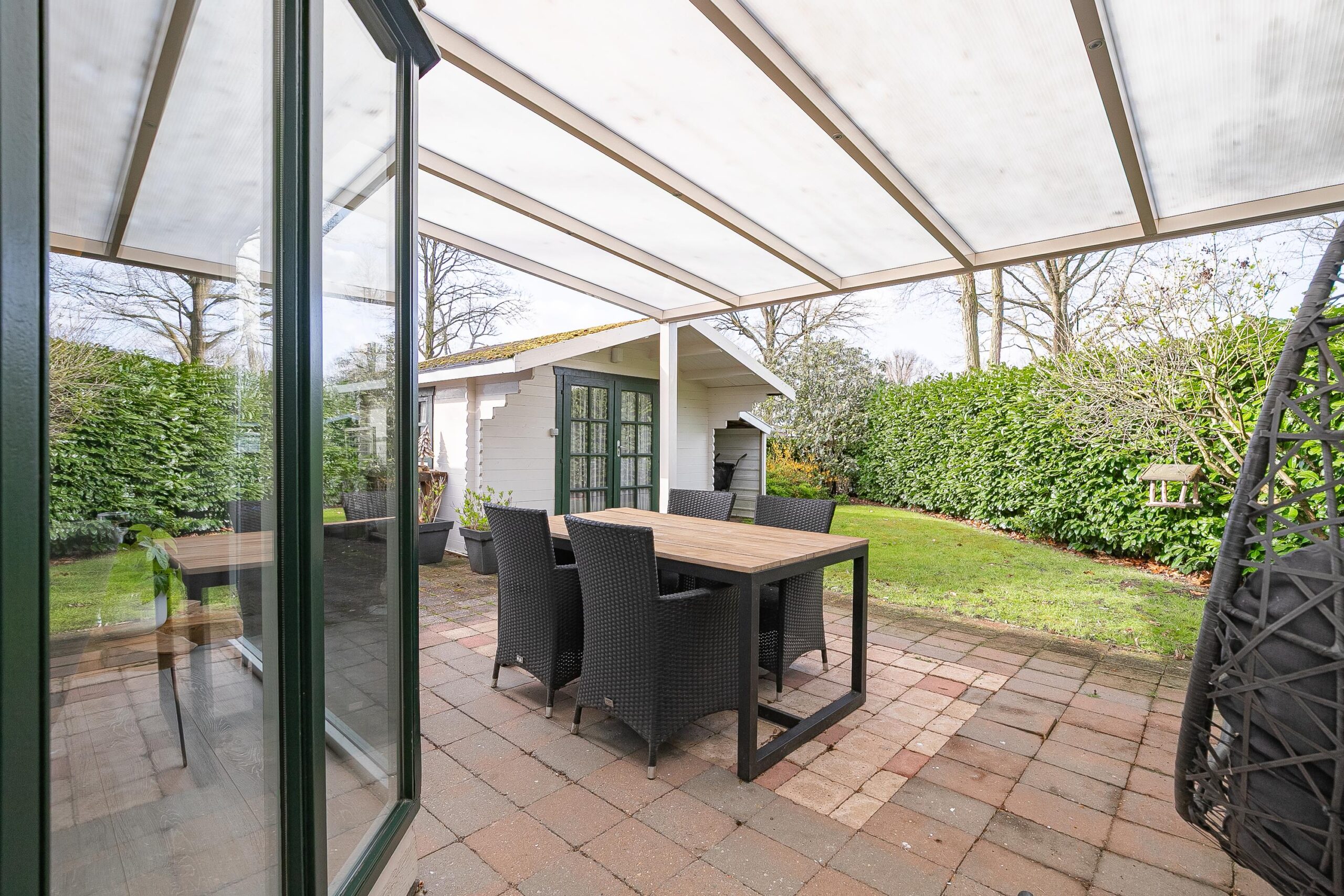 De tuin is zowel via de oprit als via de openslaande tuindeuren in de woonkamer bereikbaar. Direct aan de woning bevindt zich een deels overkapt terras, waardoor u ook tijdens de warmere maanden comfortabel buiten kunt zitten. In de tuin staat daarnaast een praktisch tuinhuis, ideaal voor het opbergen van tuinmeubilair en gereedschap.
