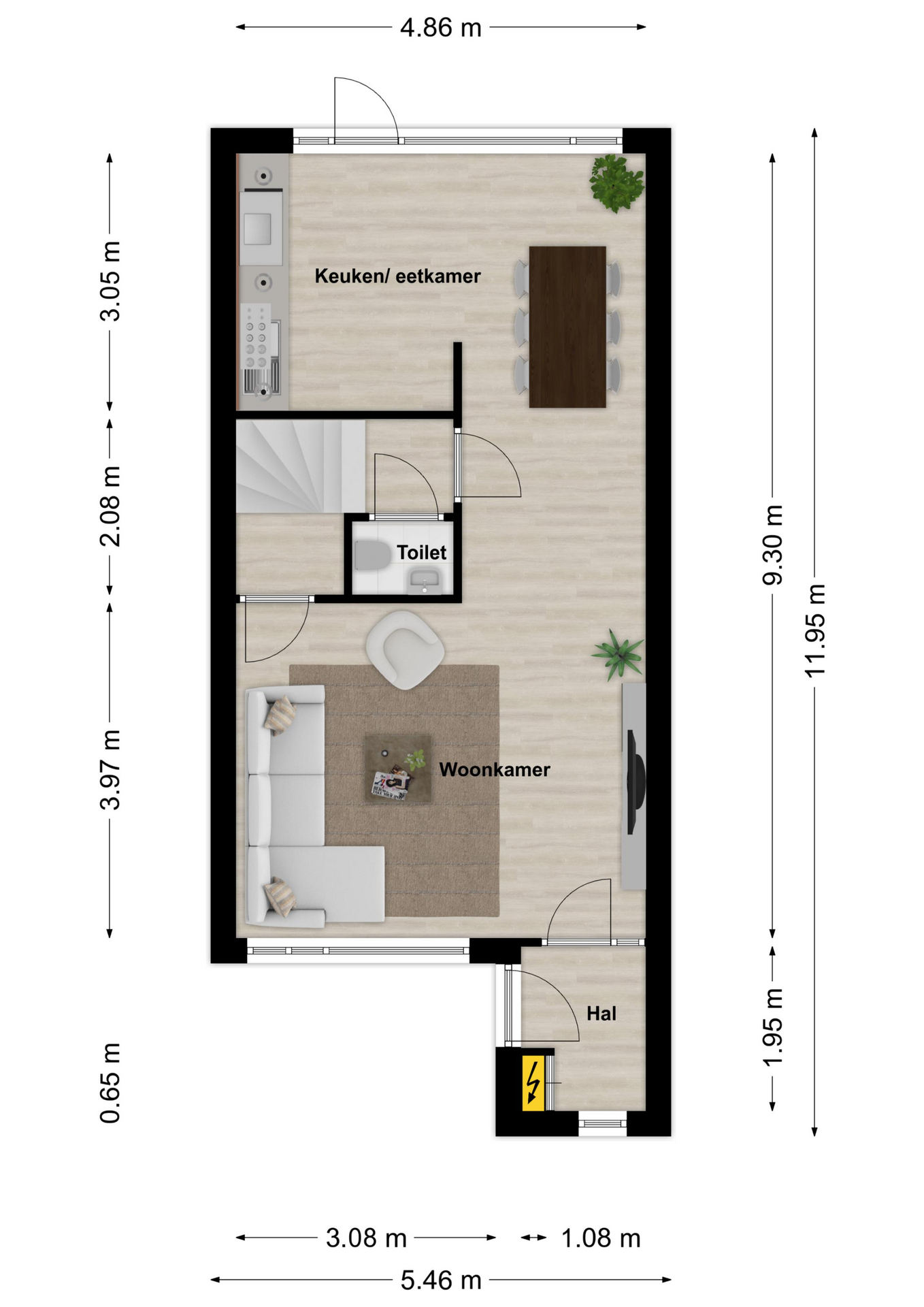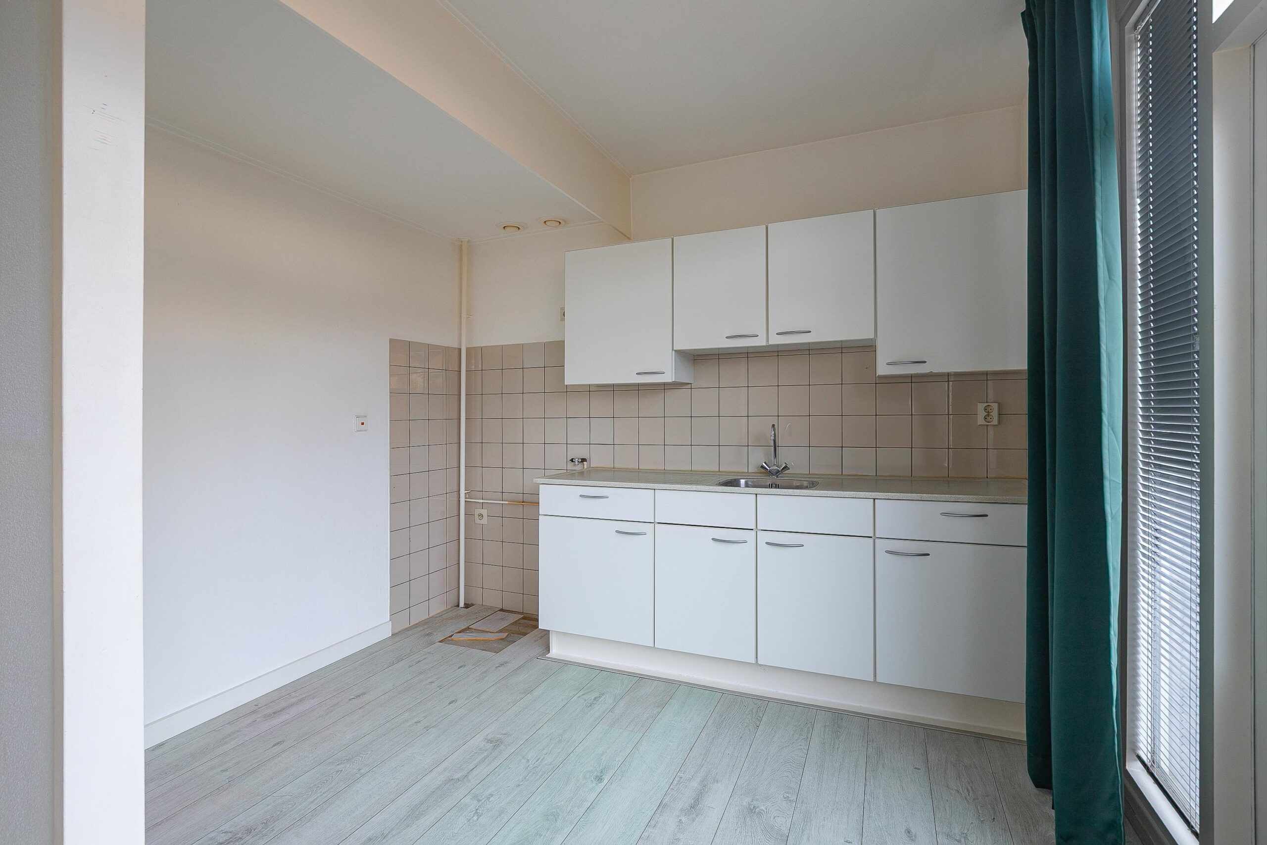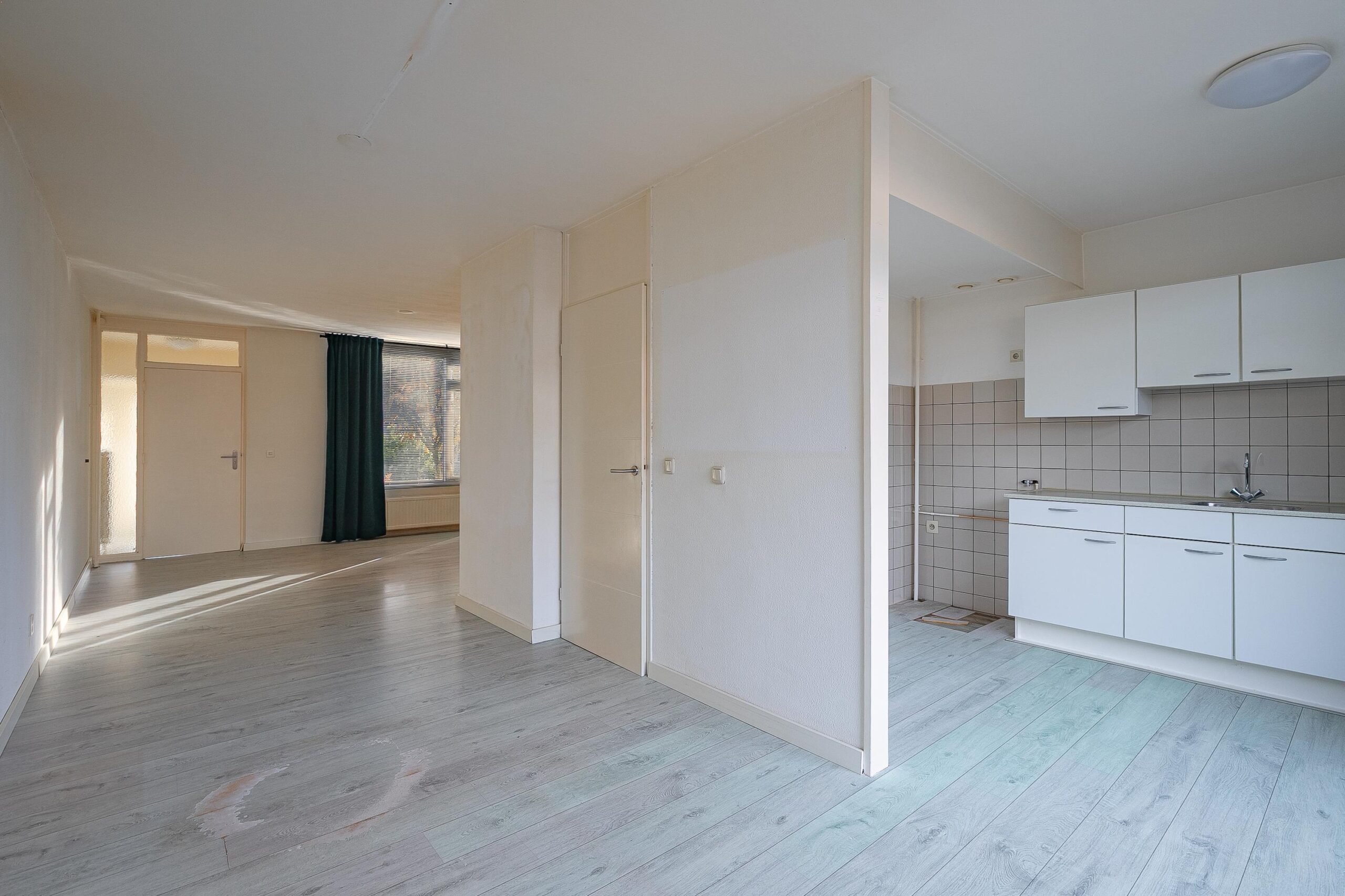 L-vormige woonkamer voorzien van laminaatvloer en bergkast. Aan achterzijde gelegen open keuken voorzien van keukenblok en toegang tot de tuin. Toiletruimte met toilet en fonteintje.