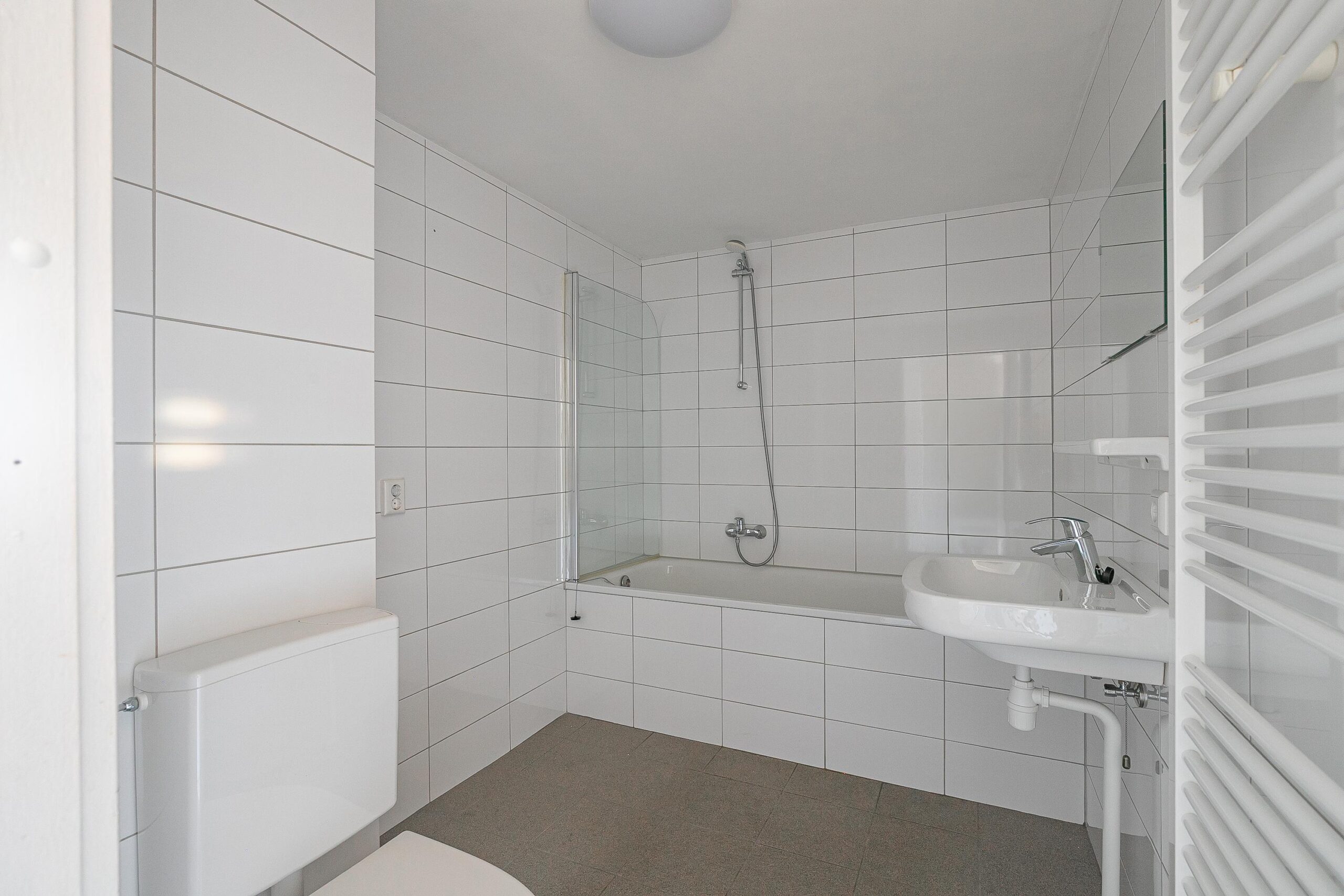 Geheel betegelde badkamer 2.78 x 1.96 voorzien van ligbad met douchescherm, wastafel, toilet, aansluitpunten witgoed en designradiator.