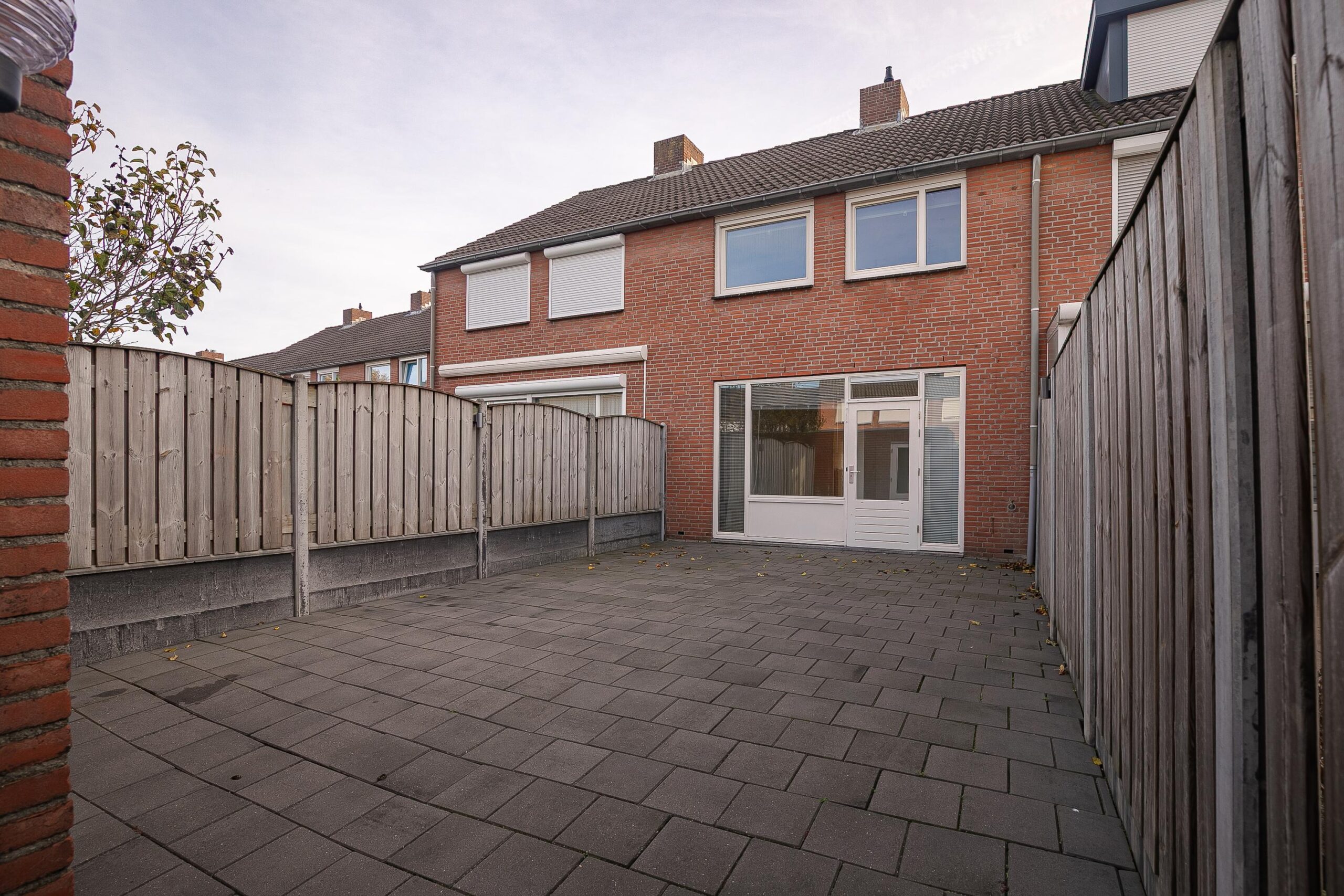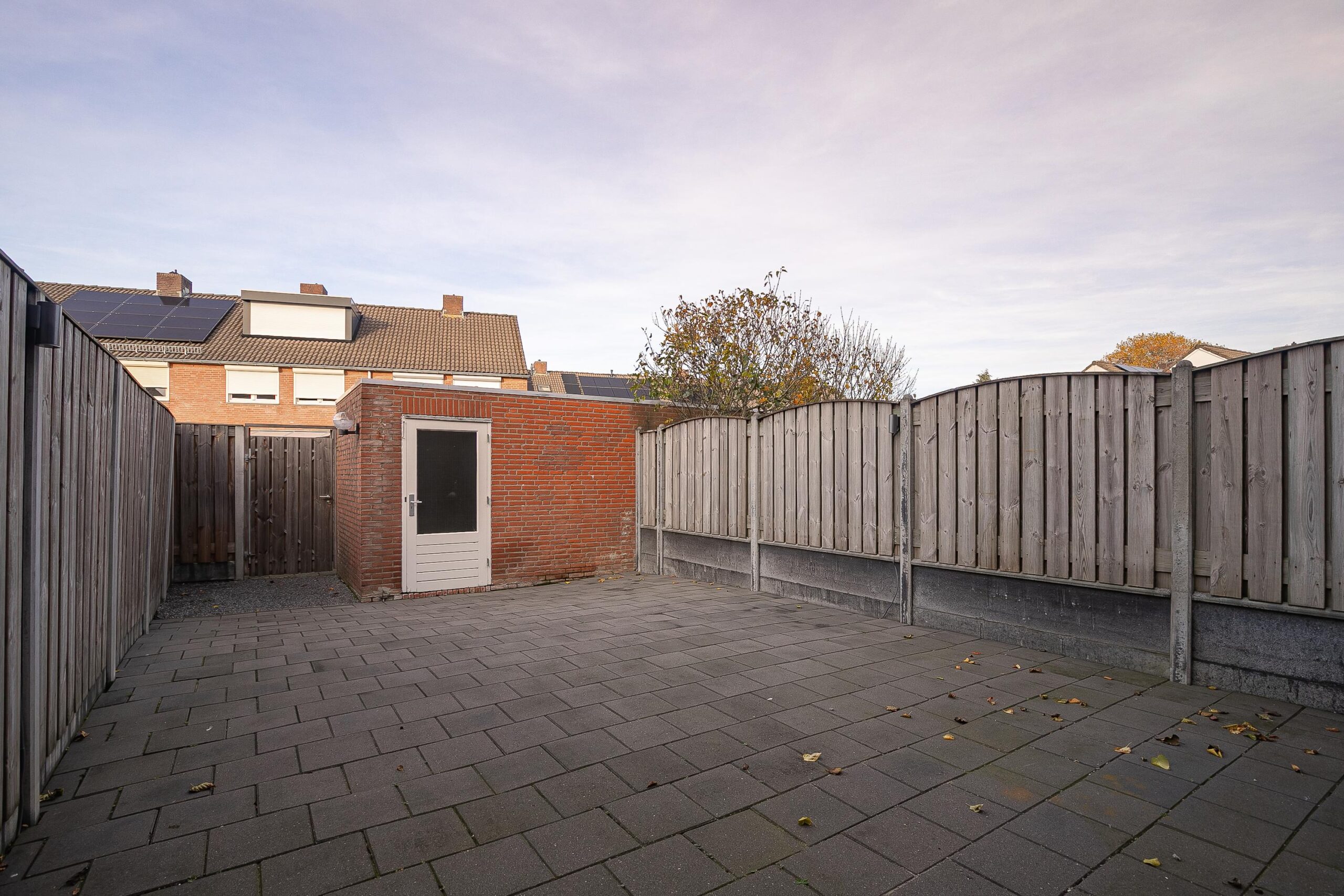 Geheel beklinkerde tuin met tuinberging en nette schutting aan weerszijden. Tevens is de tuin achterom bereikbaar.