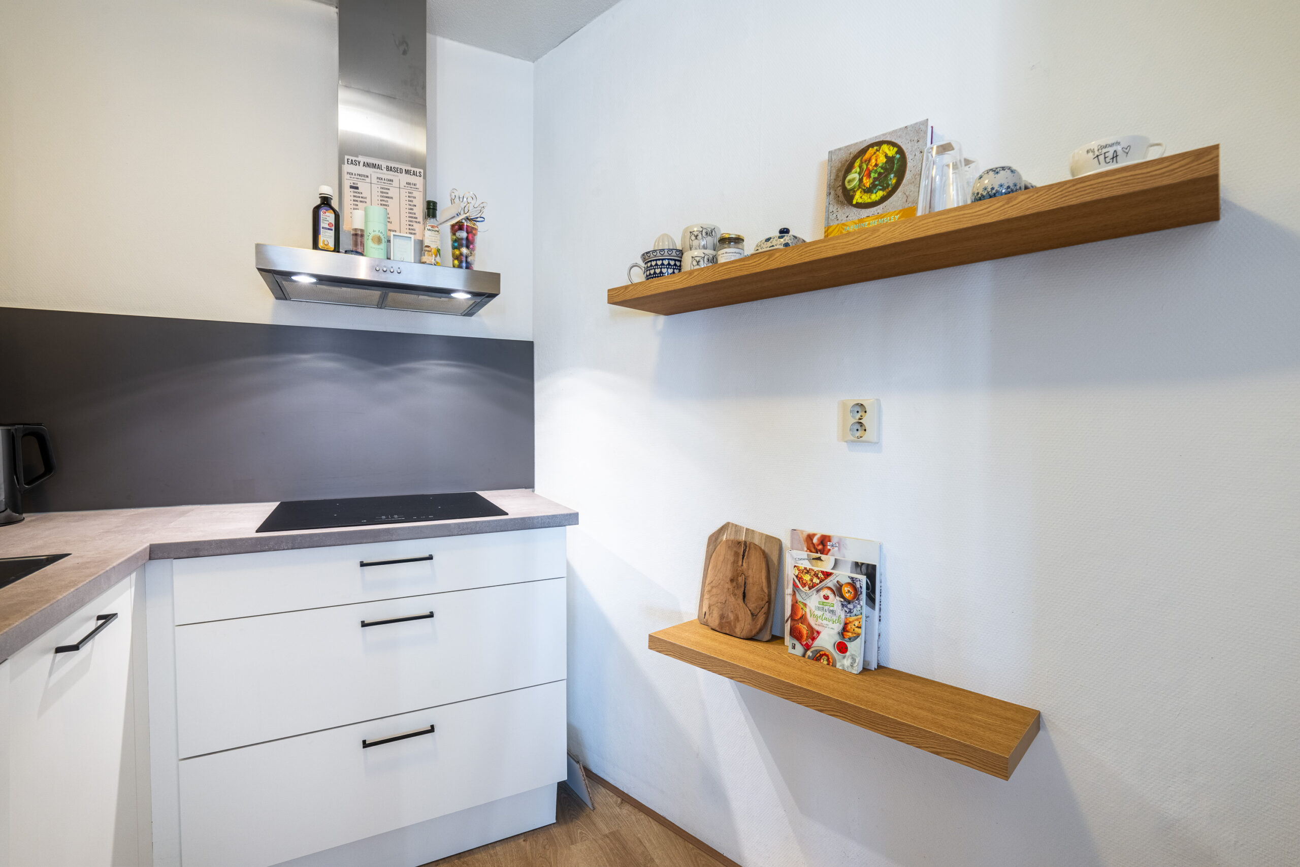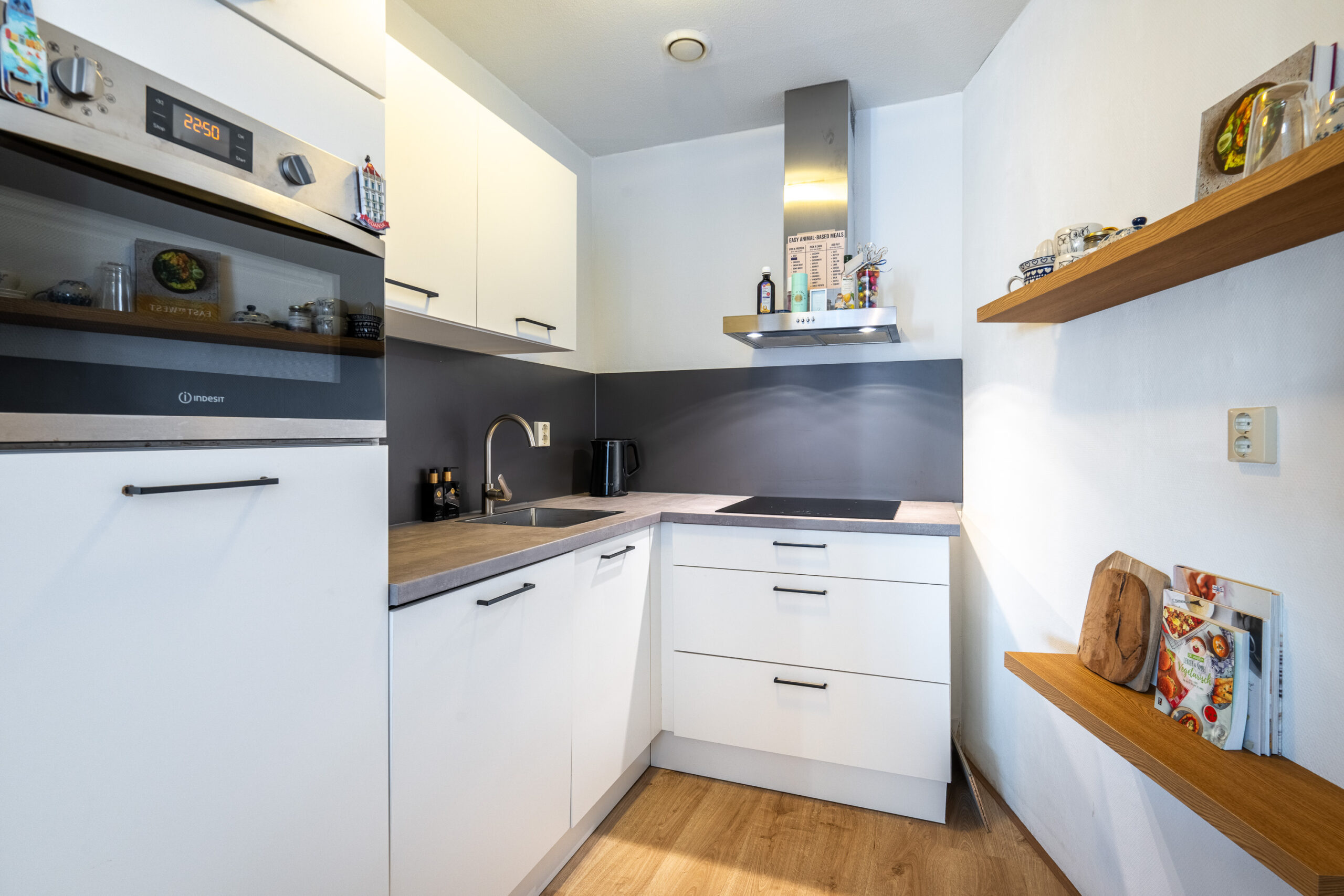 Ruime L-vormige woonkamer met erker op doorlopende laminaatvloer. Open keuken met moderne installatie in hoekopstelling en voorzien van inbouw apparatuur waaronder koelkast met vriesvak, inductiekookplaat, vaatwasser, combi-oven en afzuigkap.