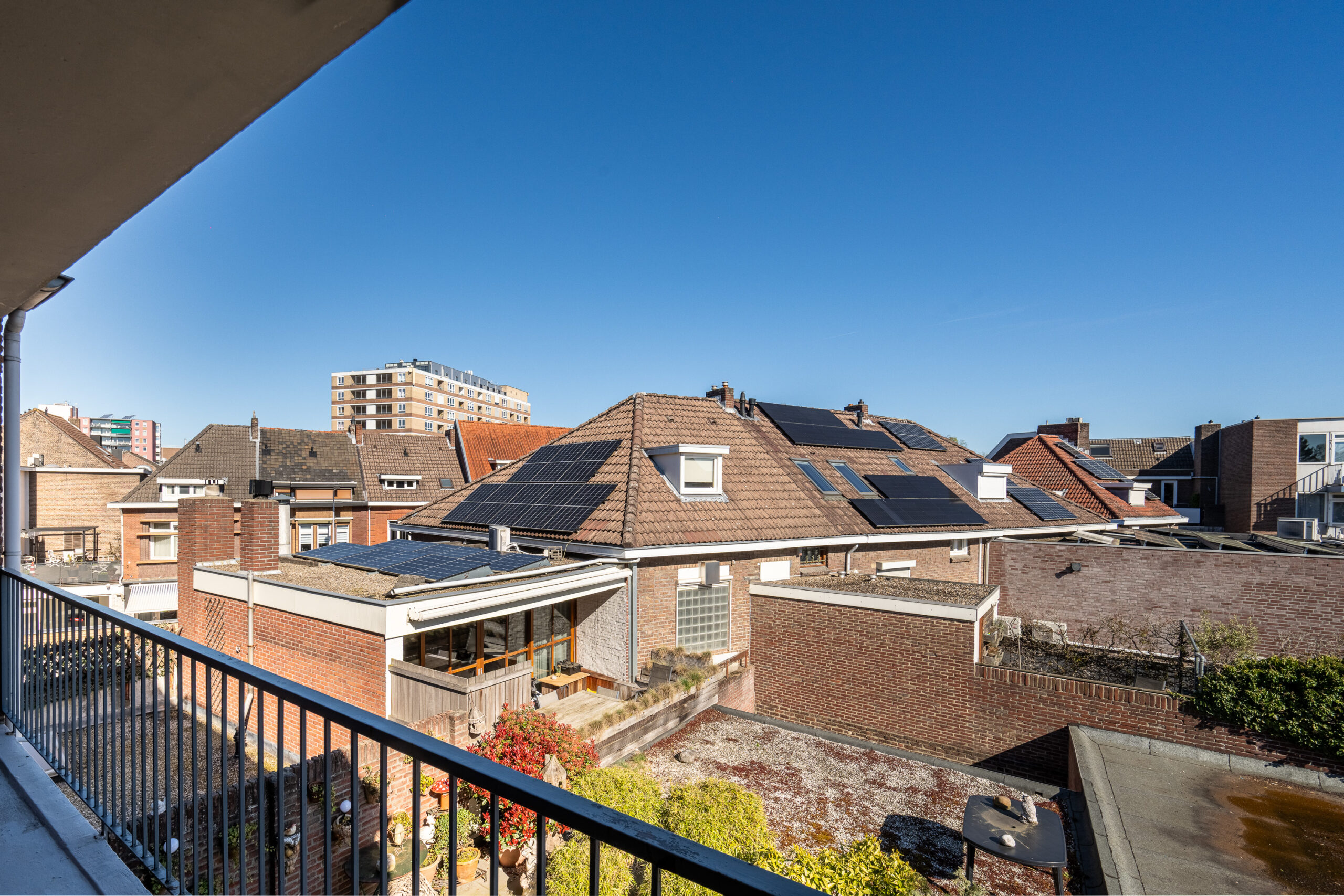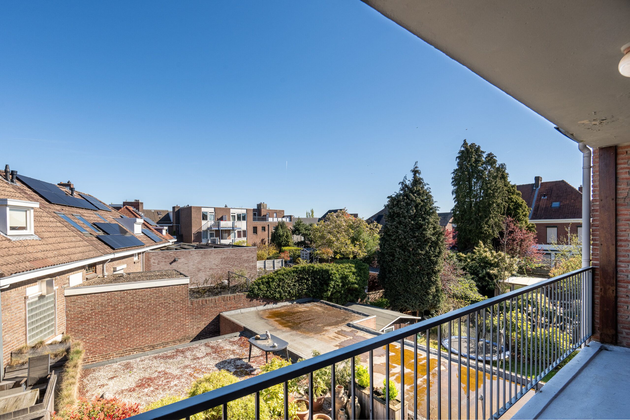 Aan de achterzijde ligt een overdekt balkon – een loggia – over de gehele breedte van de woning. het balkon biedt rust en uitzicht over tuinen.