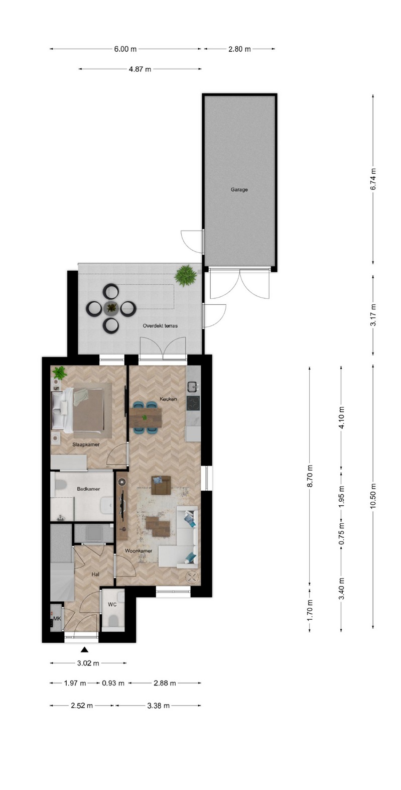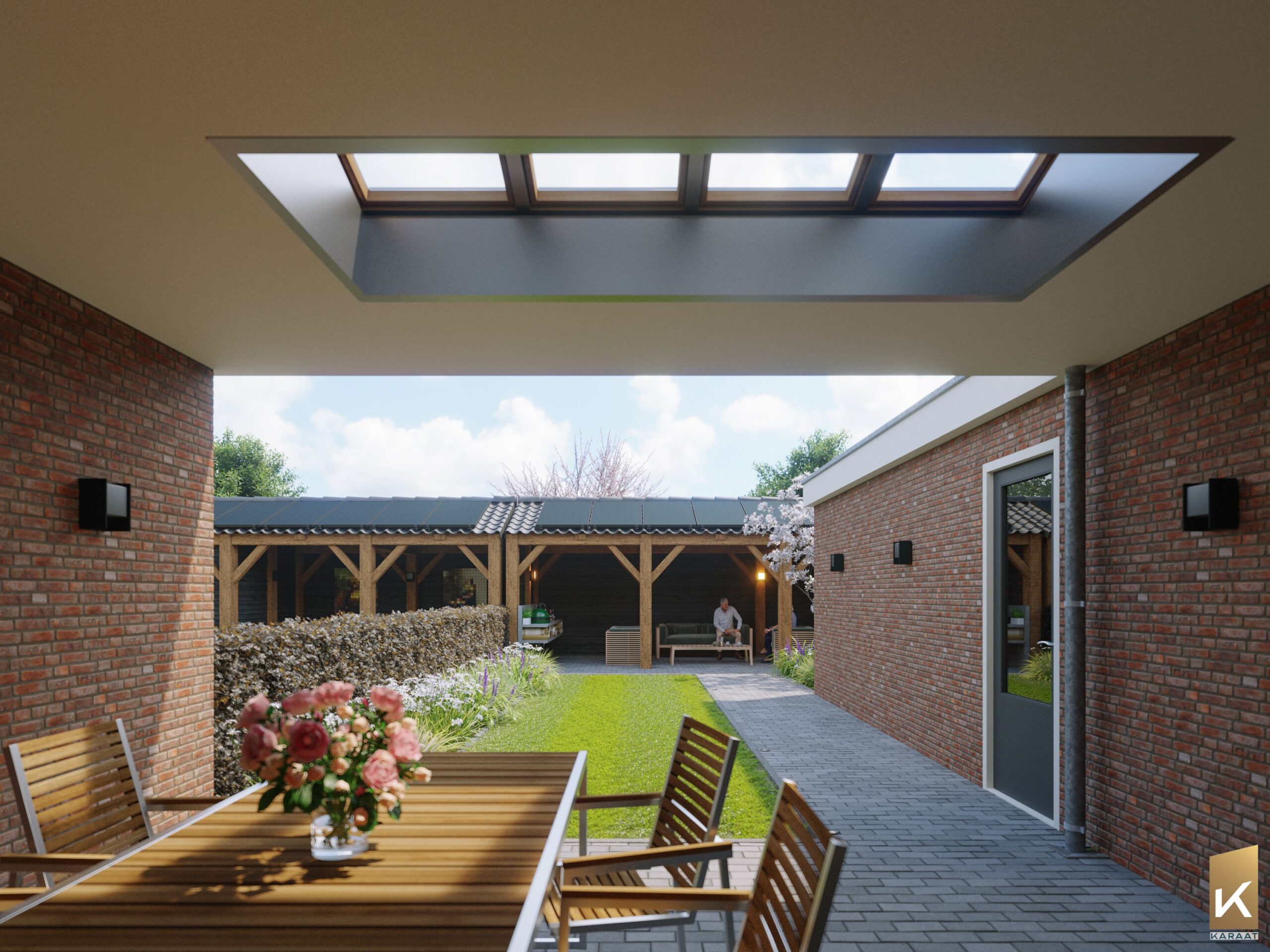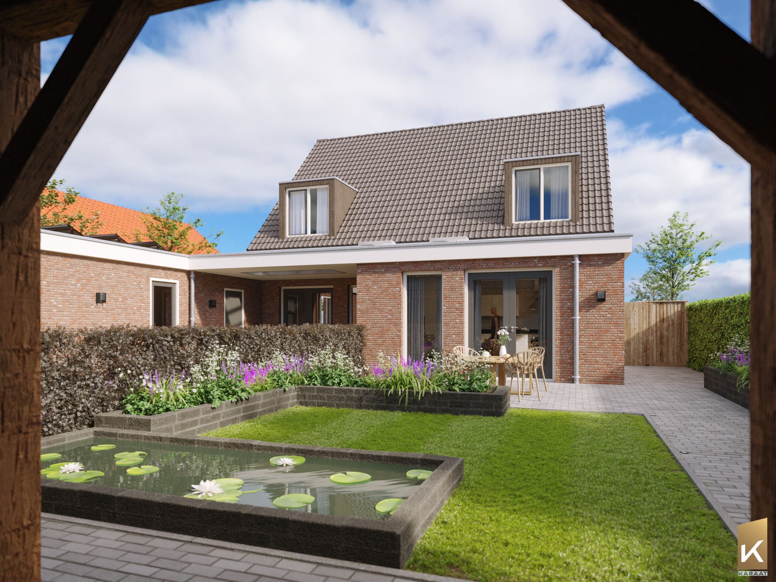 De achtertuin heeft een mooie diepte en biedt volop mogelijkheden terras, borders, bestrating, buitenverlichting, waterpartij, berging, overdekt terras direct achter de woning. Naast de woning wordt een aangebouwde garage gerealiseerd.