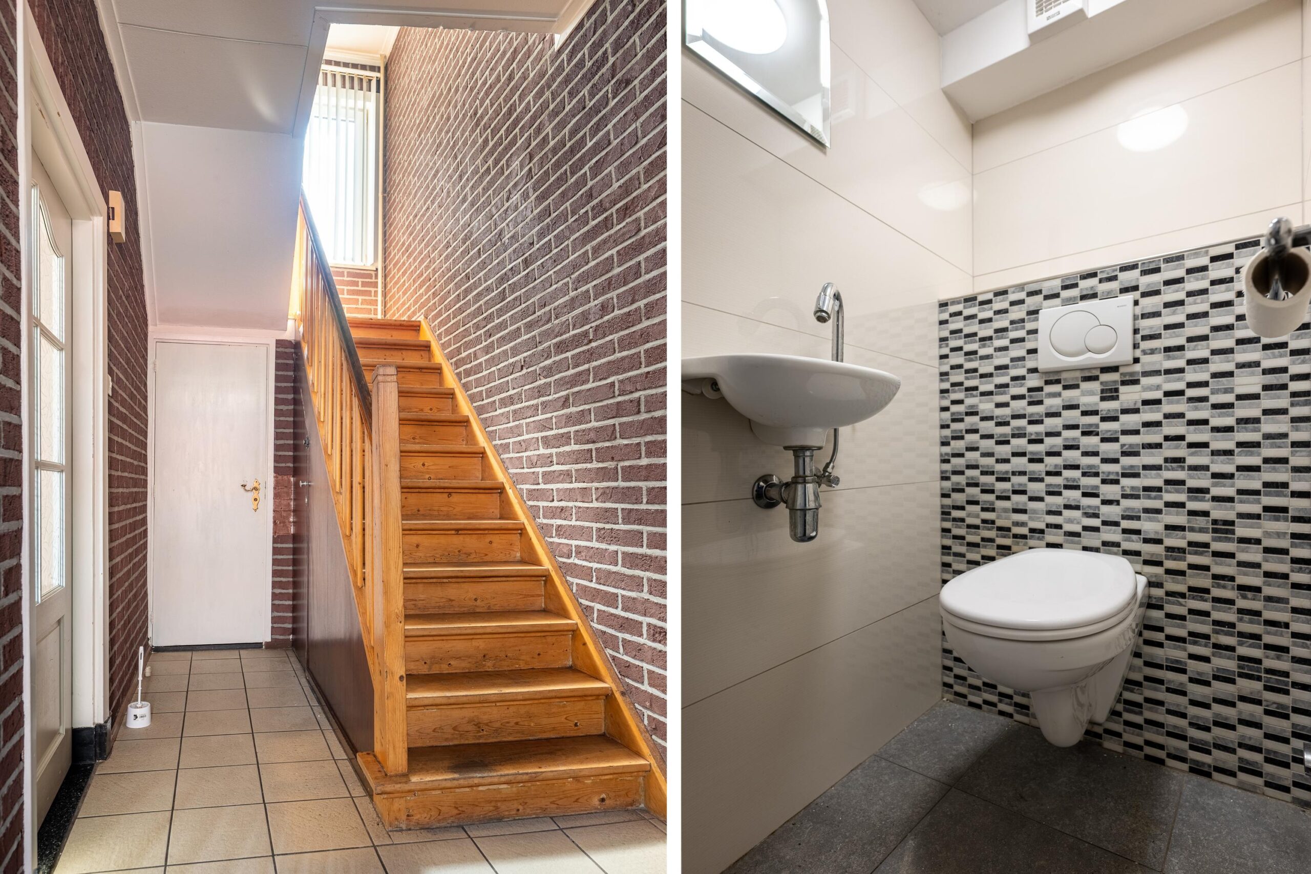 Via de overdekte entree bereikt u de hal met bordestrap naar de eerste verdieping, modern, geheel betegeld gastentoilet met fonteintje en plavuizen vloer.