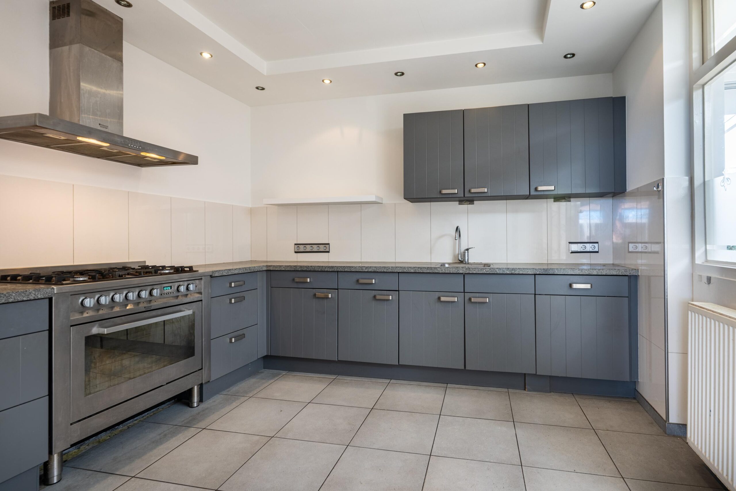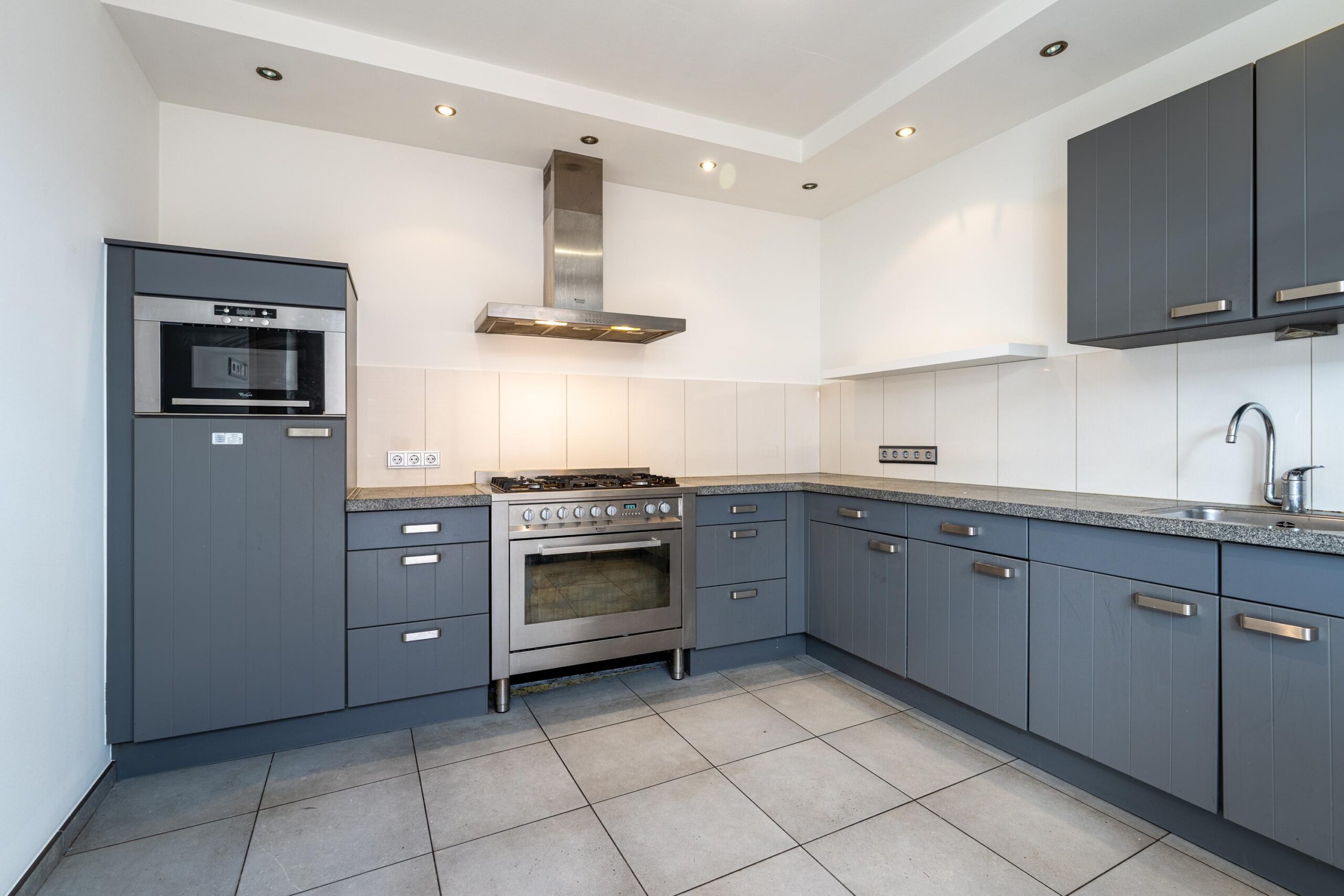 De sfeervolle woonkamer aan de voorzijde is afgewerkt met een strakke laminaatvloer en staat in open verbinding met de keuken, wat zorgt voor een ruimtelijk geheel. Aan de achterzijde bevindt zich de ruime, gesloten keuken in praktische L-opstelling, afgewerkt met een granieten werkblad en voorzien van ingebouwde verlichting. De keuken beschikt over diverse inbouwapparatuur, waaronder een magnetron, een 90 cm brede oven, een 5-pits gaskookplaat, een spoelbak, een koelkast, een RVS afzuigkap en een vaatwasser.