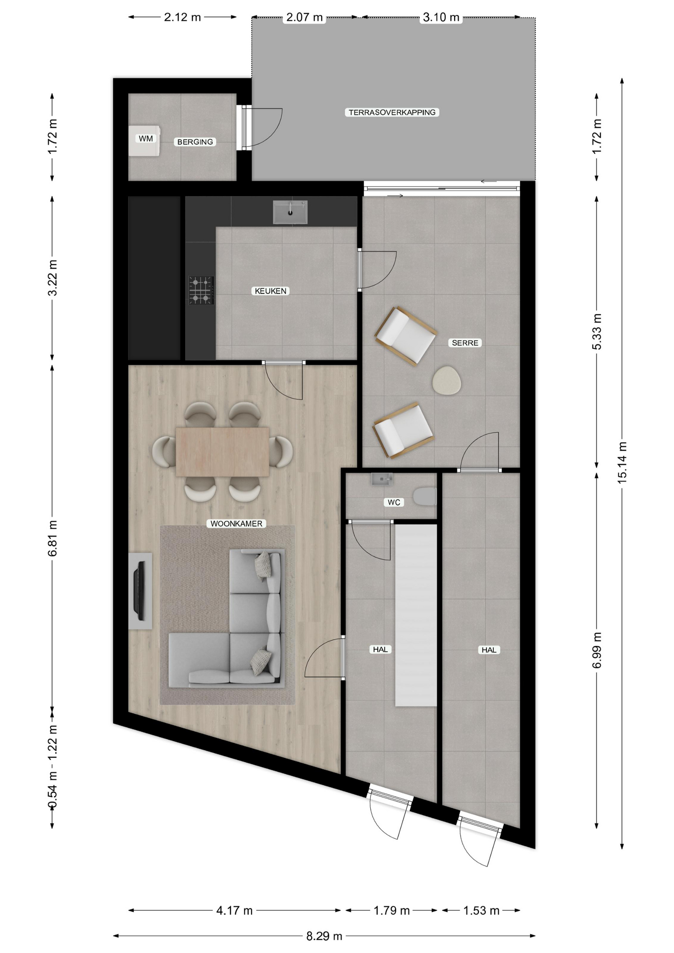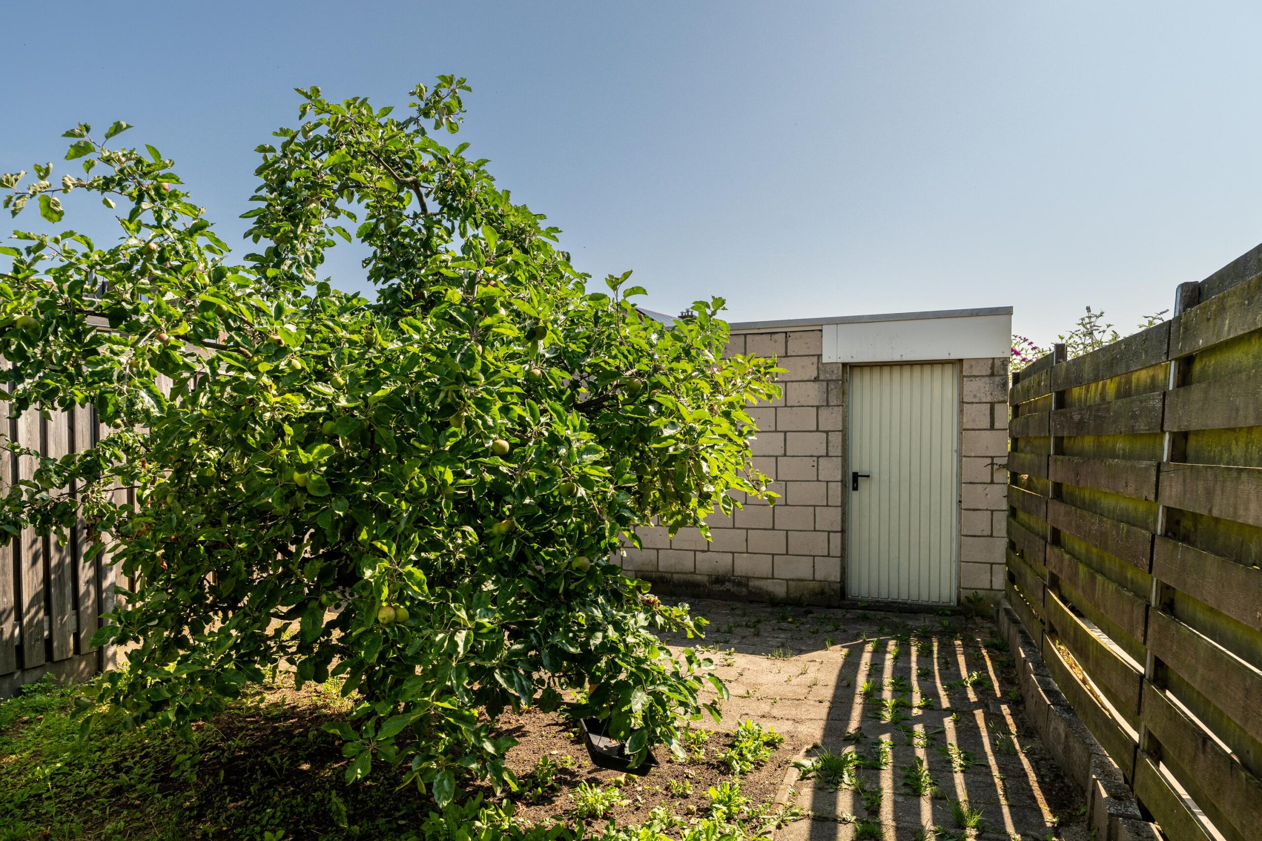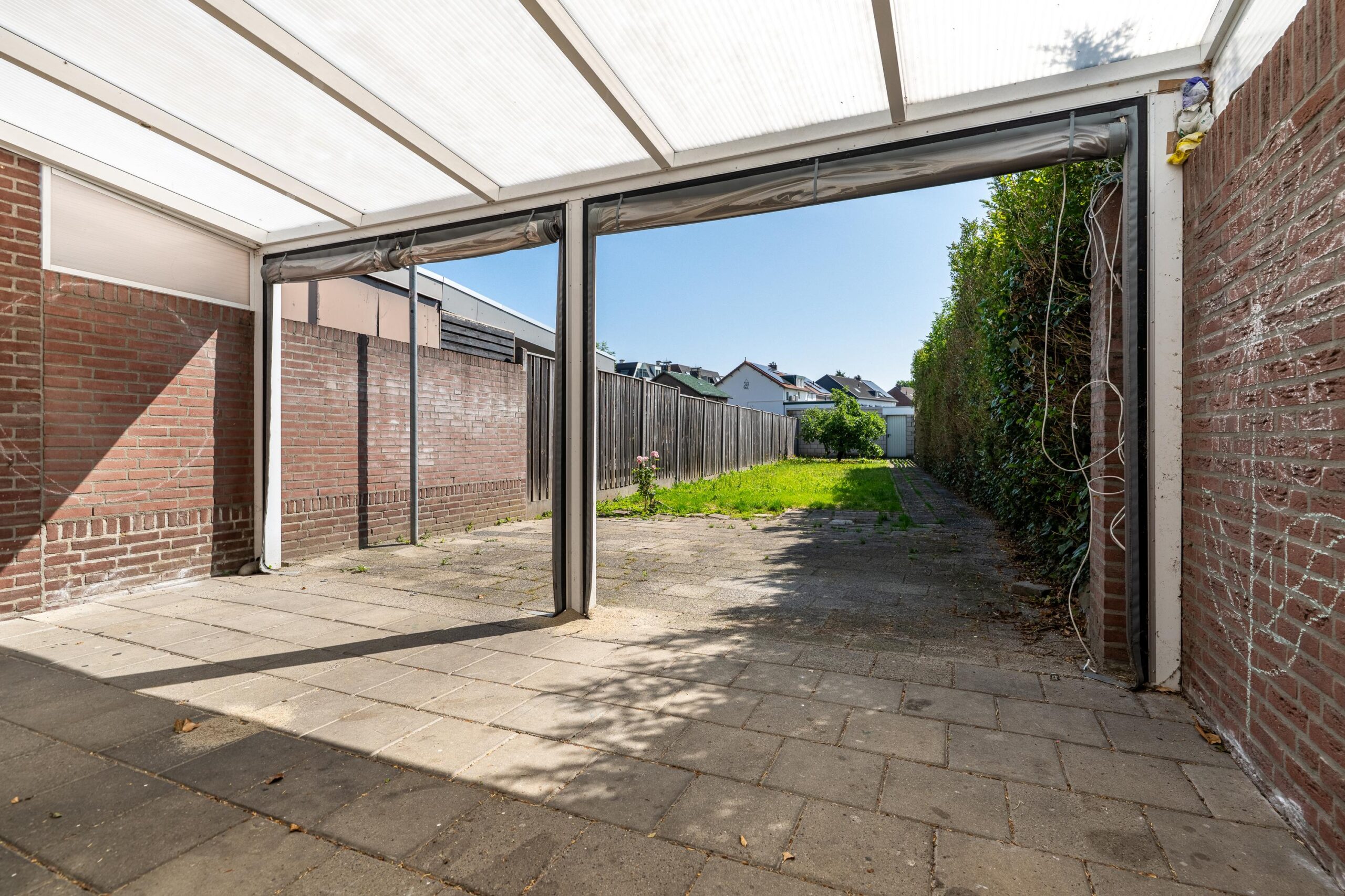 De diepe, zonnige tuin is bereikbaar via de zij-ingang, aanbouw en de garage. De tuin is geheel omsloten, biedt optimale privacy en is voorzien van een fruitboom. Onder de aluminium terrasoverkapping met geïntegreerde verlichting geniet u van elk seizoen. Achter in de tuin ligt de ruime garage met dubbele toegang via poort en loopdeur.