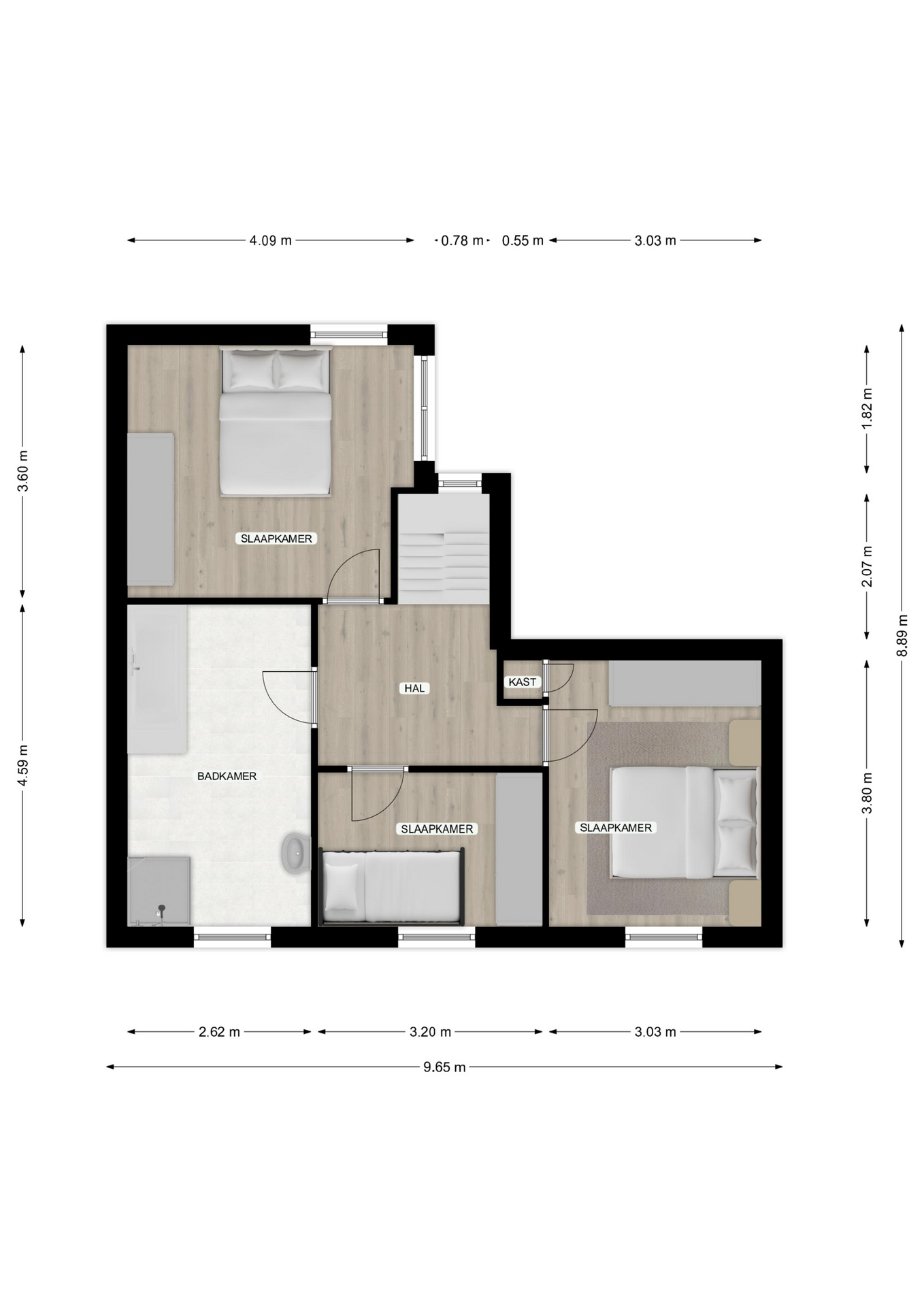 De overloop biedt toegang tot drie ruime slaapkamers, allen voorzien van parketvloeren en grote raampartijen voor veel lichtinval. De slaapkamers zijn respectievelijk: