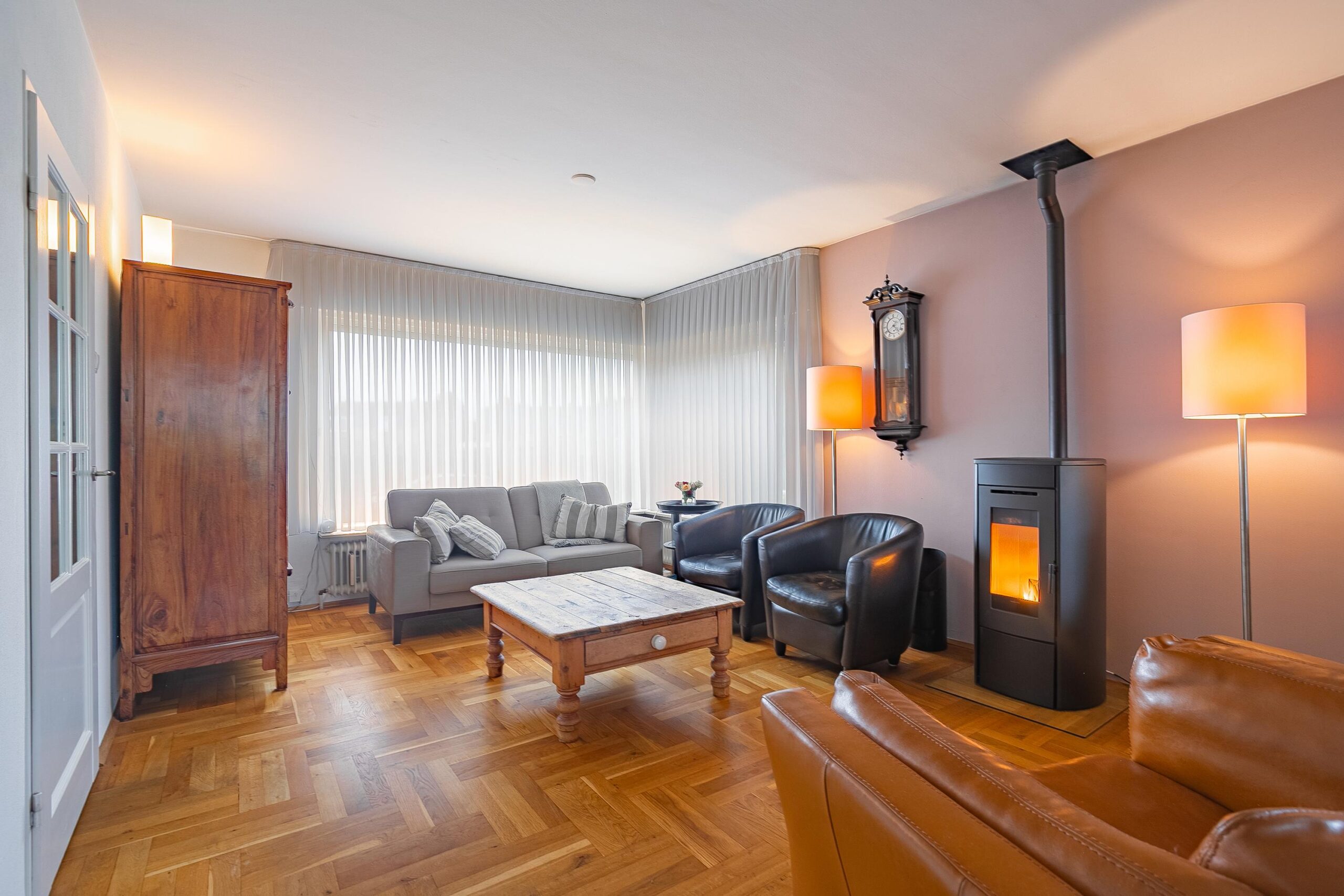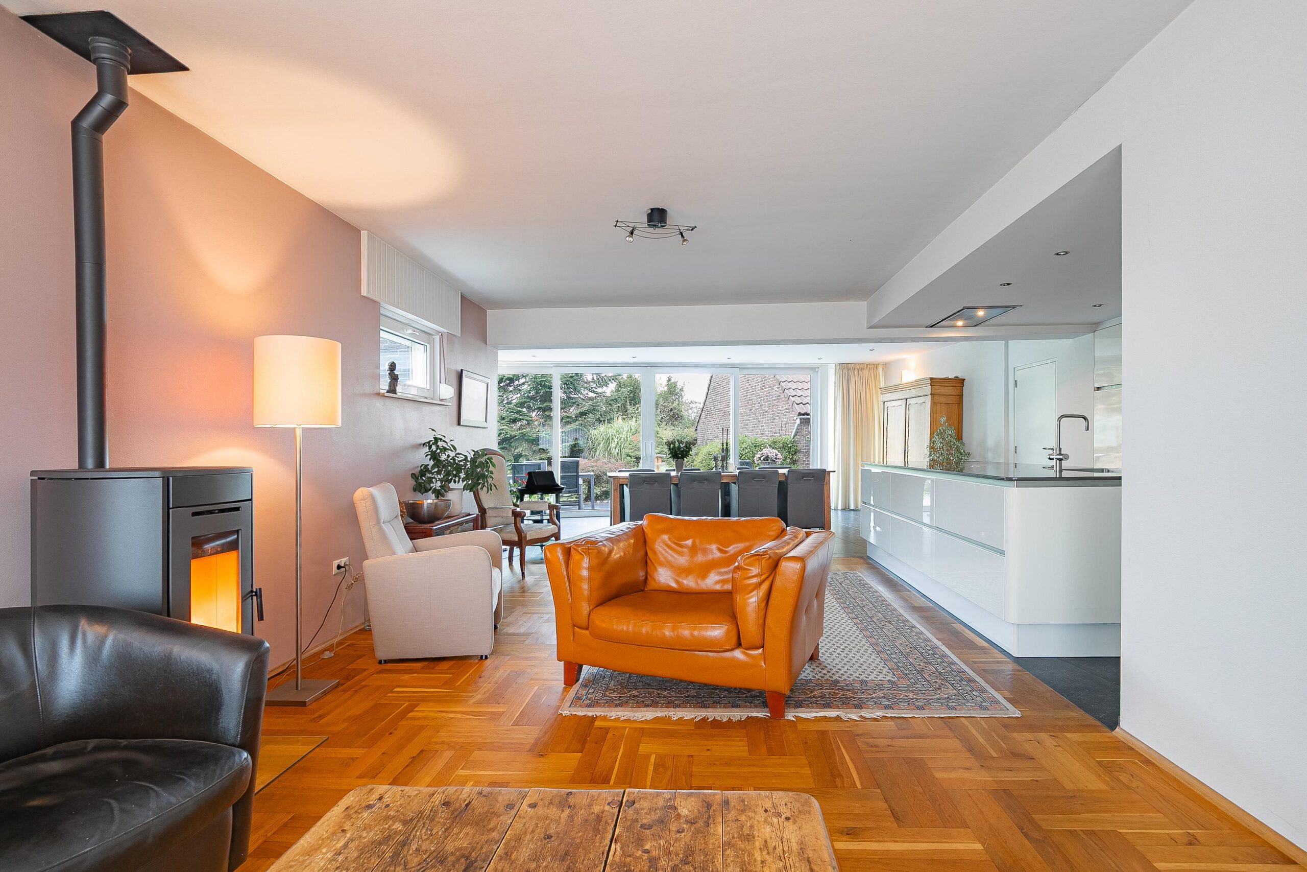 De woonkamer is voorzien van een parketvloer met vloerisolatie en een pelletkachel, de aanbouw met een moderne