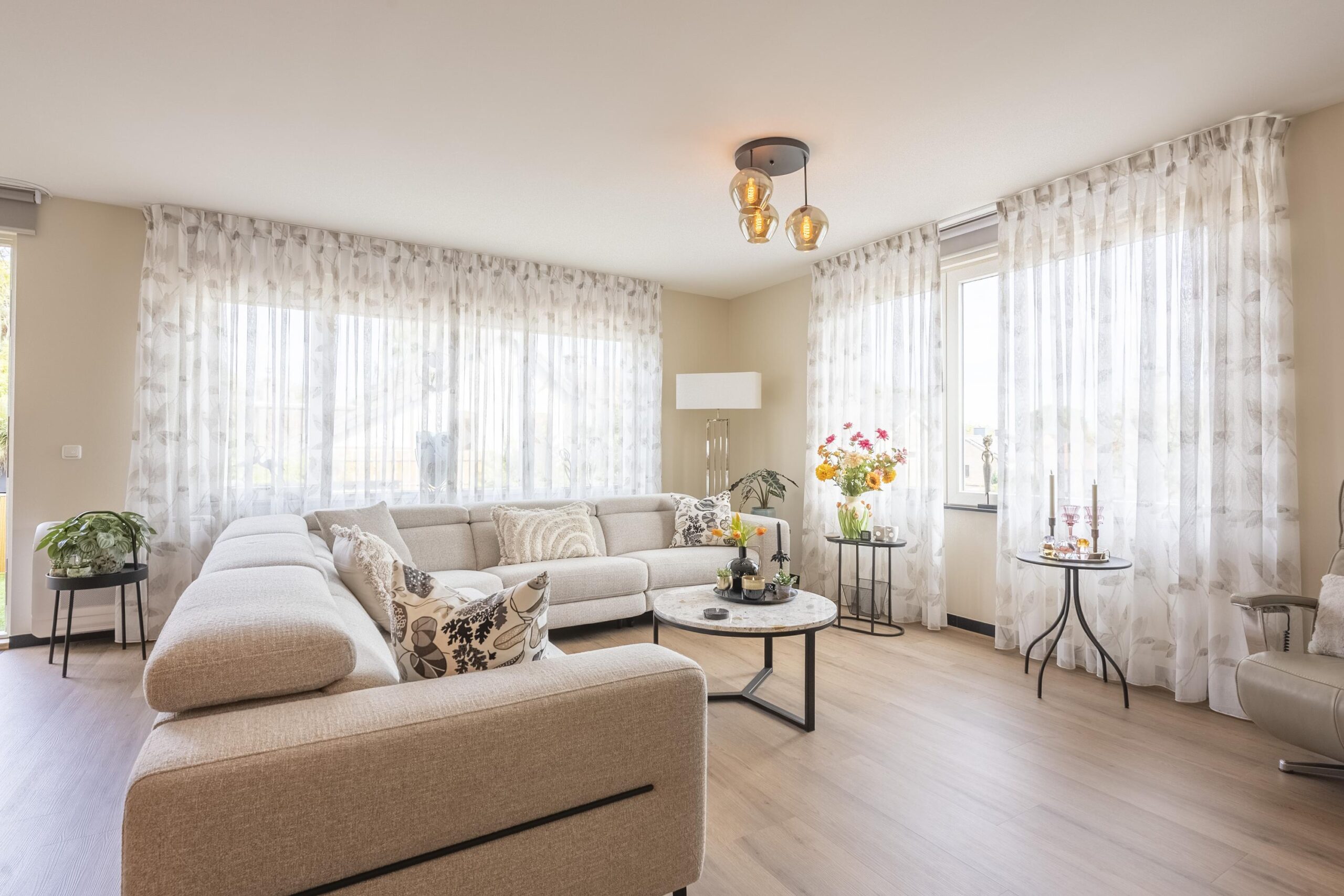 De ruime L-vormige woonkamer met open keuken is groot ca. 45 m² en biedt toegang tot het dakterras.