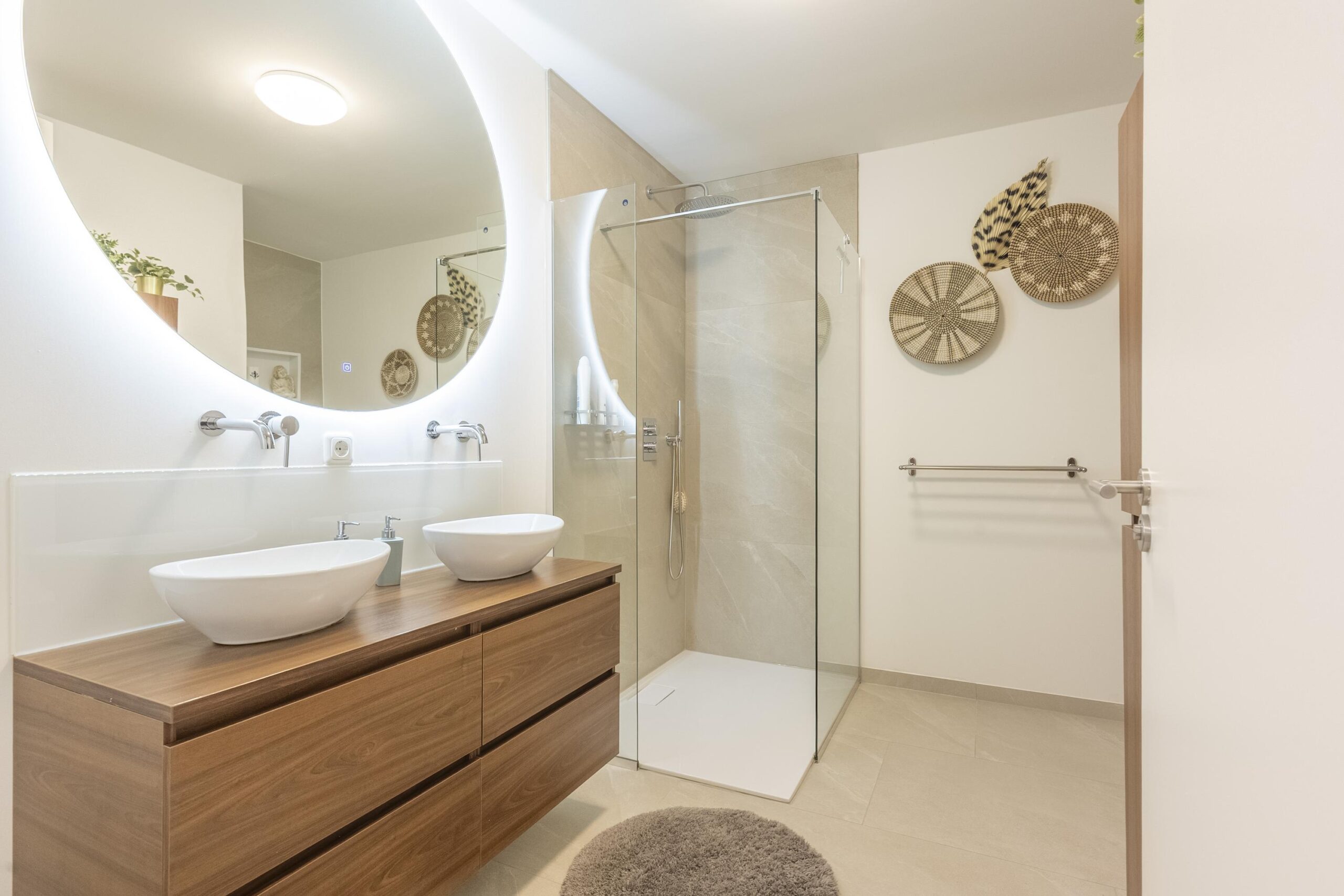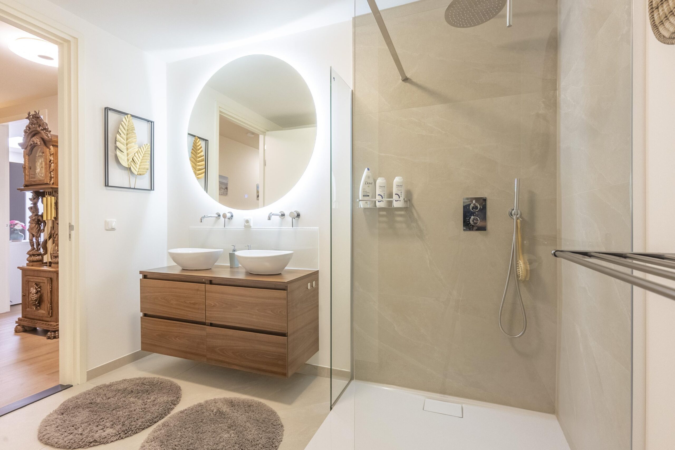 De moderne badkamer ca. 7 m² groot is voorzien van een inloopdouche, zwevend toilet, een dubbele vaste wastafel en verwarmde spiegel.