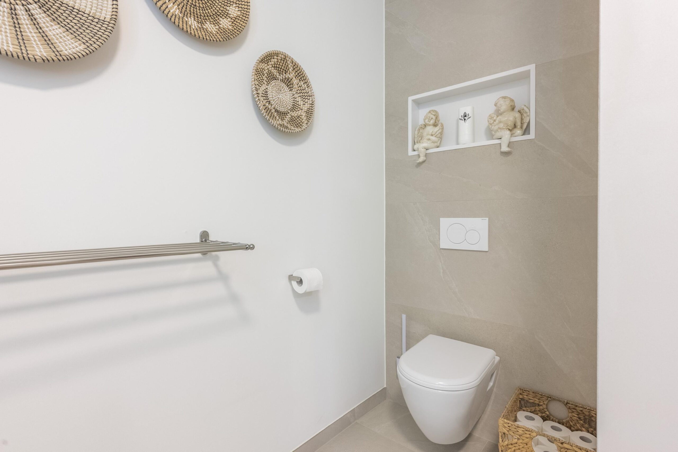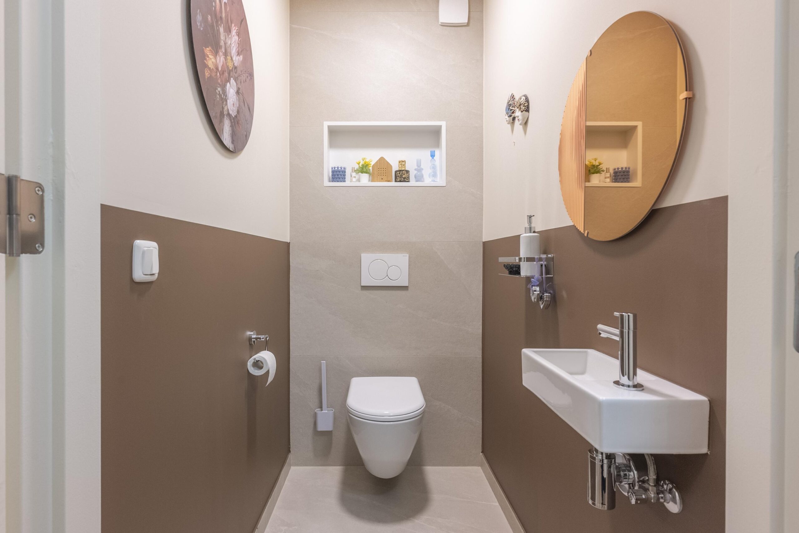 Vanuit de hal heeft men tevens toegang tot het moderne gastentoilet met zwevend toilet en fonteintje.