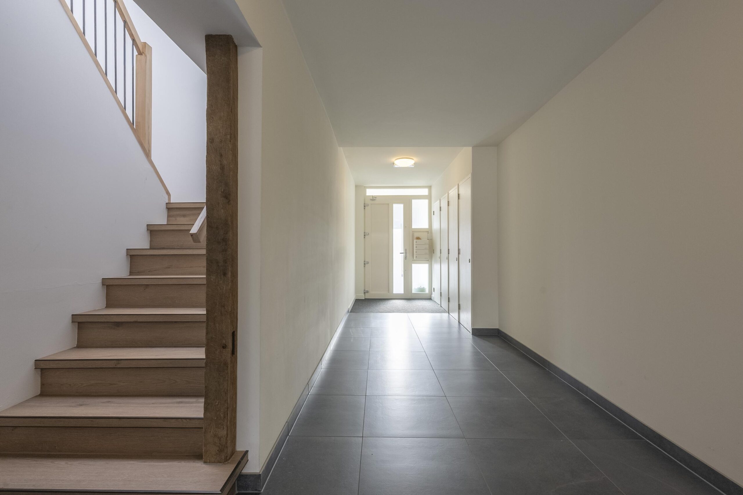 Overdekte entree met bellentableau. Centrale hal met intercom, brievenbussen en trappenhuis.