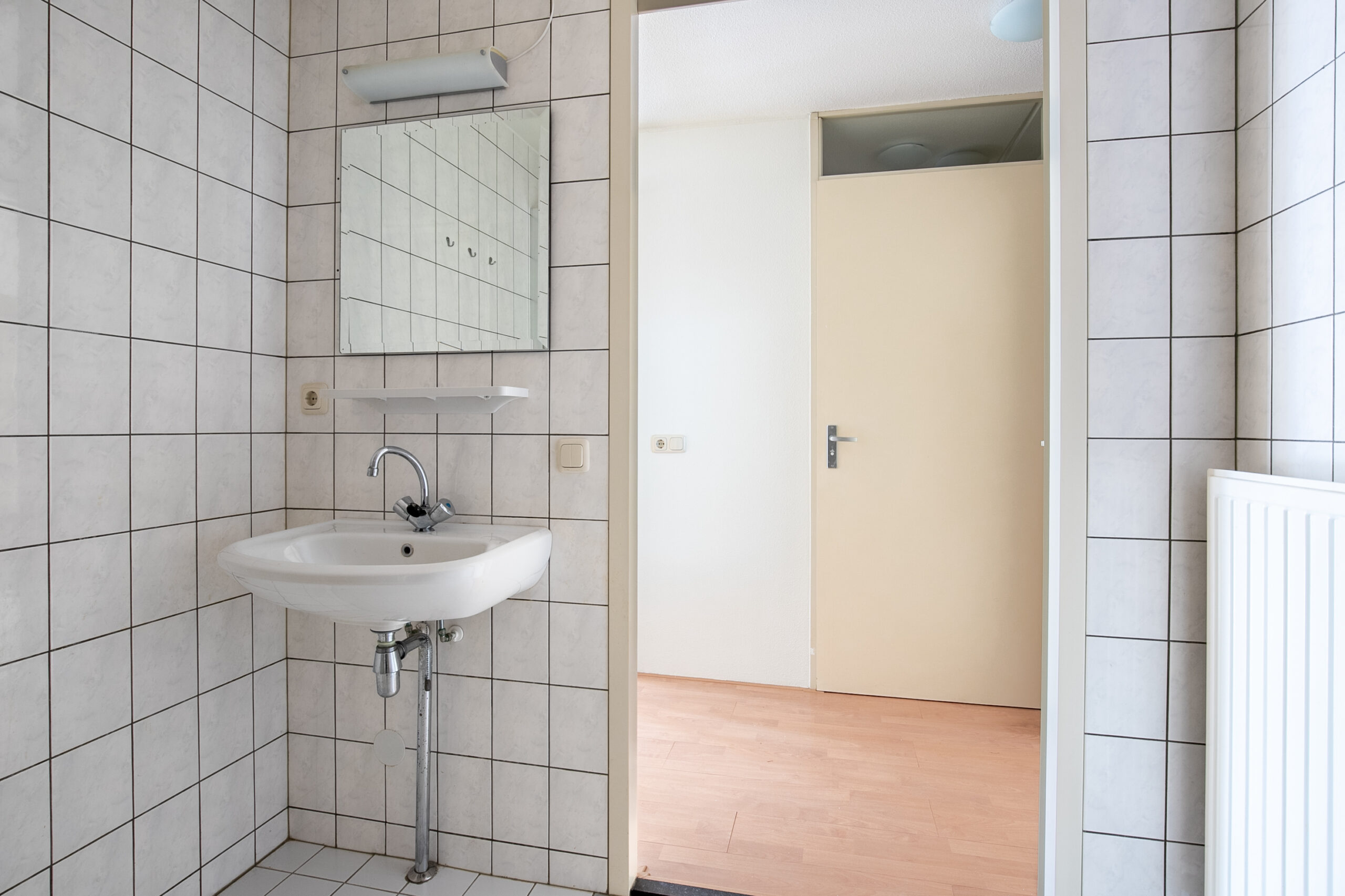 De badkamer is circa 5 m2 is volledig betegeld, en is voorzien van een douche, toilet en wastafel.