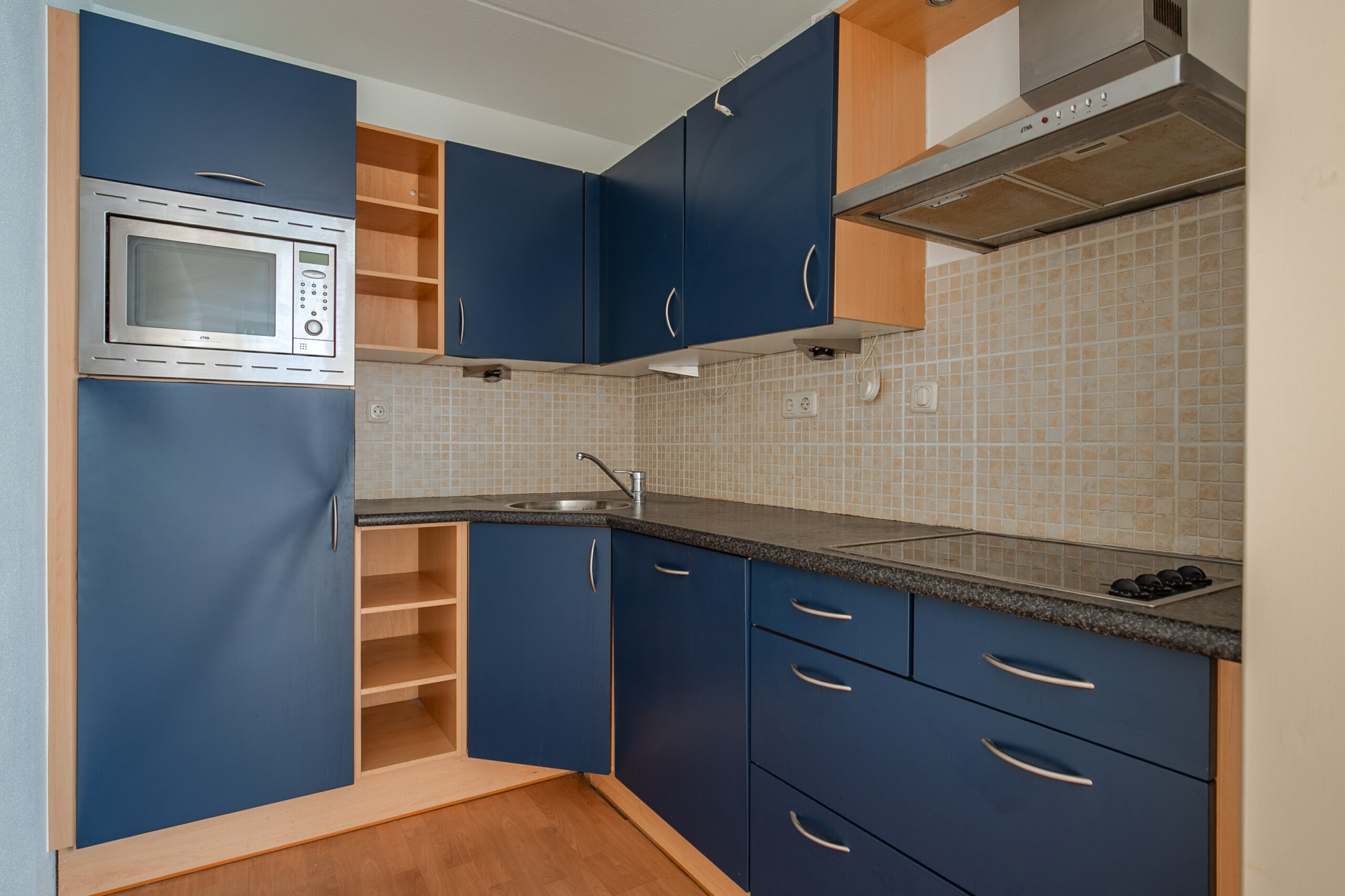 Aansluitend aan de woonkamer bevindt zich de tweede slaapkamer (ca. 6 m2) en de halfopen keuken (ca. 6 m2). De keuken is uitgerust met een vaatwasser, combi-oven, koelkast, 4 pits- inductiekookplaat en afzuigkap.