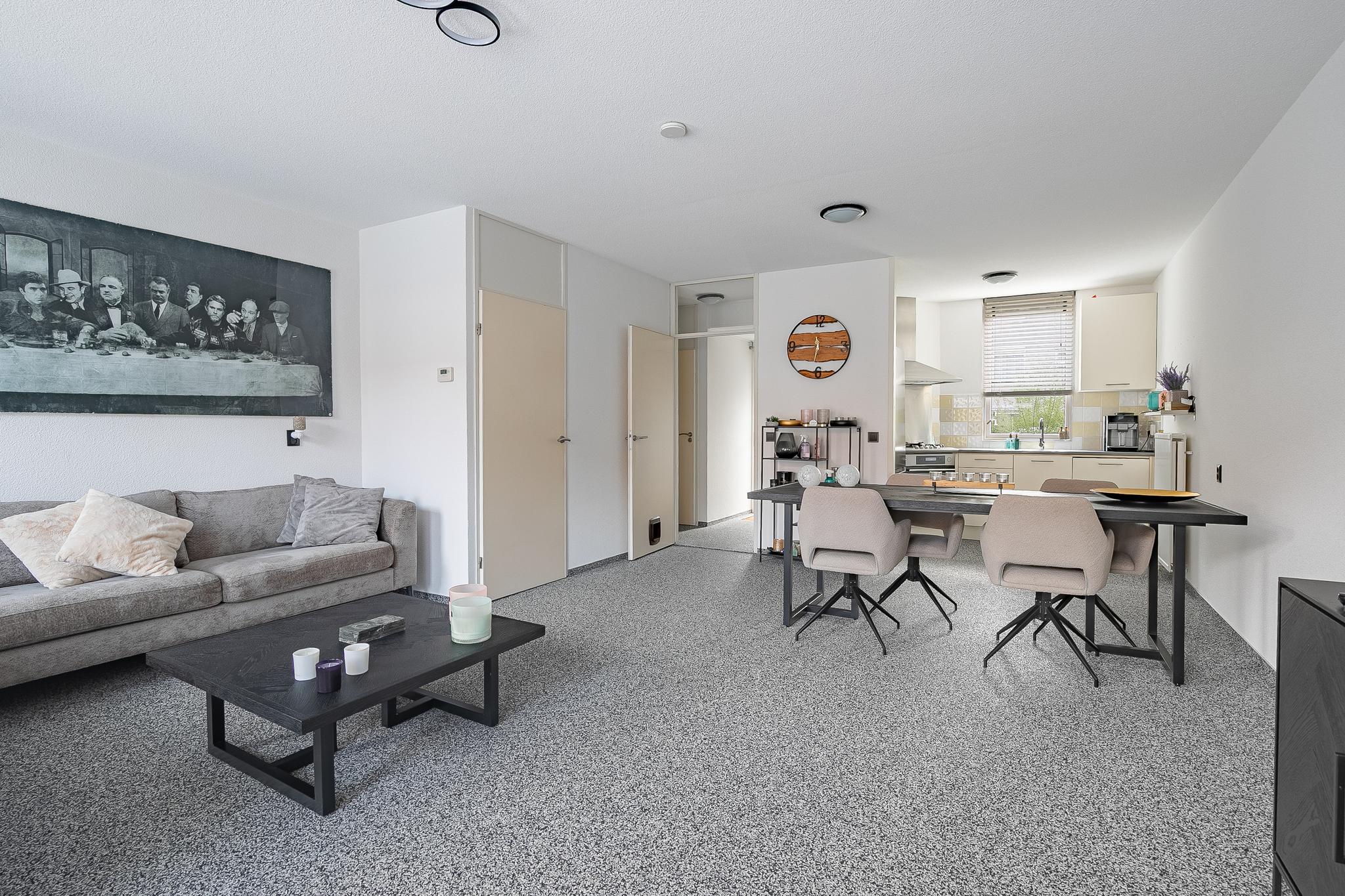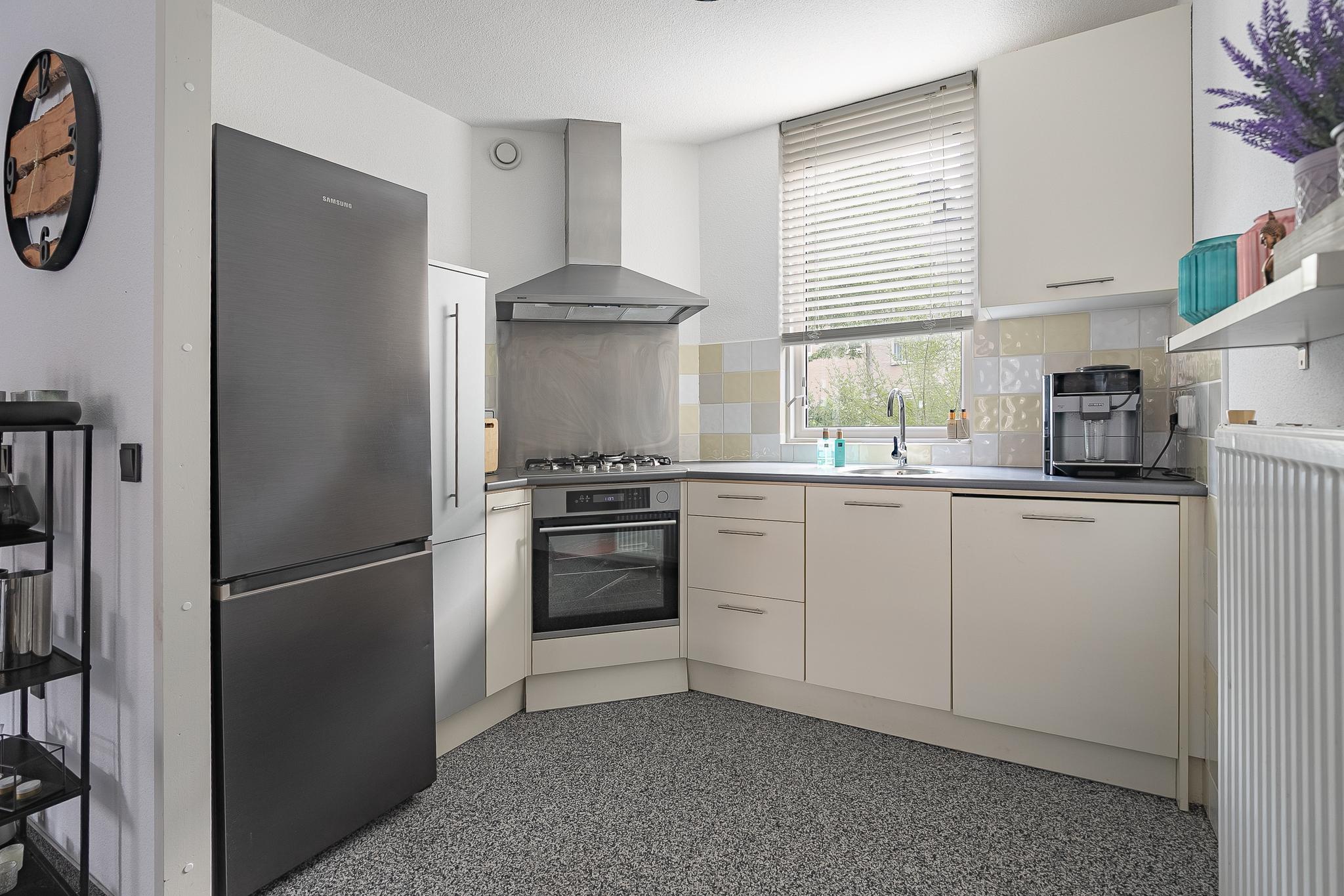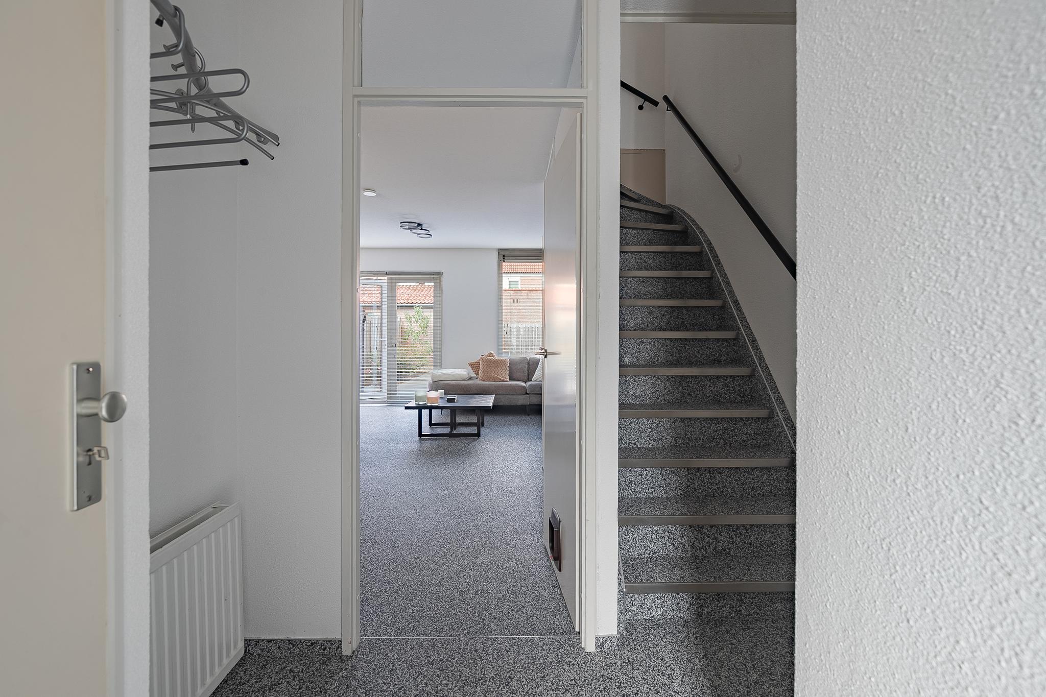 Entree. Hal met meterkast, trapopgang en deels betegelde toiletruimte met zwevend toilet. Ruime woonkamer met veel lichtinval door de grote raampartijen en bergkast. De woonkamer staat in verbinding met de open keuken en deze is voorzien van een keuken in hoekopstelling inclusief apparatuur: oven, gaskookplaat, afzuigkap en vaatwasser.