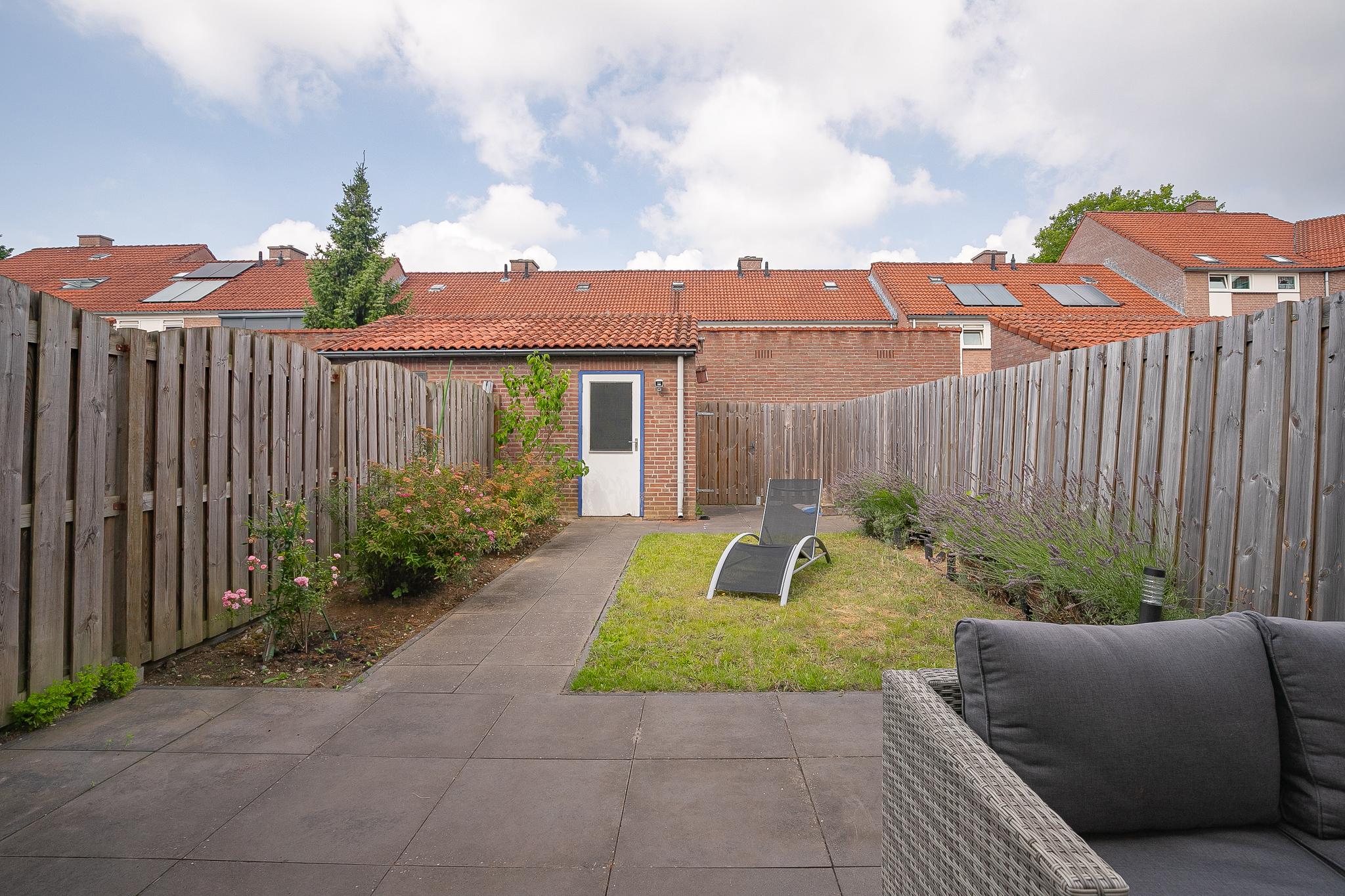 De achtertuin heeft een ruim terras met elektrisch bedienbaar zonnescherm en voetpad naar de berging en achteringang. De berging is ca. 4m2 groot en ideaal voor het stallen van fietsen of tuinmeubels. De tuin is rondom voorzien van houten schuttingen.