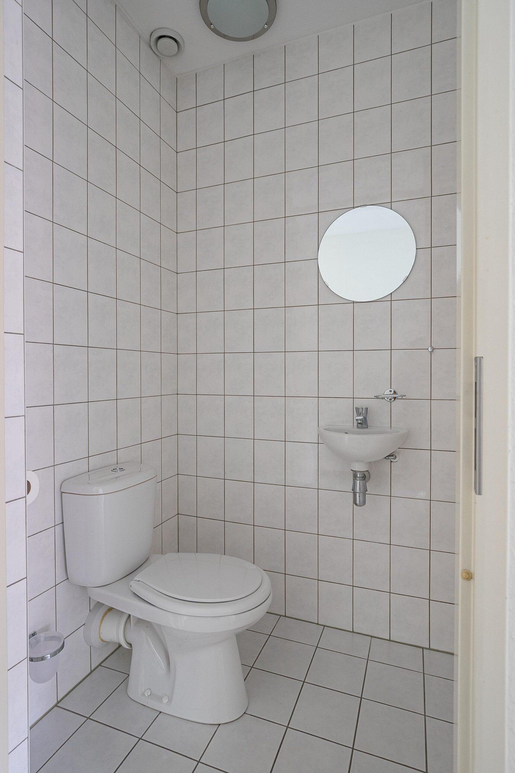 Geheel betegelde toiletruimte met toilet en fontein.