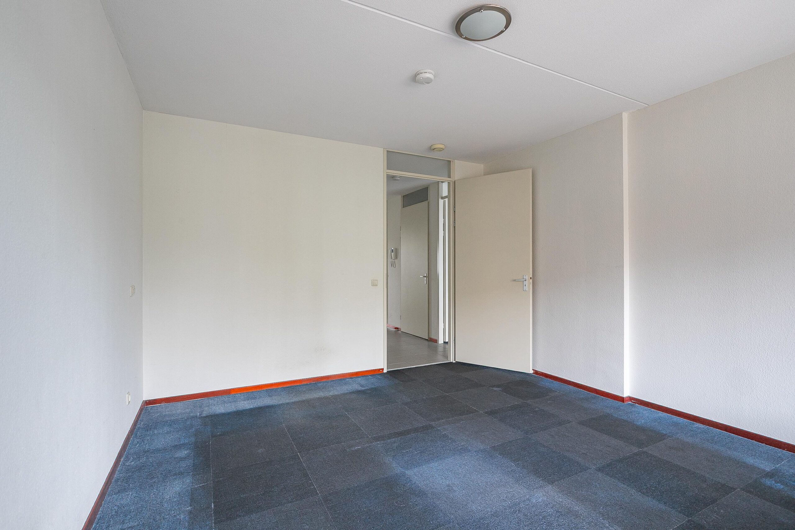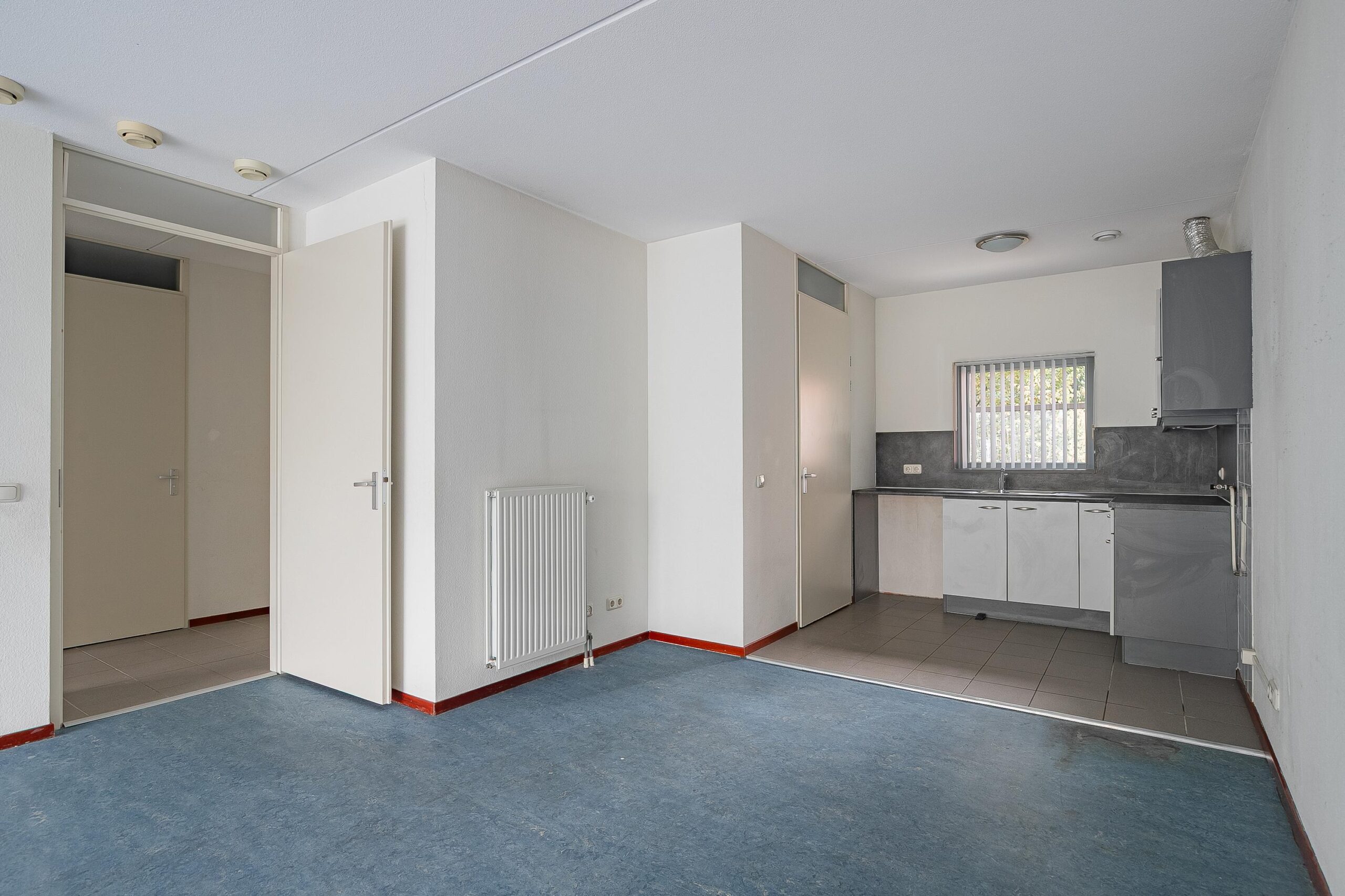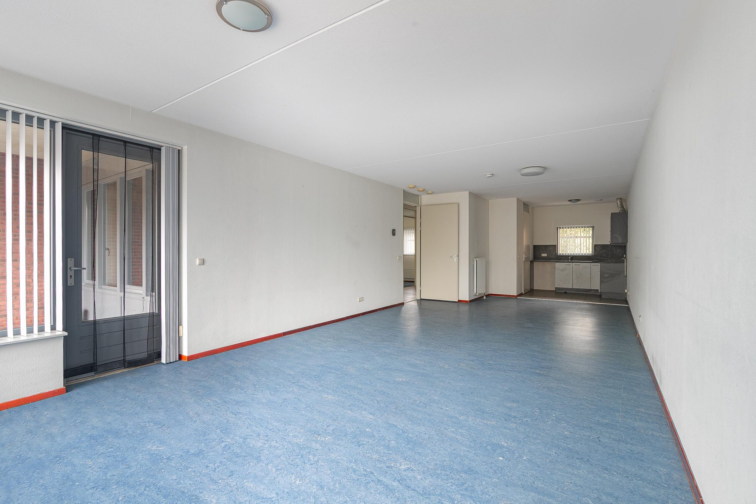Ruime woonkamer met Novilon vloer en toegang naar het inpandig balkon.
