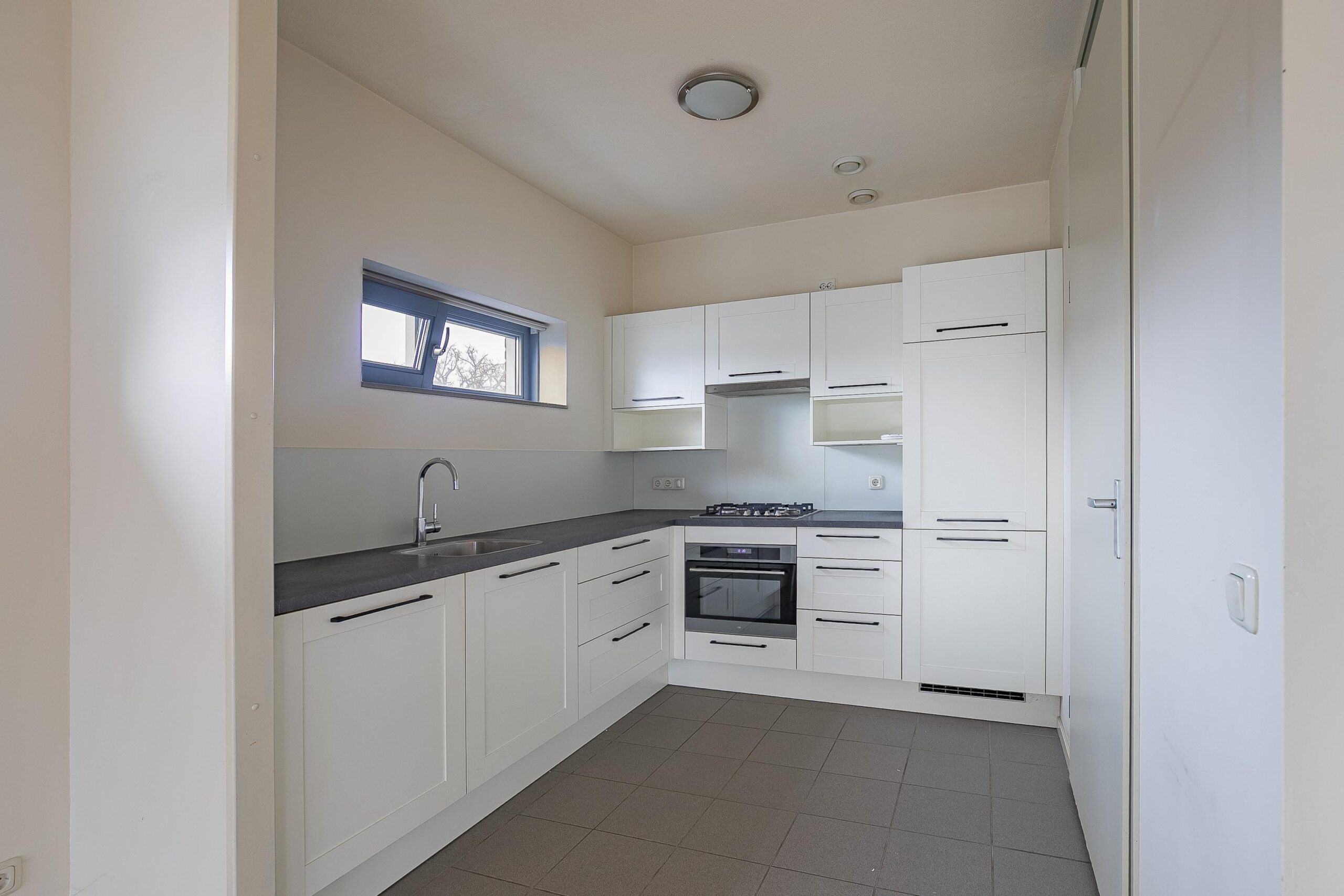Open vernieuwde keuken in L-vorm inclusief navolgende apparatuur: gaskookplaat, vaatwasser, afzuigkap, oven