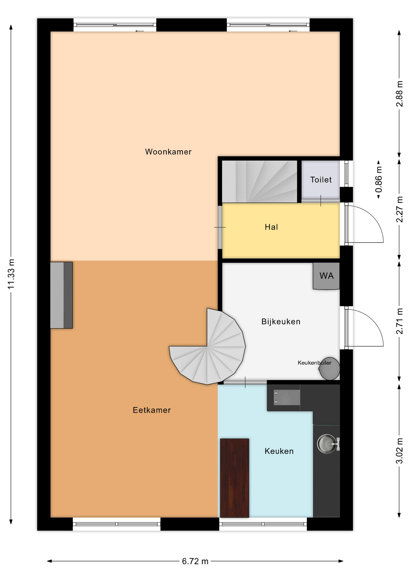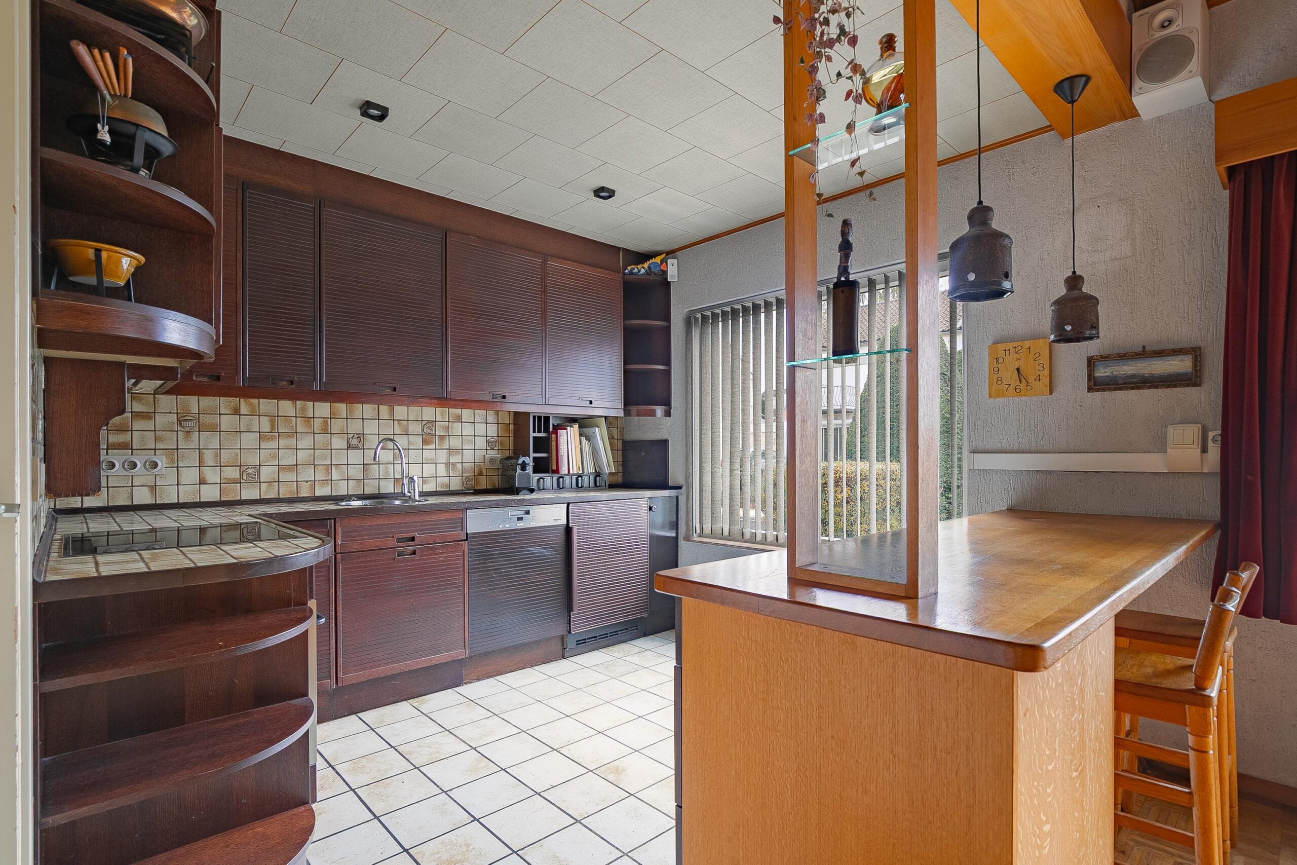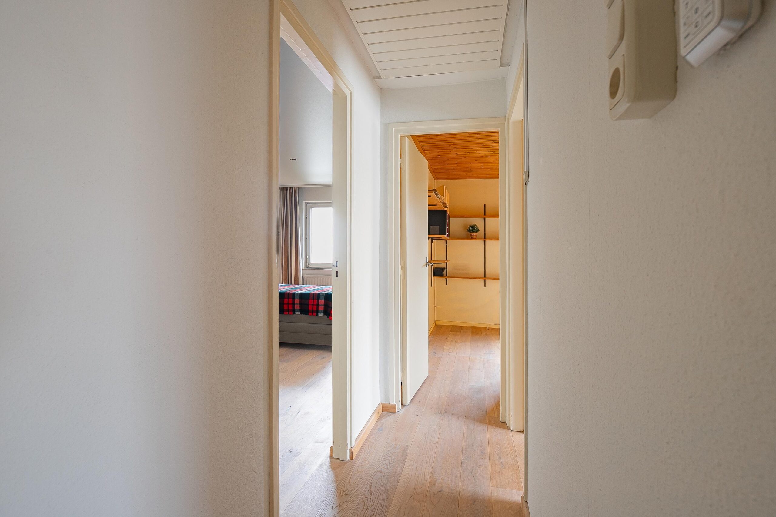 Via de entree/hal zijn de meterkast, het toilet, de trap naar de kelder en de leefruimte bereikbaar. De hal is voorzien van een donkere stenen vloer. Het toilet is volledig betegeld en uitgerust met een fonteintje. De zeer ruime doorzonkamer (ca. 56m²) beschikt over een mozaïekparketvloer, grote raampartijen en een open haard. Dankzij de twee schuifpuien in houten kozijnen is er direct toegang tot de tuin en valt veel daglicht naar binnen. De trap naar de eerste verdieping bevindt zich in de leefruimte. Aan de voorzijde is een sfeervolle vide aanwezig met een nokhoogte van circa 5,06 m, wat zorgt voor een ruimtelijk en licht karakter. De keuken (ca. 8m²), uitgevoerd in L-opstelling, is voorzien van een spoelbak, vaatwasser, oven en 4-pits inductiekookplaat. De ruimte beschikt over een plavuizen vloer en een bar met zitgedeelte. Aan deze zijde van de woning zijn kunststof kozijnen met HR++ beglazing geplaatst. Aansluitend aan de keuken ligt de bijkeuken met toegang tot de oprit. Hier bevinden zich de aansluiting voor de wasmachine en de keukenboiler (Daalderop close-in 10).