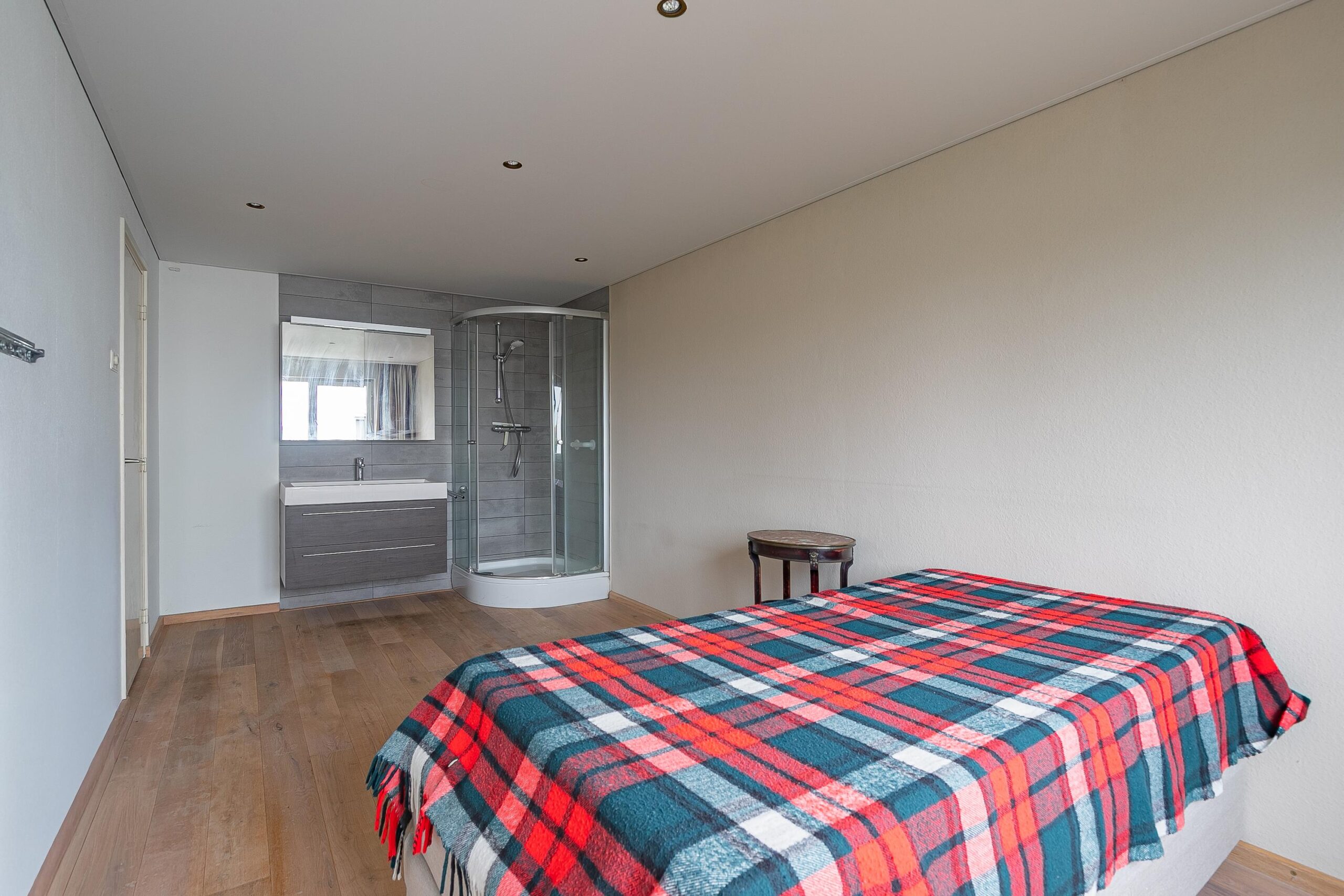 Via de wenteltrap is de eerste verdieping bereikbaar. Hier bevinden zich vier slaapkamers (ca. 14m², 12m², 11m², en 7m²) en de badkamer (ca. 4.5m²). De badkamer is volledig betegeld en uitgerust met een ligbad met douche, toilet en wastafelmeubel. In de grootste slaapkamer is tevens een aparte douche en wastafel geplaatst.