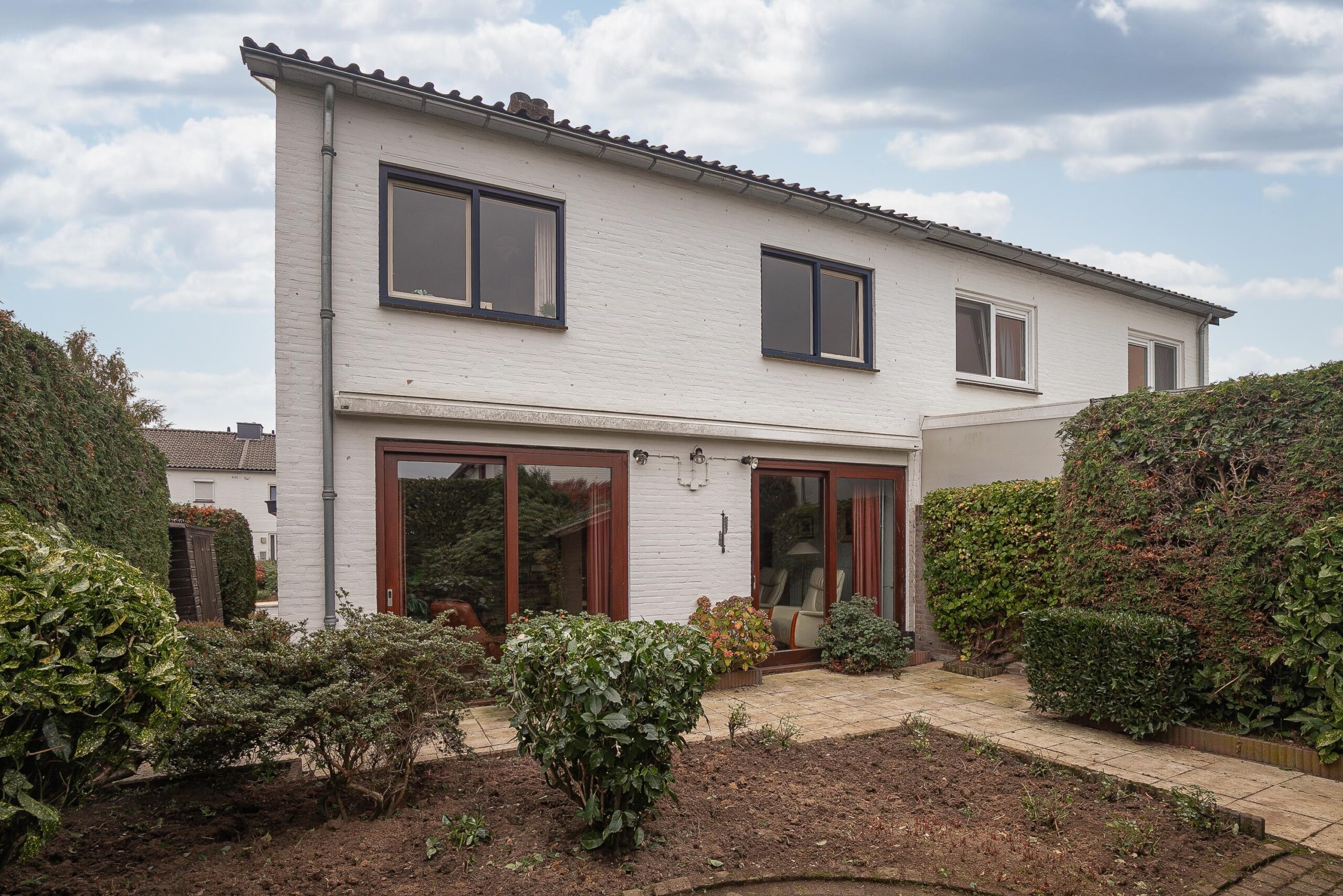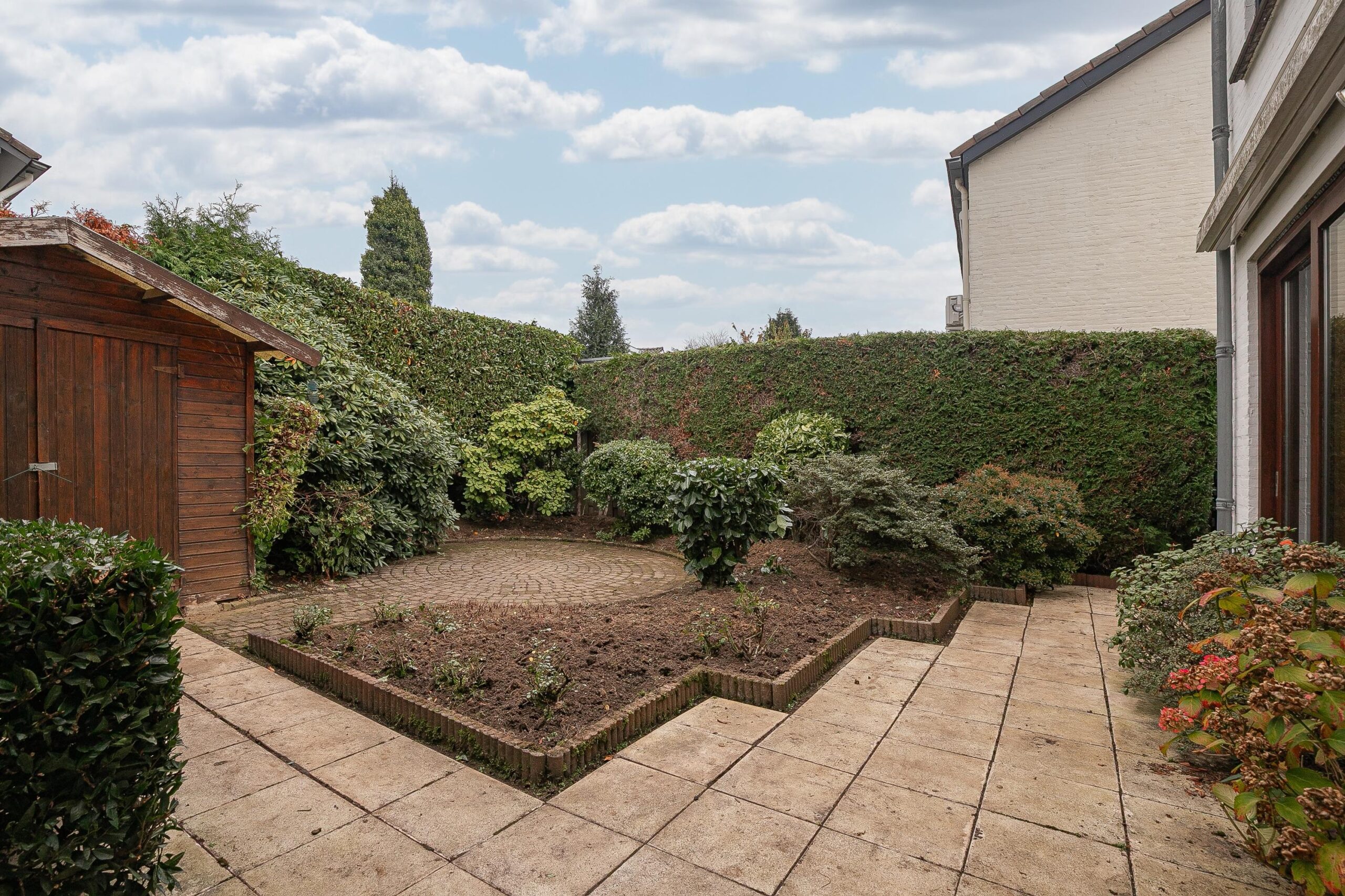 De achtertuin is aangelegd met veel groene beplanting en een terras met zitgedeelte. Achter in de tuin staat een houten tuinhuis voor extra bergruimte. De tuin is bereikbaar via een achterom, die tevens toegang biedt tot de oprit. Aan de zijkant van de woning bevindt zich een overdekte fietsenstalling en ruimte voor afvalcontainers. Op de oprit is plaats voor twee auto’s. De voortuin is voorzien van diverse beplanting en geeft de woning een groen en verzorgd aanzicht.