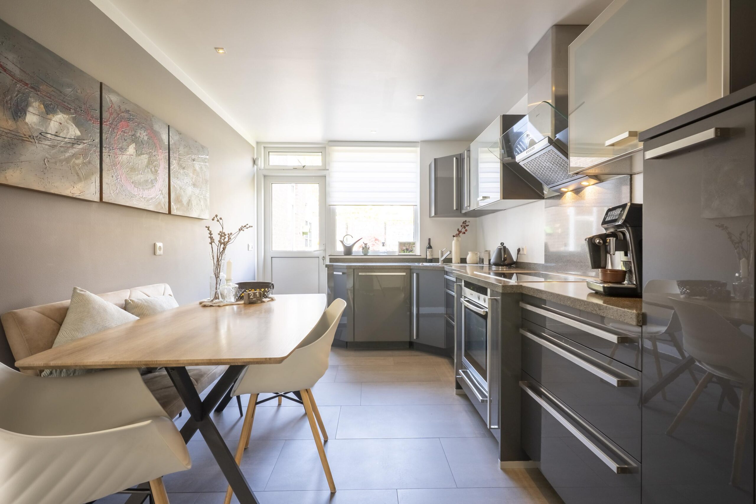 De gesloten keuken is eveneens sfeervol uitgevoerd en voorzien van ingebouwde ledverlichting, een moderne plavuizen vloer en een luxe hoogglans keukeninstallatie in L-opstelling met granieten werkblad. De keuken beschikt over de volgende apparatuur: koelkast, apothekerskast, keramische kookplaat, design-afzuigkap, vaatwasser en heteluchtoven.