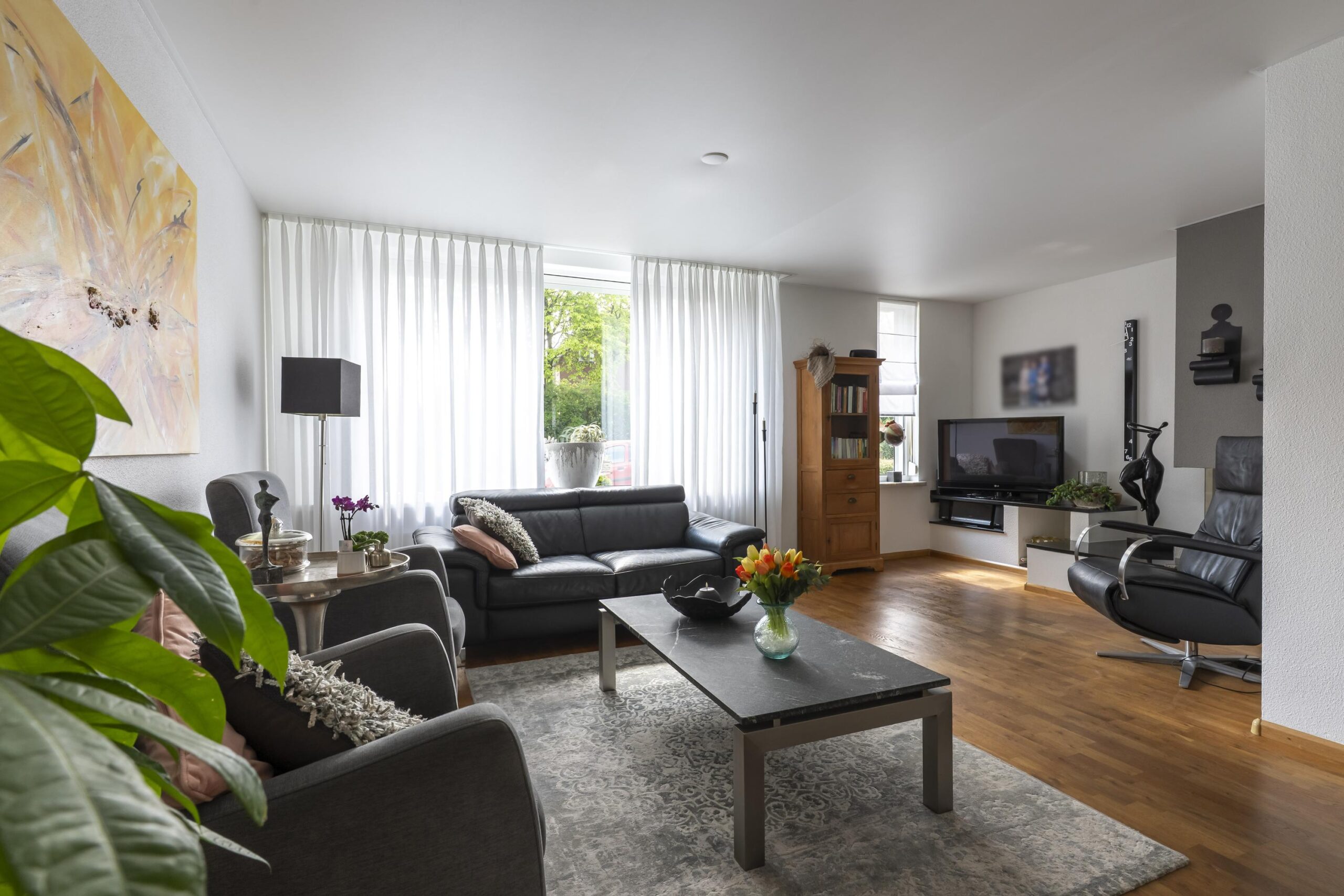 De sfeervolle L-vormige living is voorzien van een fraaie parketvloer, uitstekende lichtinval, gashaard, airconditioning, spanplafond en convectorput. Via dubbele openslaande deuren heeft u toegang tot het overdekte terras.