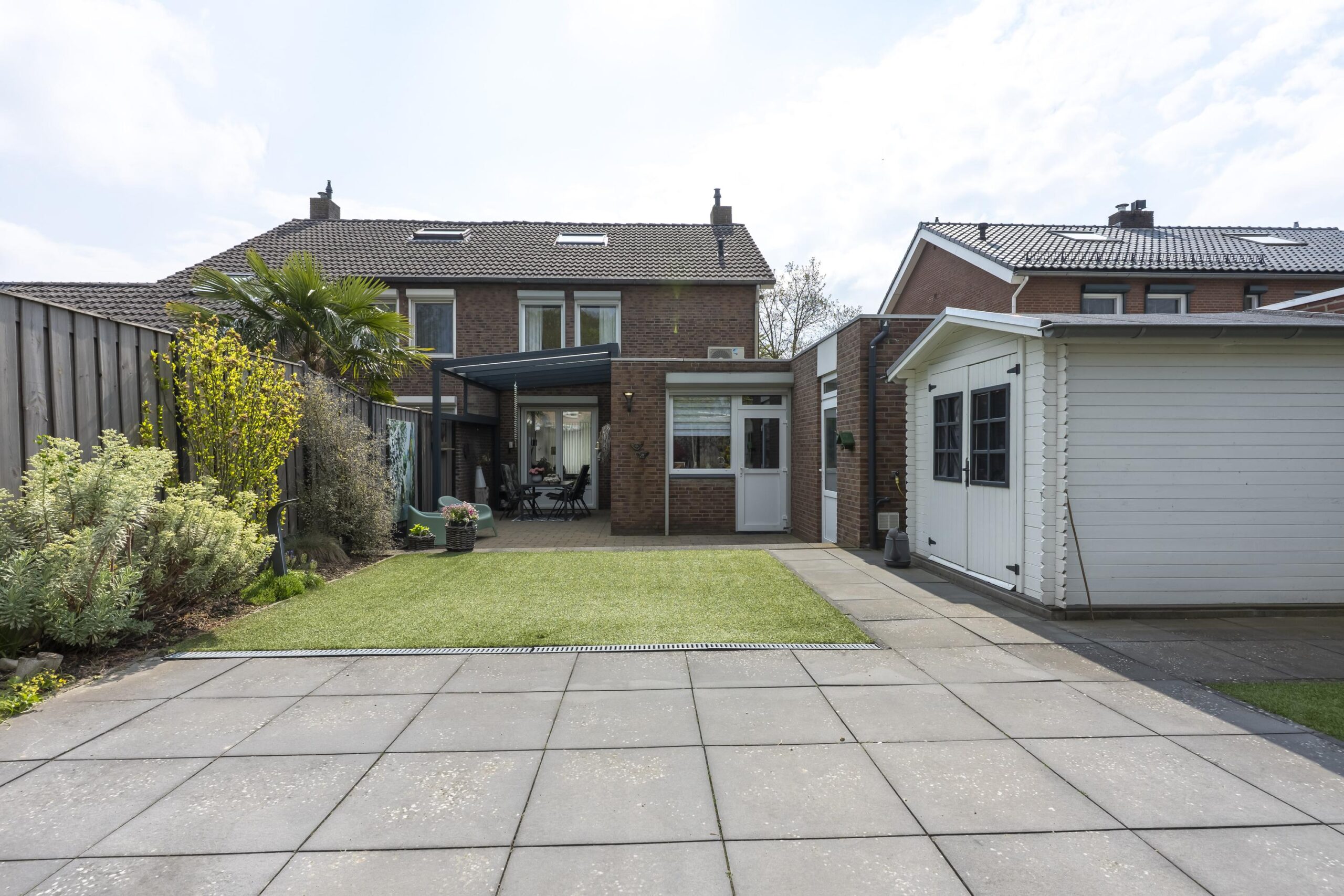 Via de woonkamer, keuken en garage bereikt u de omsloten, zonnige en fraai aangelegde tuin met diverse terrassen, een tuinhuis, veel privacy en een aluminium terrasoverkapping met ingebouwde ledverlichting.
