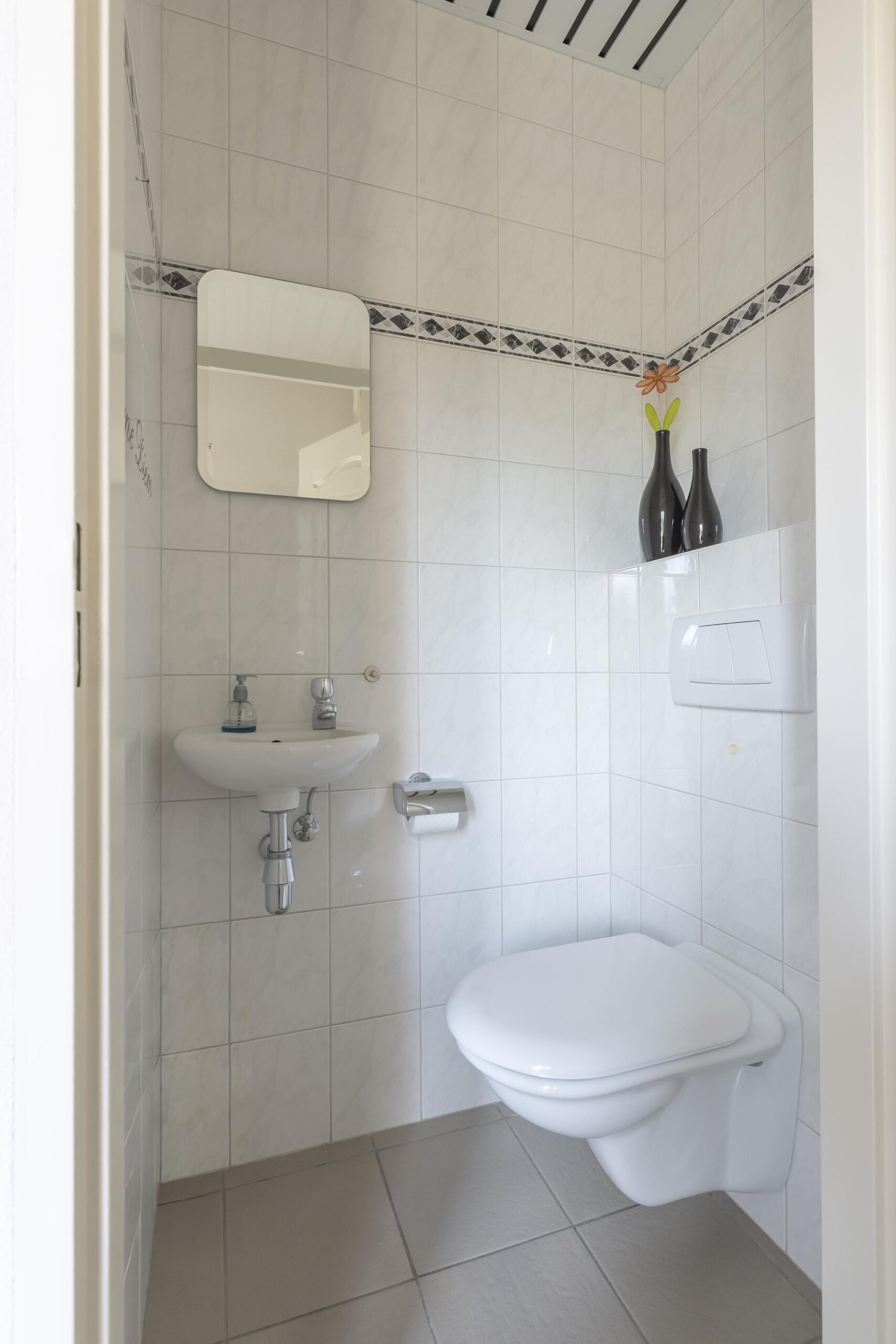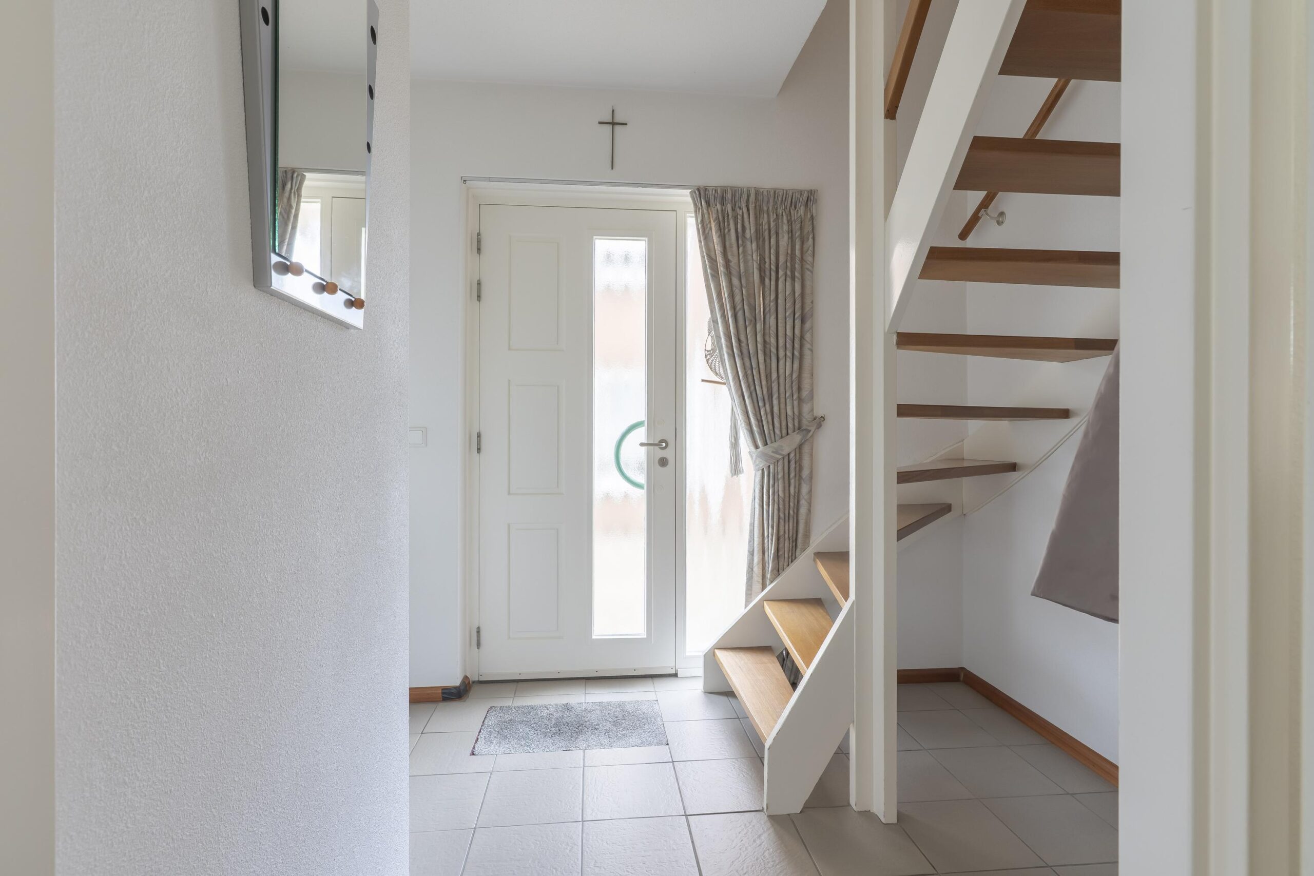 Via de ruime oprit bereikt u de entreehal, voorzien van een moderne plavuizen vloer en een open trap naar de verdieping. Hier bevindt zich tevens het geheel betegelde, vrij hangende toilet met fontein.